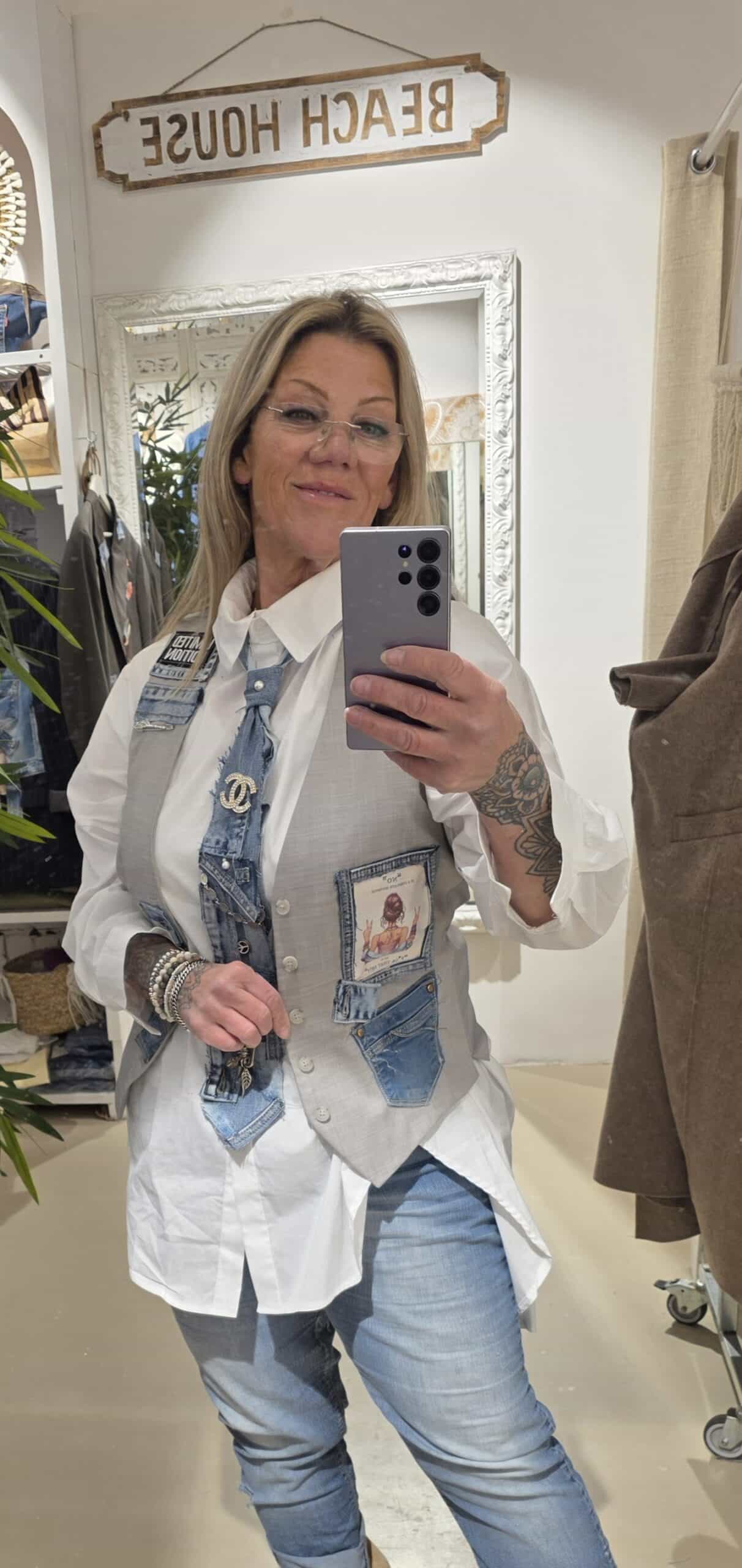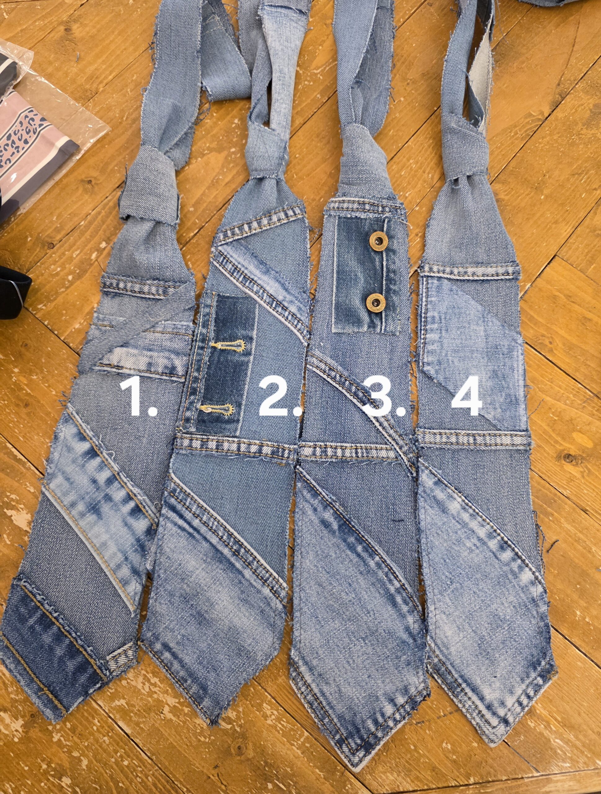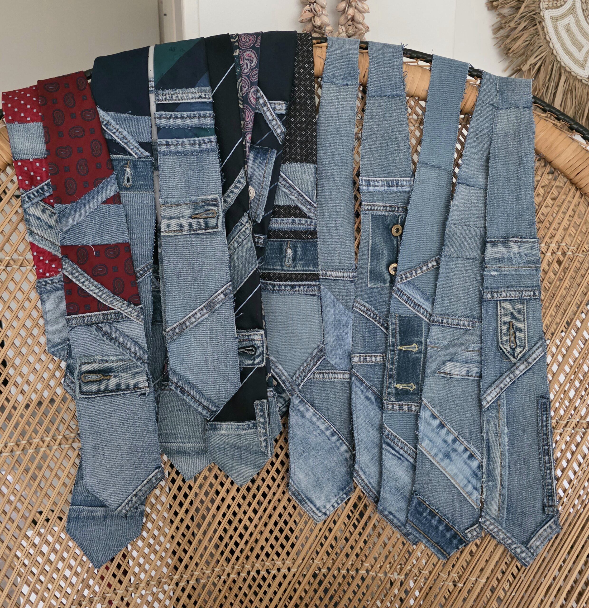 Handgemaakte denim stropdassen, ze zijn onafgewerkte voor een stoer effect, én het leukste is als je er allerlei broches op doet, kettinkjes, alles mag!