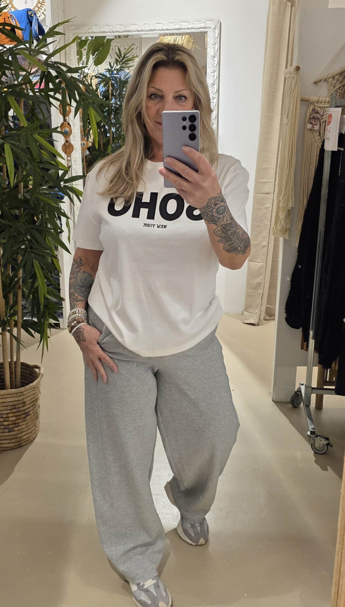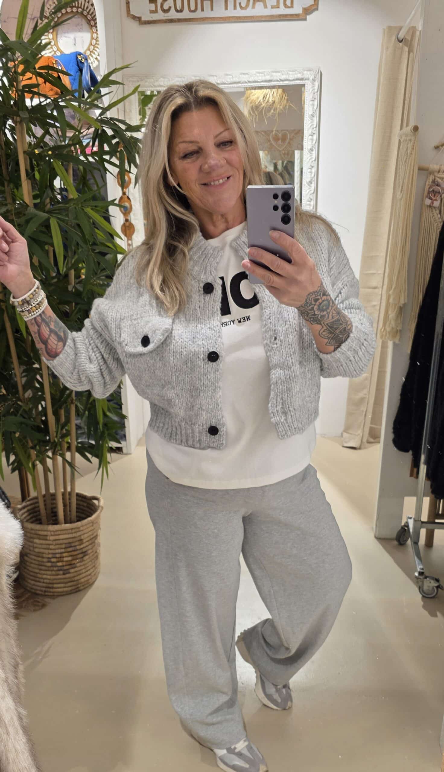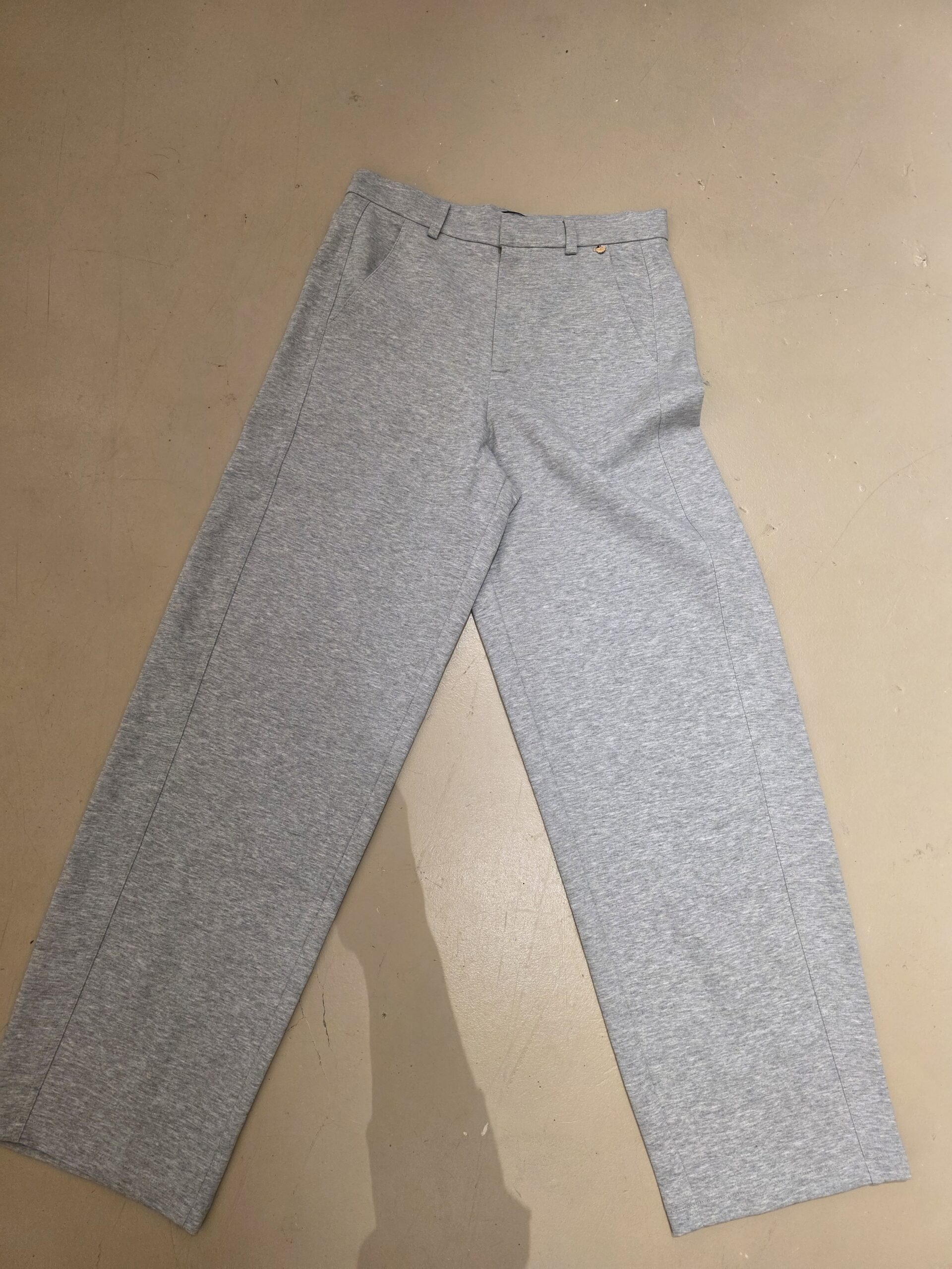 Mooie grijze mêlee broek in een soort comfy joggingstof met tailleband, zit erg fijn, mooie lange lengte, zakken, rits, gewoon een topbroek! valt iets ruimer!