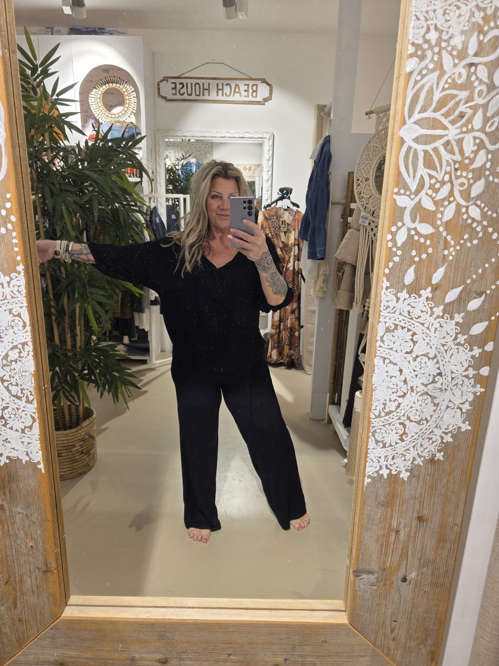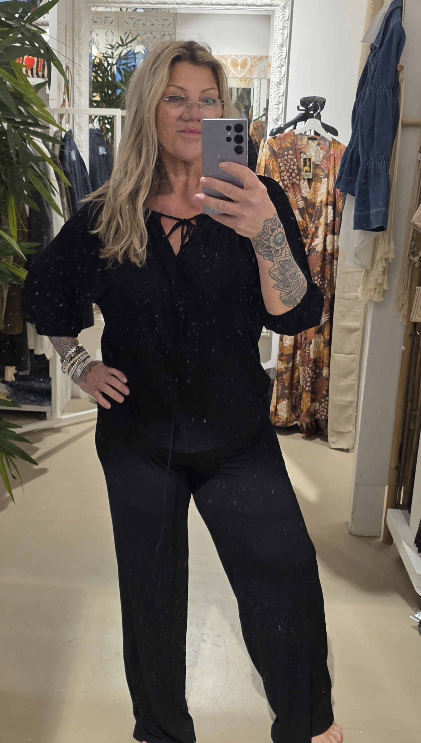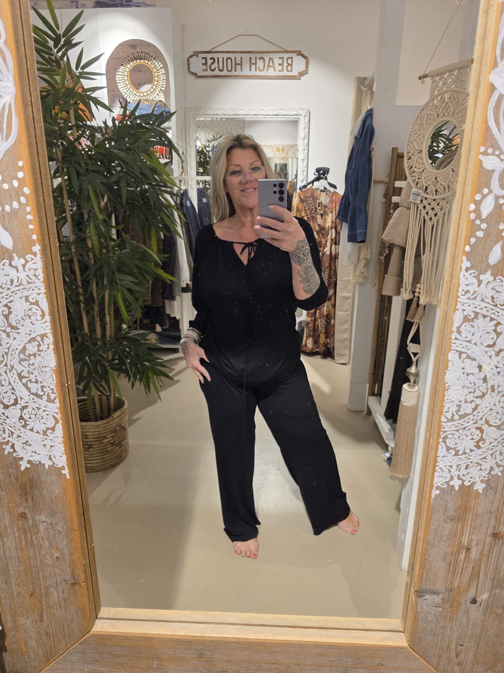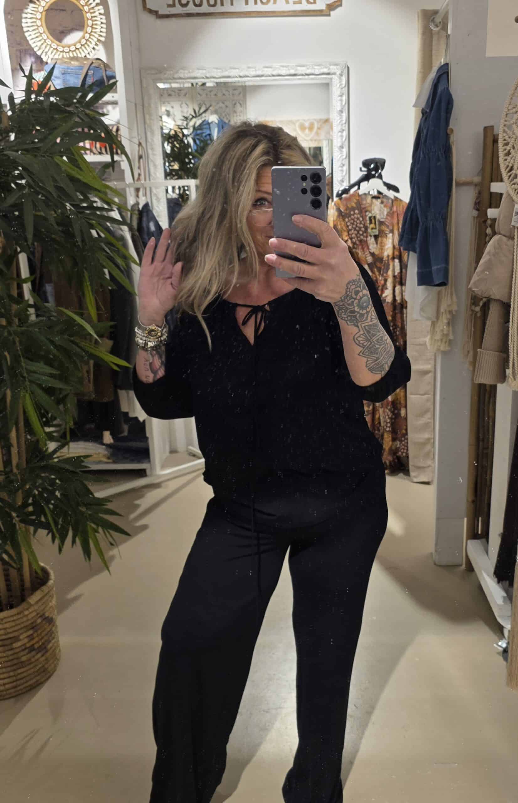 Van het mooie Nederlandse merk Bindi, bindi staat bekend om z’n mooie natuurlijke materialen, én trendy modellen.dit is de lange broek met geheel taille band die je om kunt slaan, je kunt hem dus ooknop de heup dragen, prachtige kwaliteit in het zwart