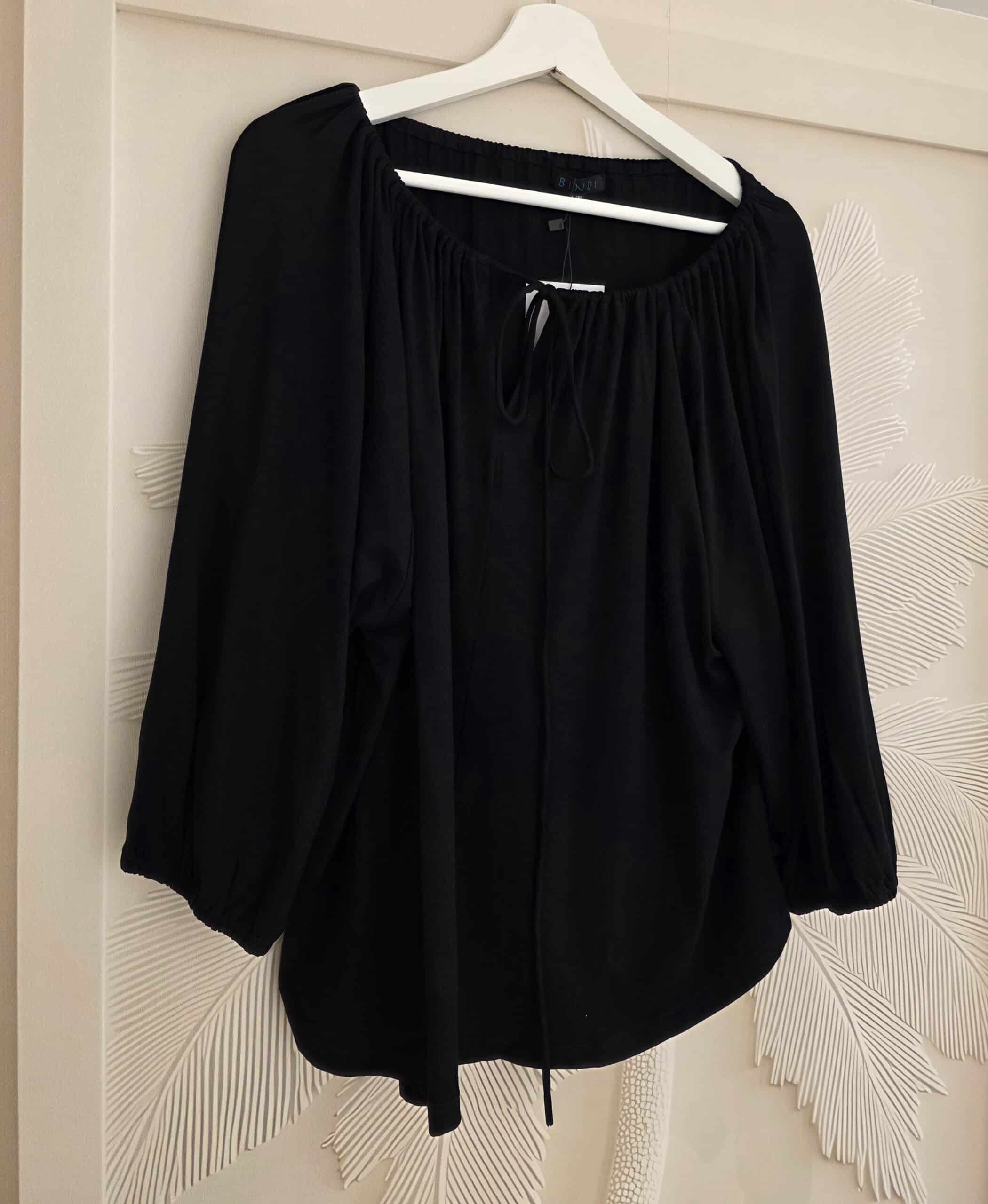 Deze stof is een natuurlijke jersey, blijft mooi draagt heerlijk, dit is de top met kortere mouw en koordje bij de hals, kan ook goed off shoulder gedragen worden.