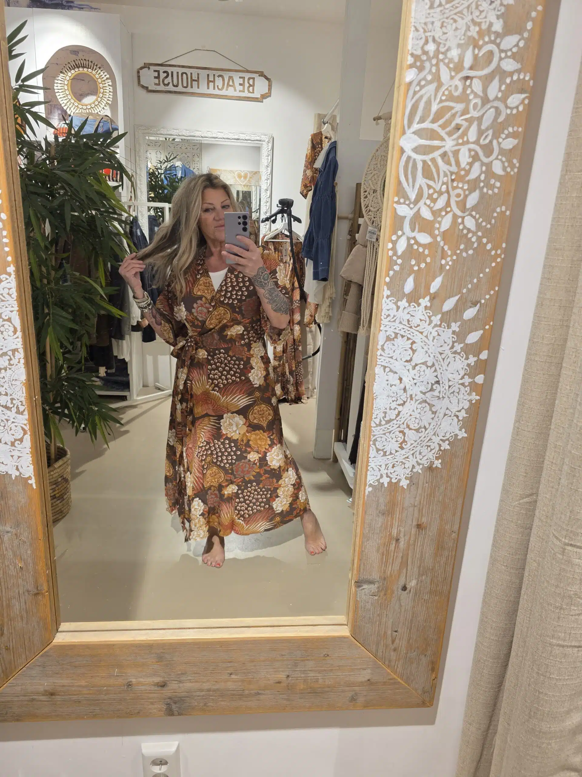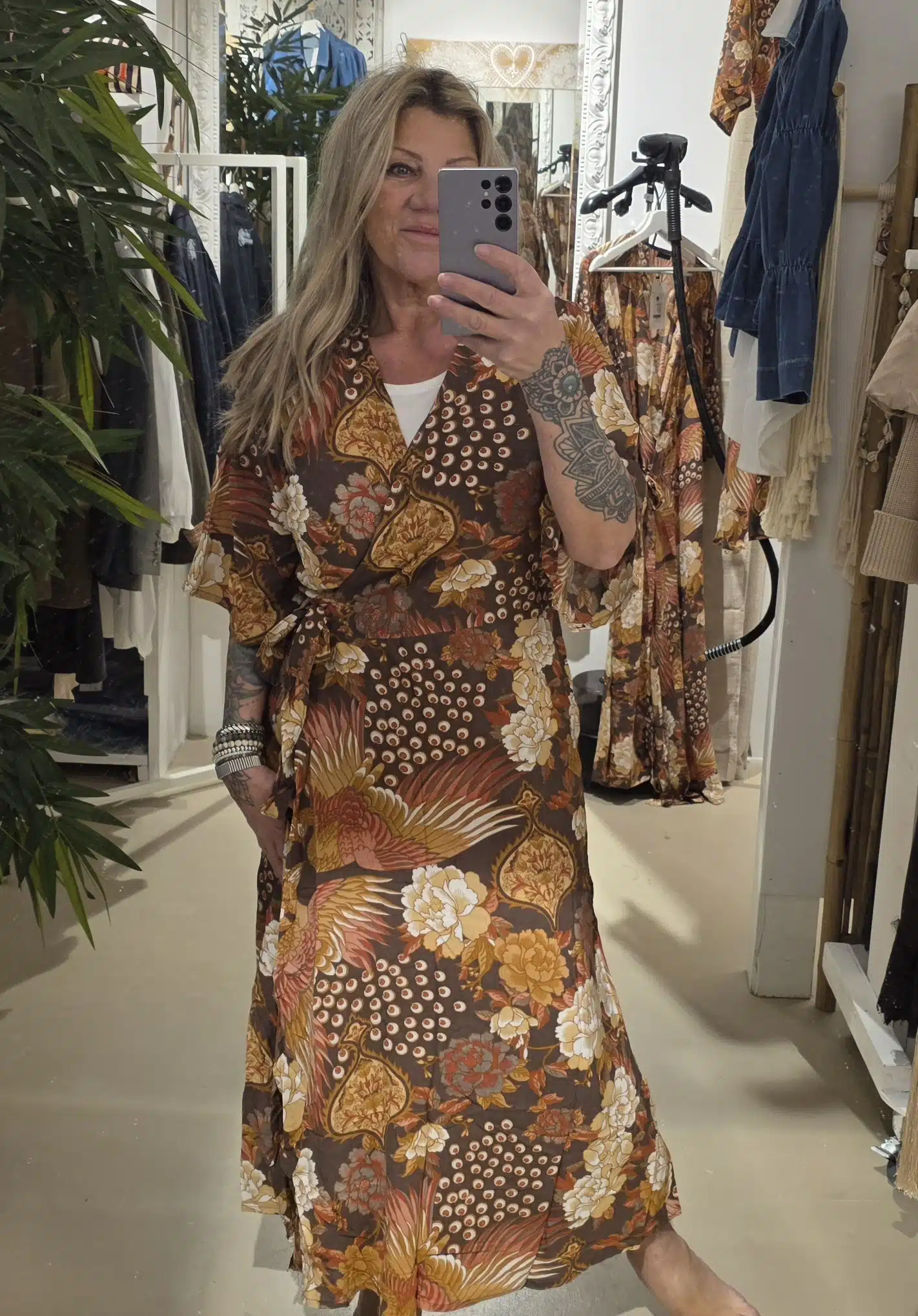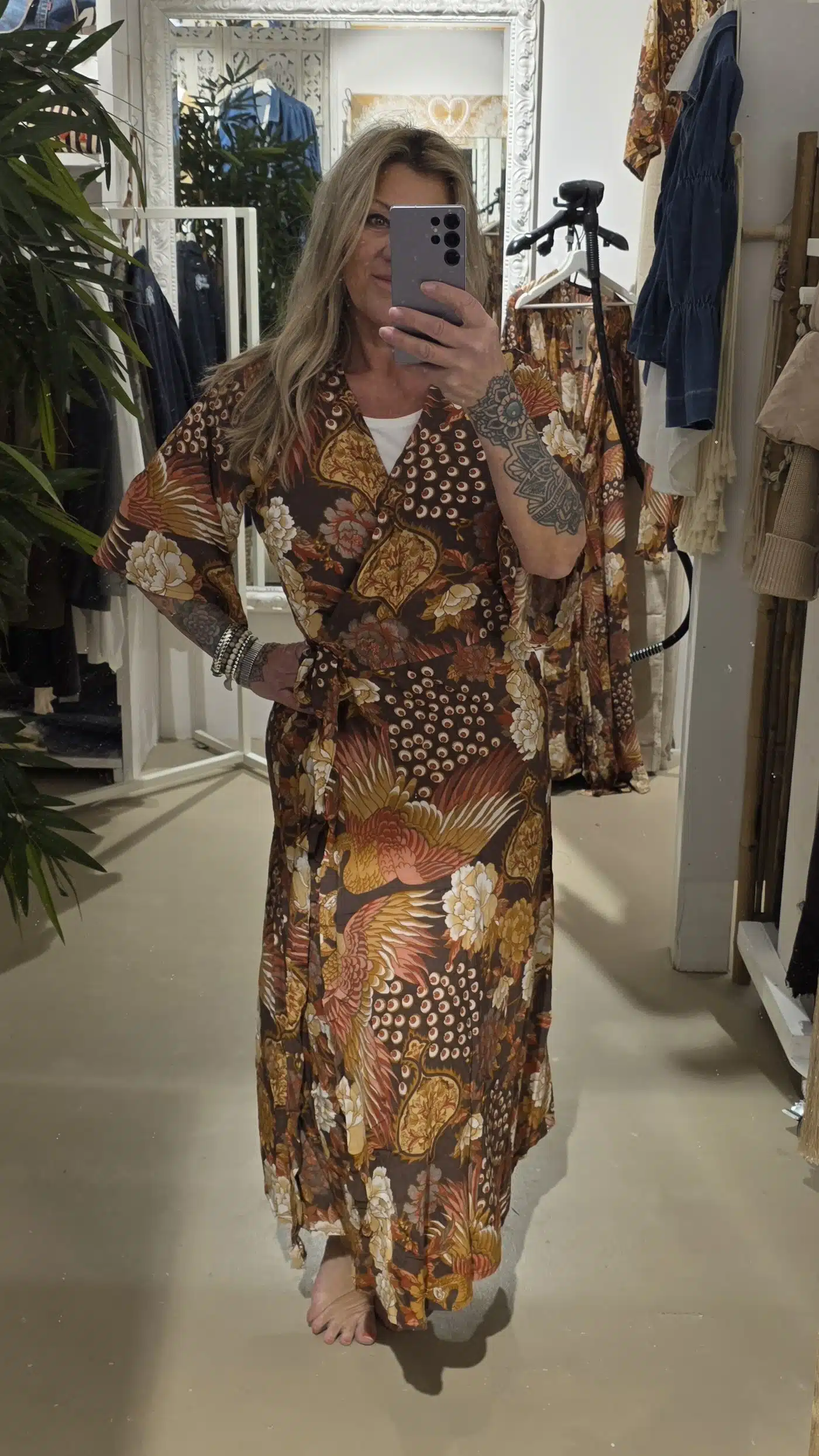 Dit is de wikkel jurk in deze geweldige nieuwe print van Bindi, kort mouwtje en wikkel model, je kunt hem ook vóór knopen als een soort kimono jurk.