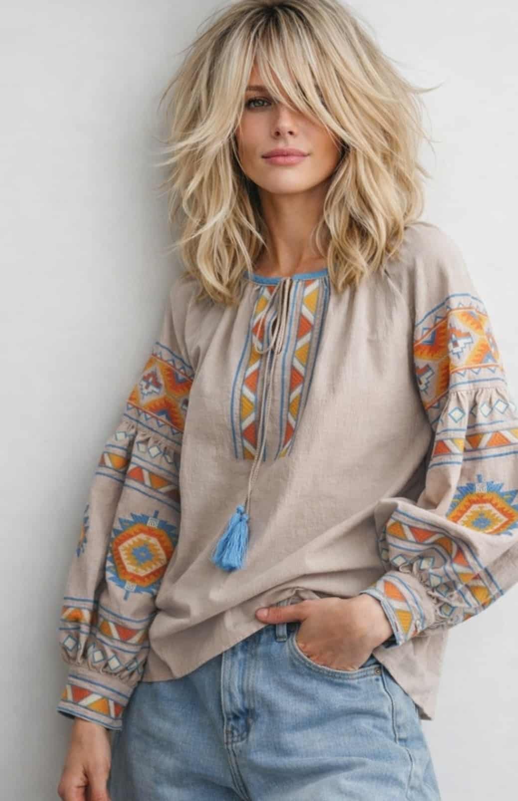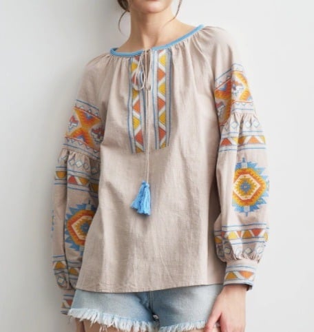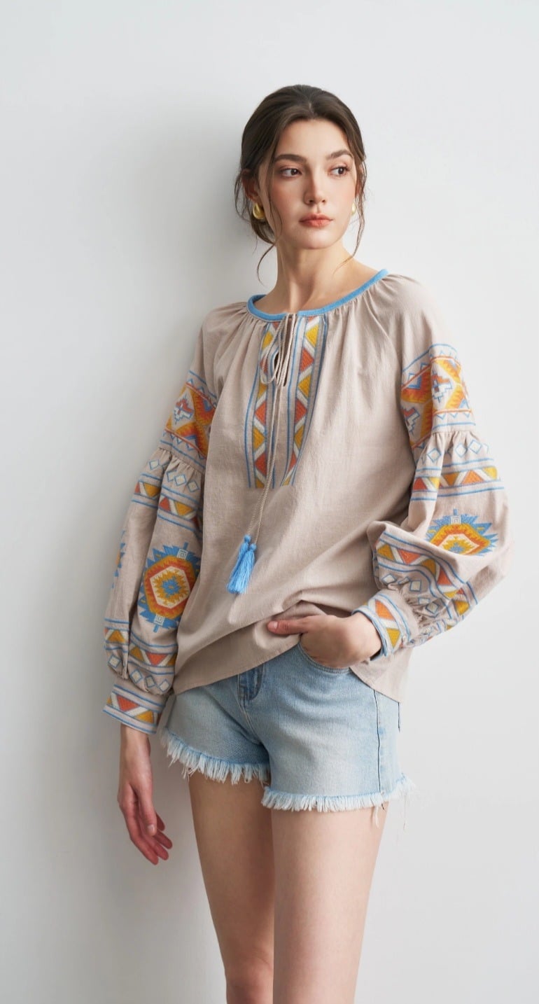 Wat een beauty, mooie ballon mouw, geborduurd met prachtige kleuren, mooie hals met koordje, geheel natuurlijk materiaal.