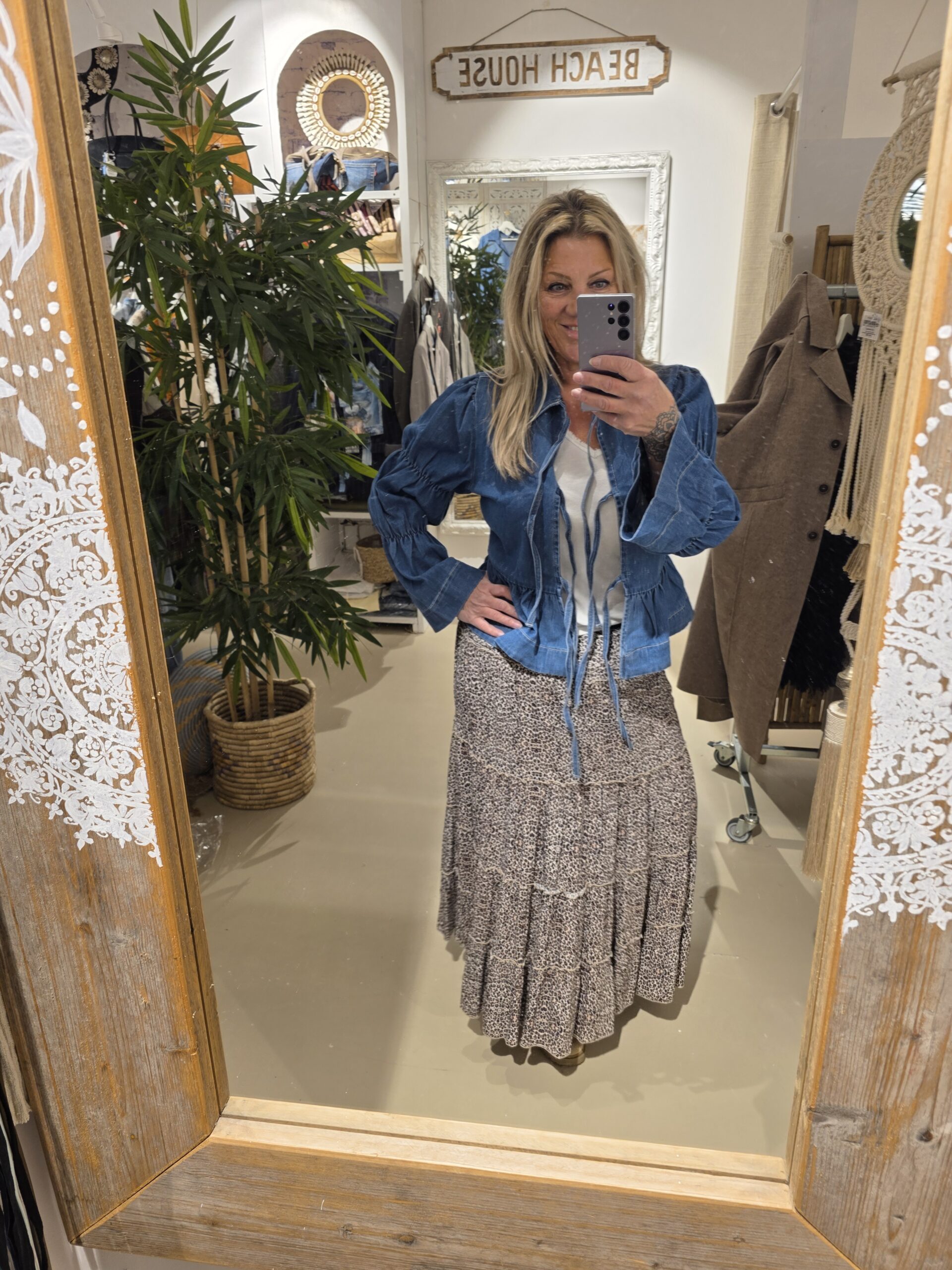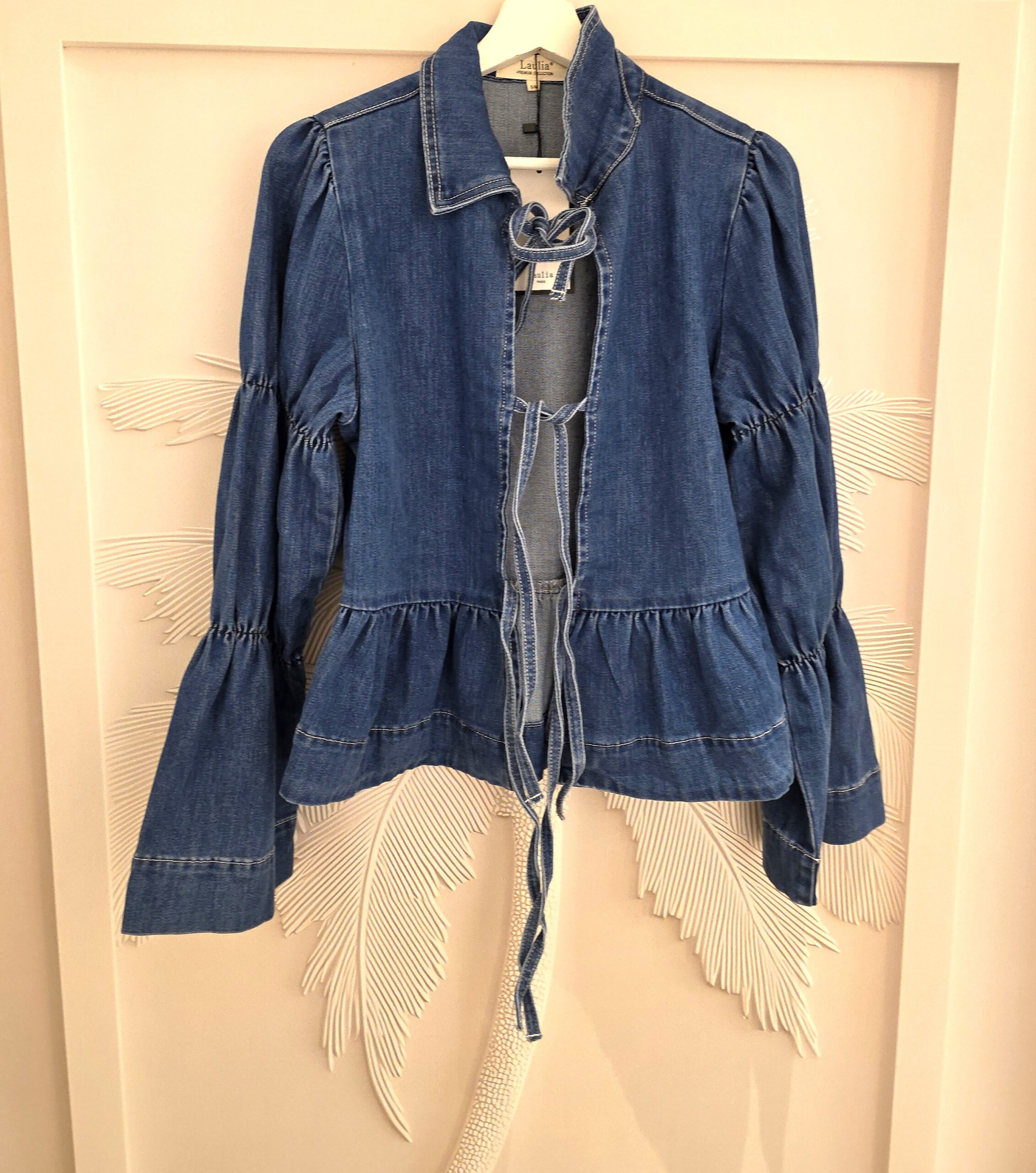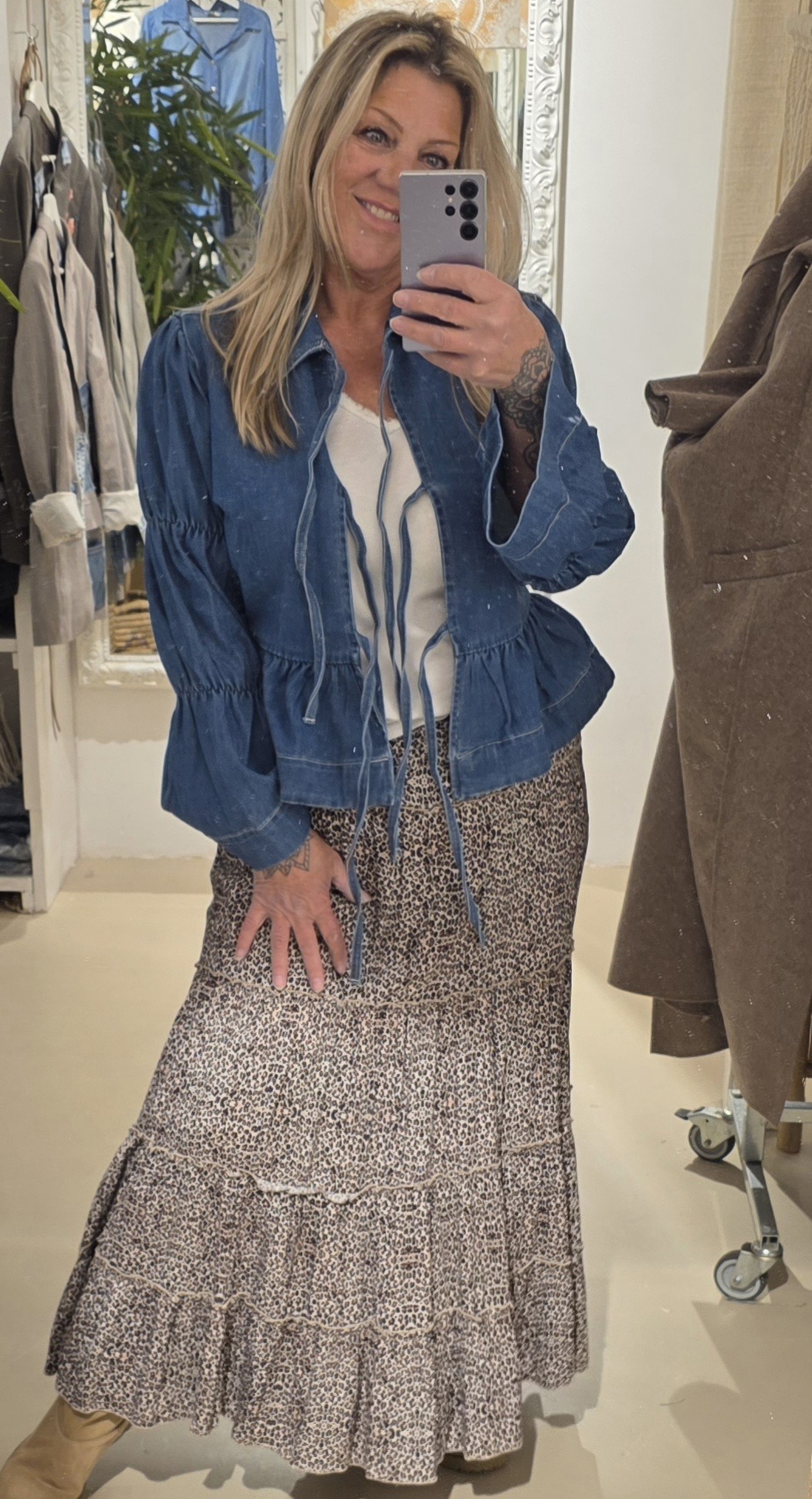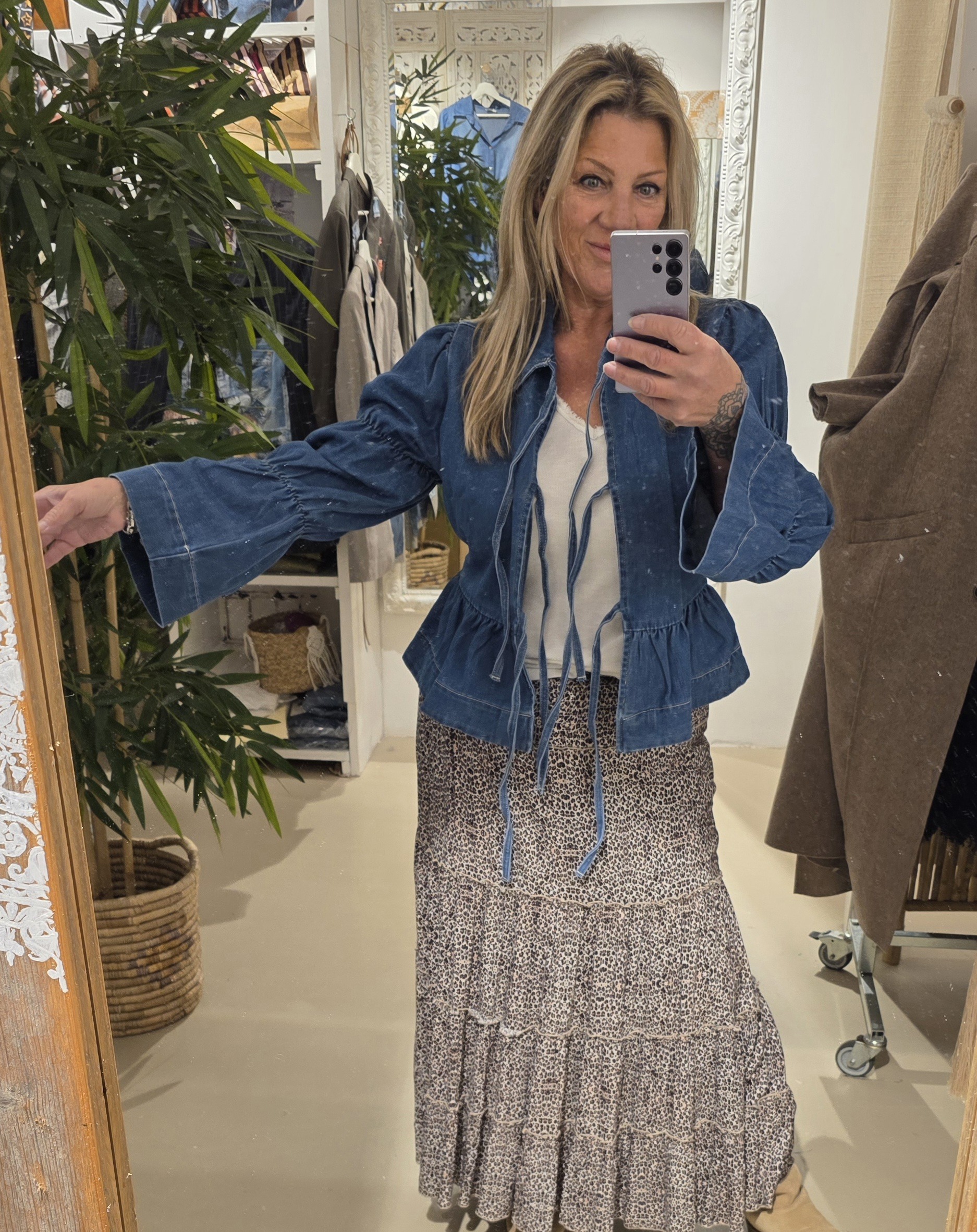 Wat een leukerd, deze denim blouse, sluitingen zijn koordjes in jeans stof, aparte mouwen, en een schootje onder aan de blouse, trendy en vrouwelijk
