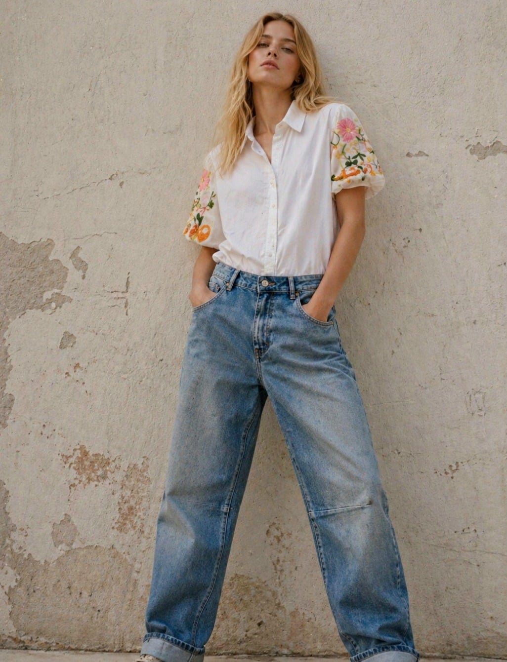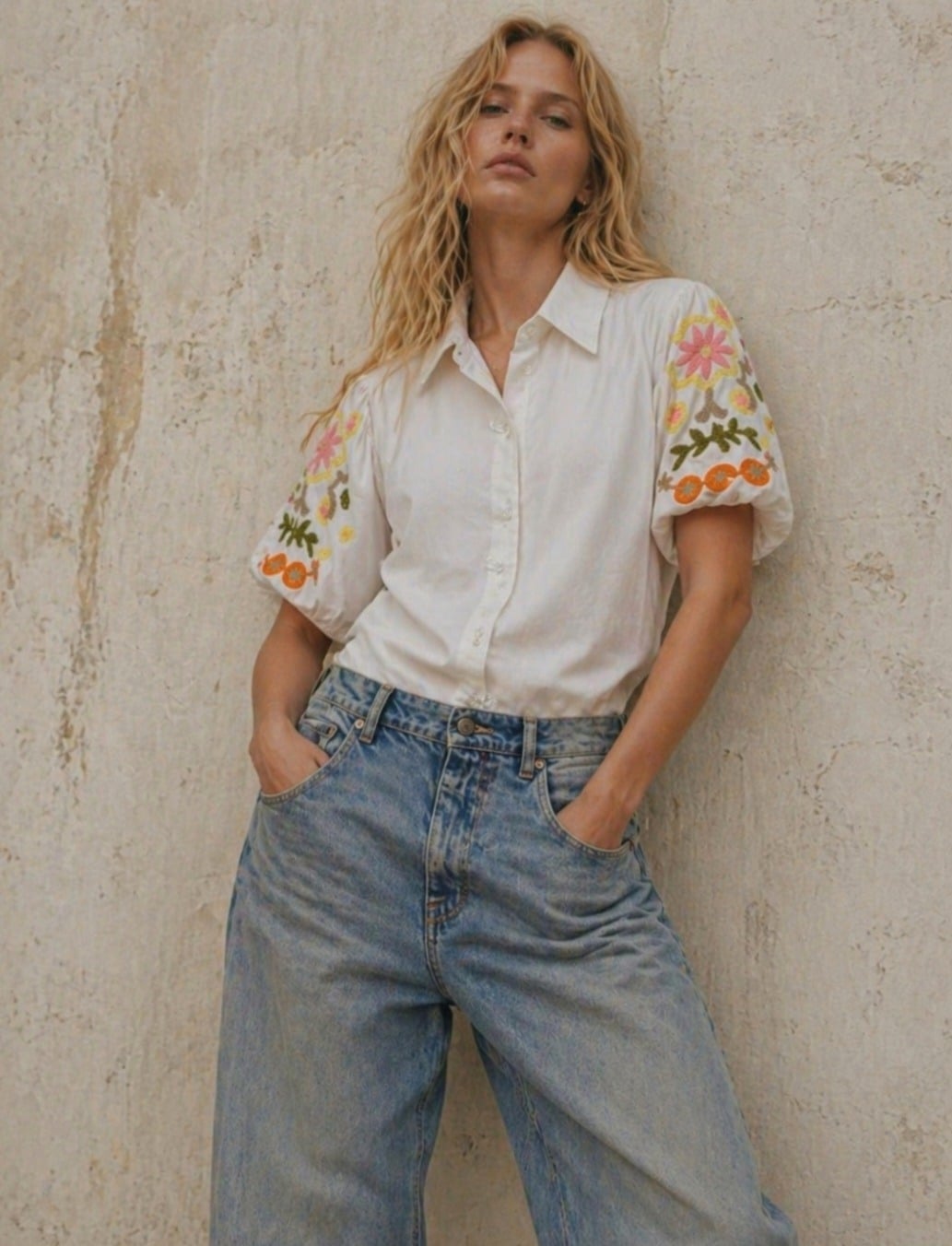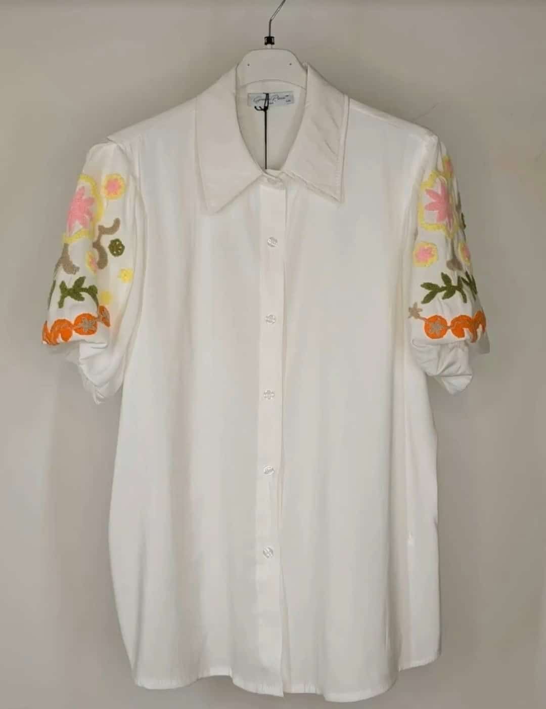 Leuke ruim vallende blouse met pofmouwtjes, afgewerkt met geborduurde bloemen op de mouw, geheel natuurlijk materiaal in het wit.