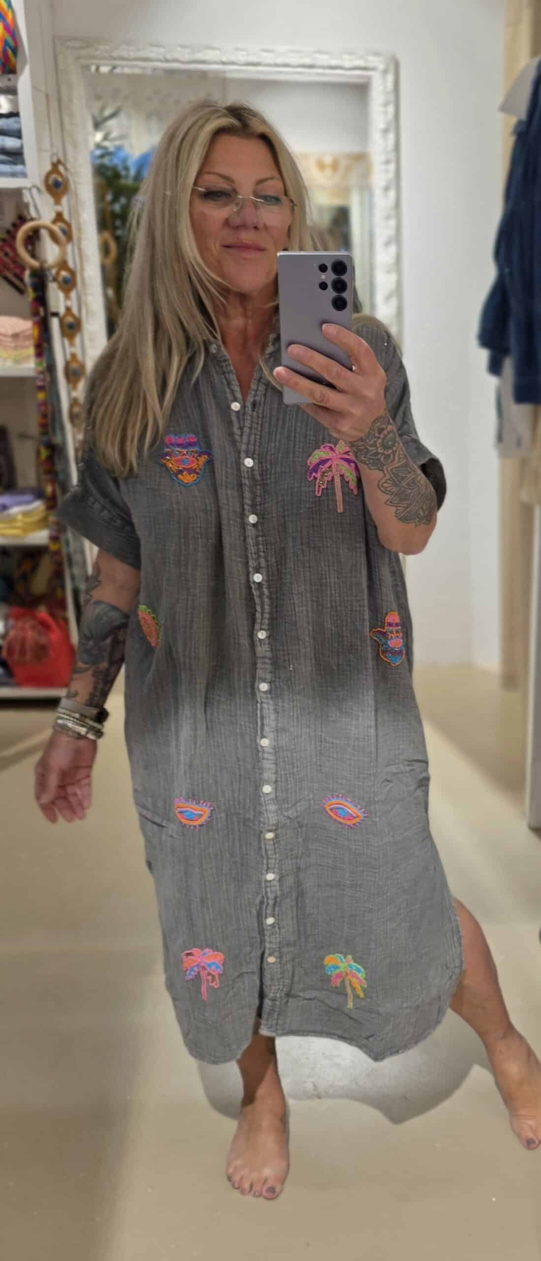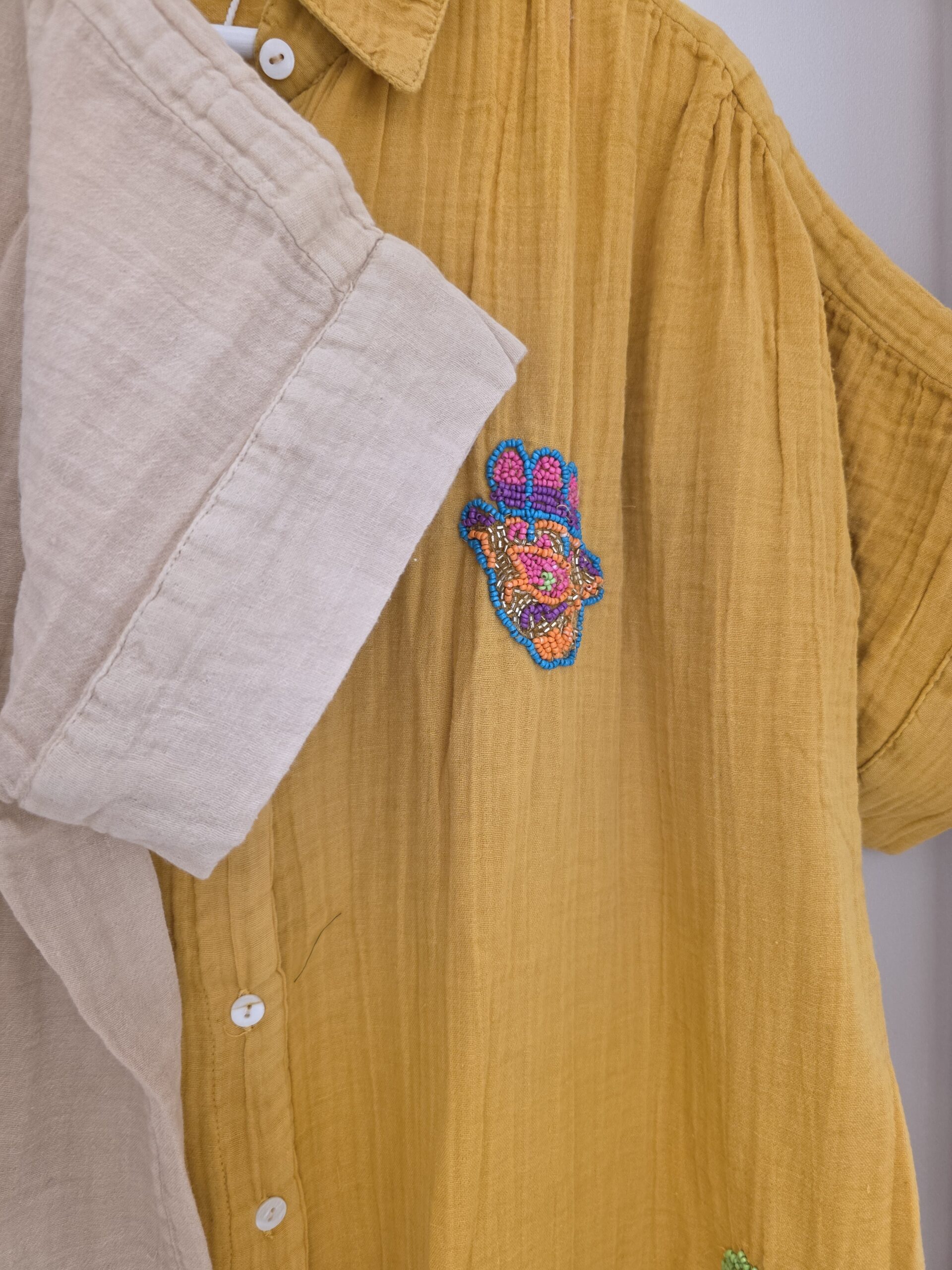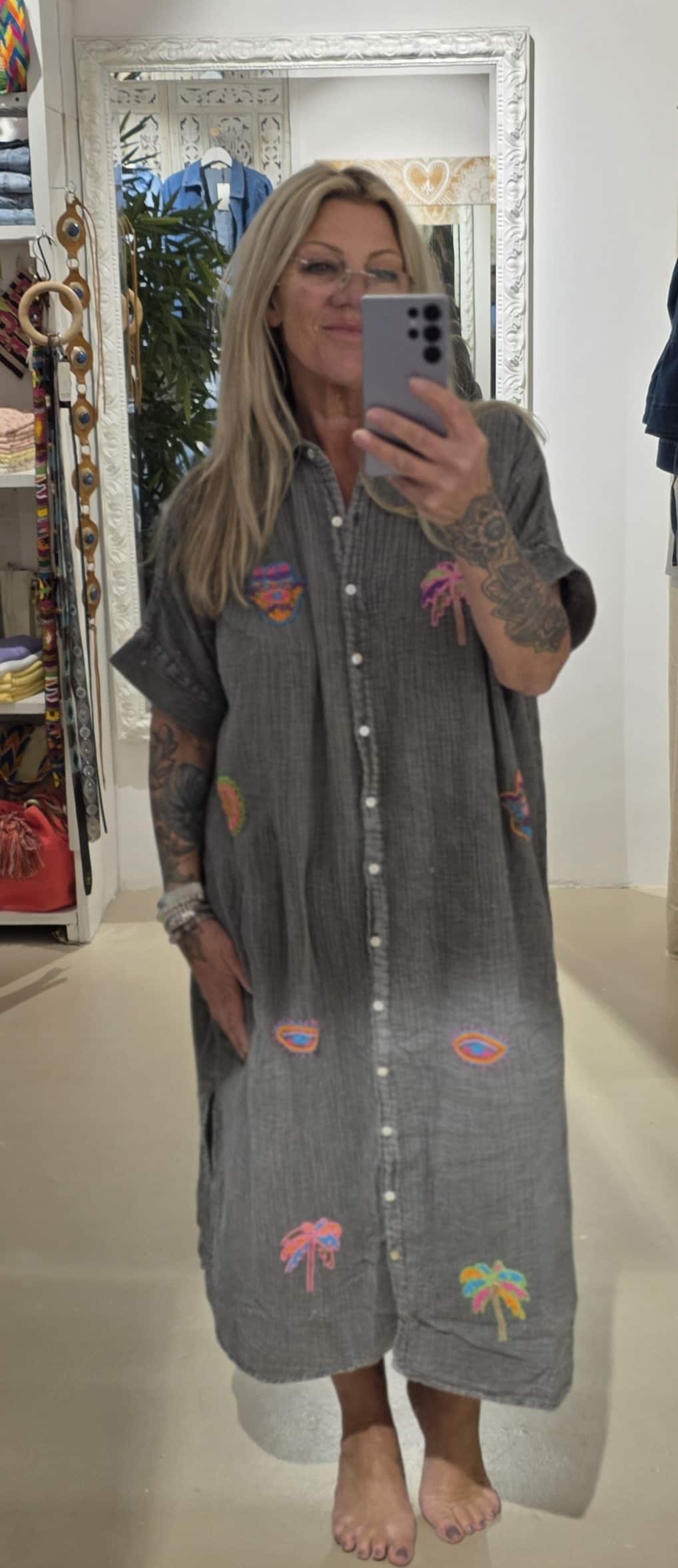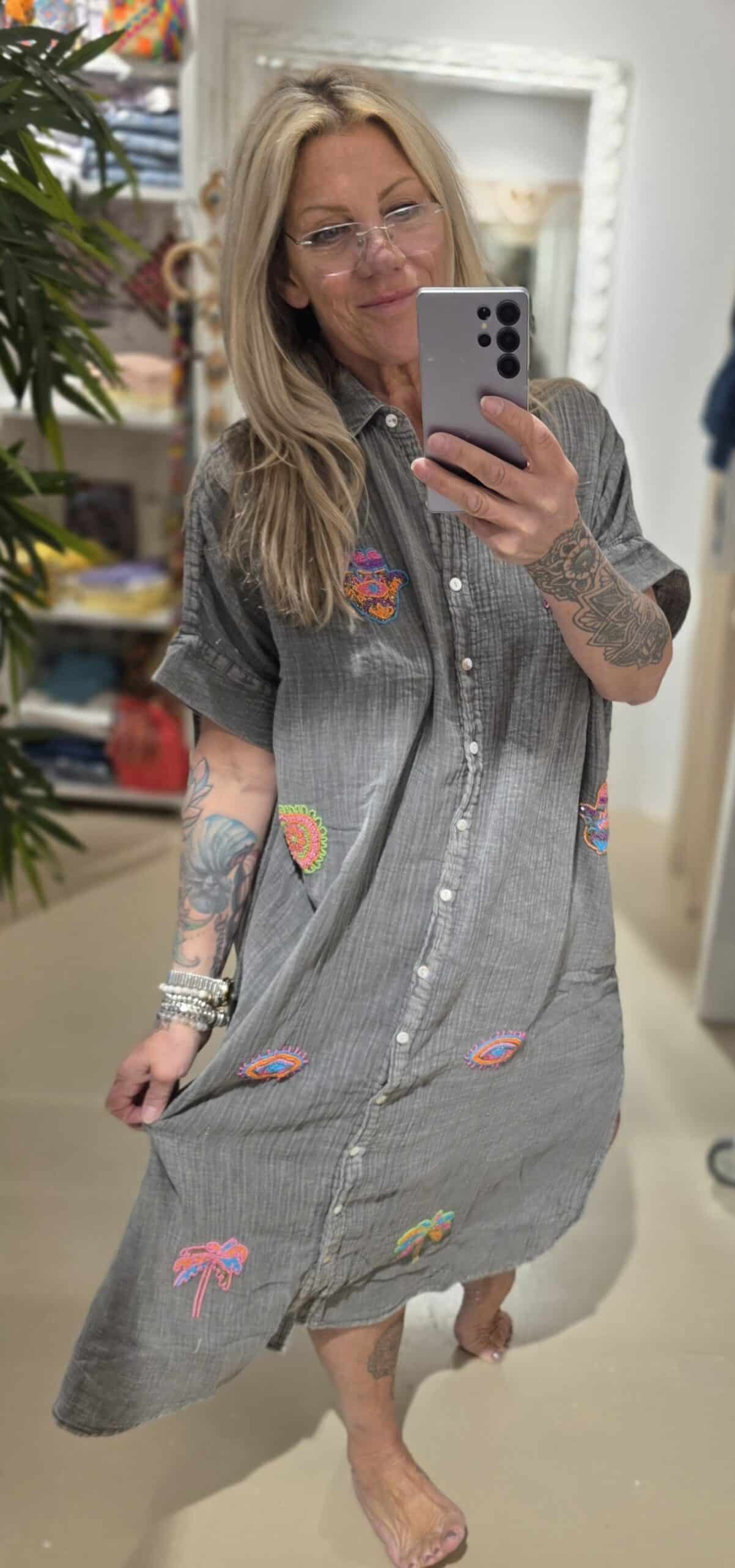 Van natuurlijk materiaal deze mooie soepele blouse jurk, één maat, valt ruim, stonewashed effect met geborduurde kraaltjes.
