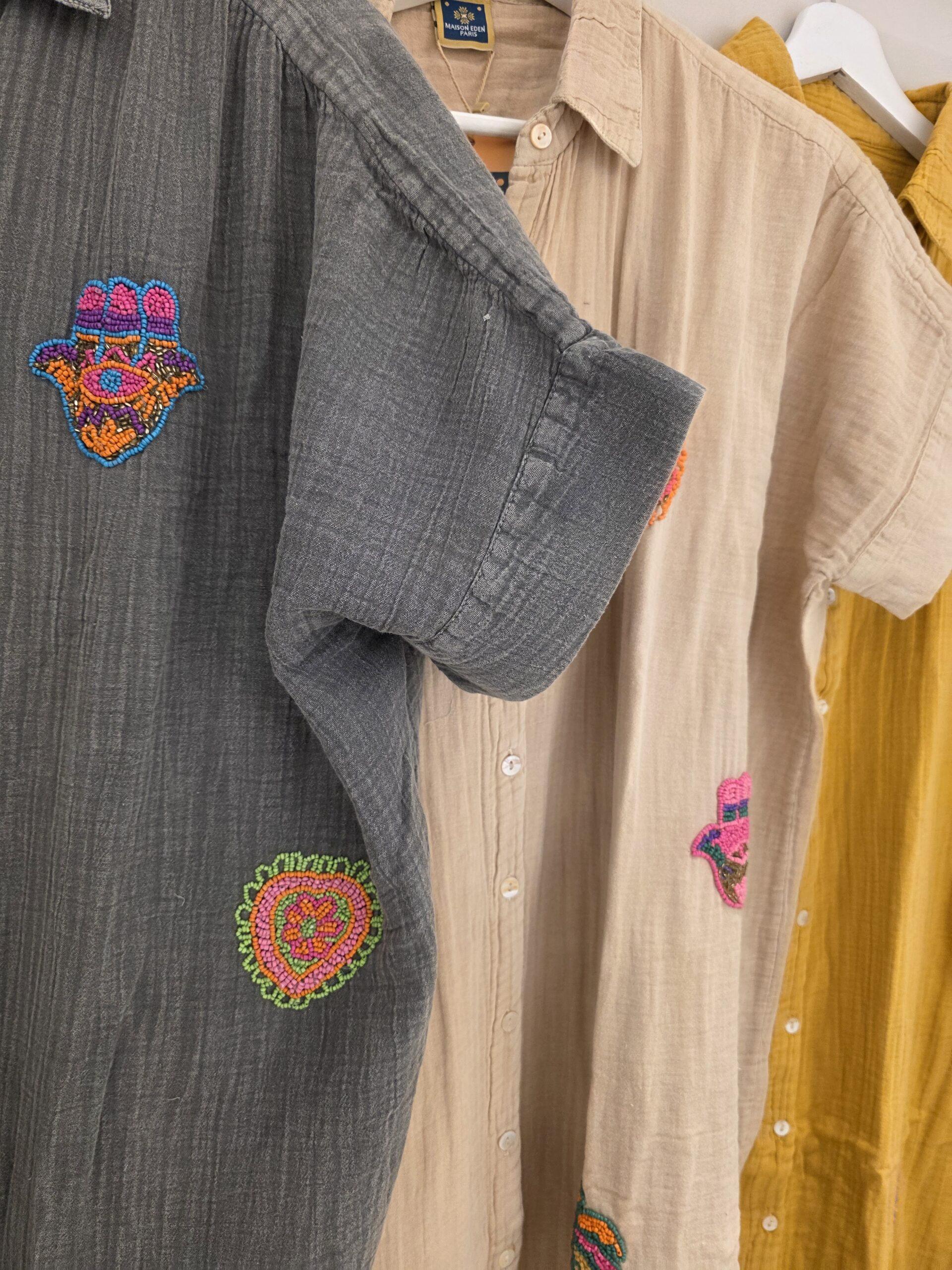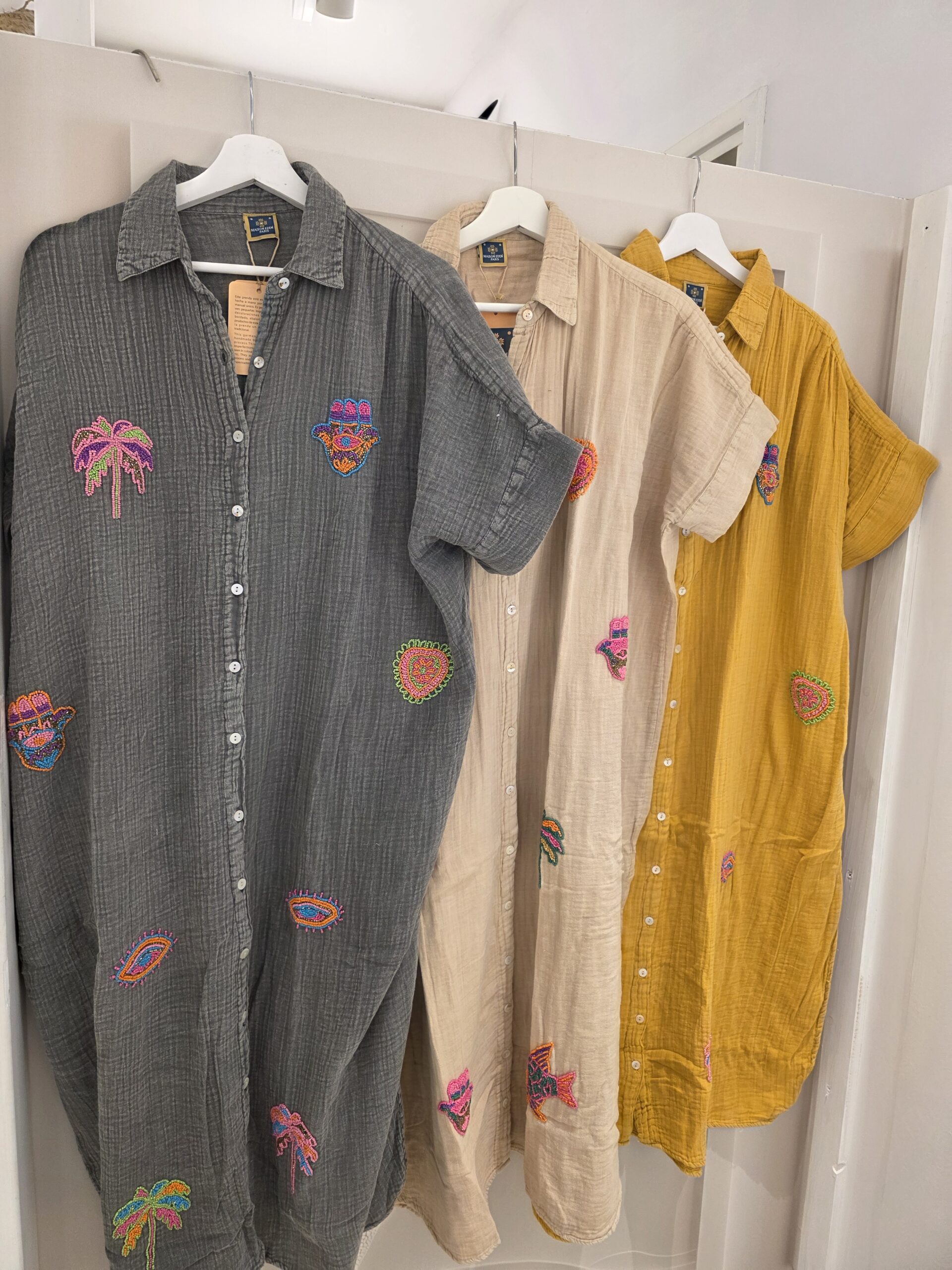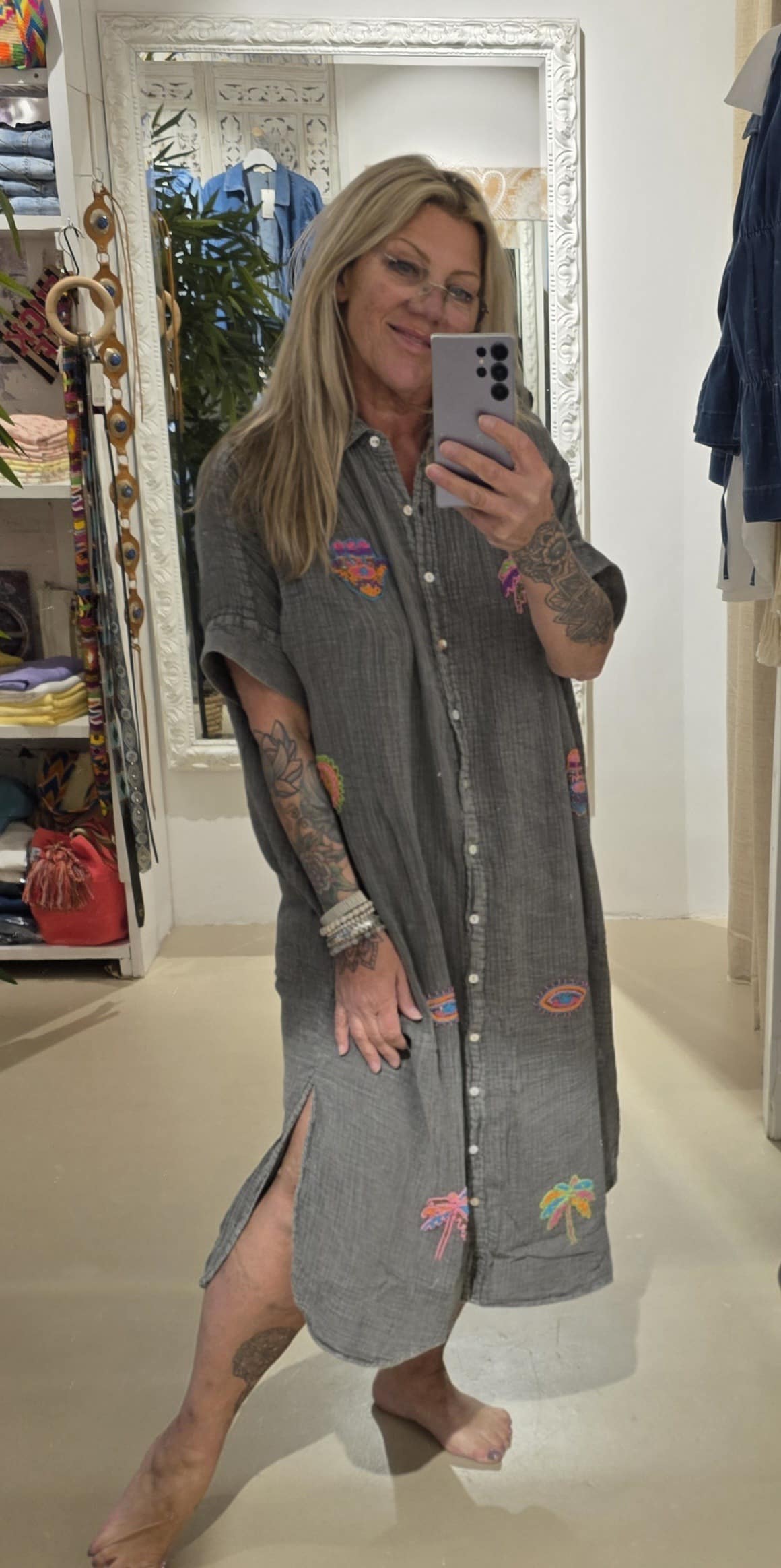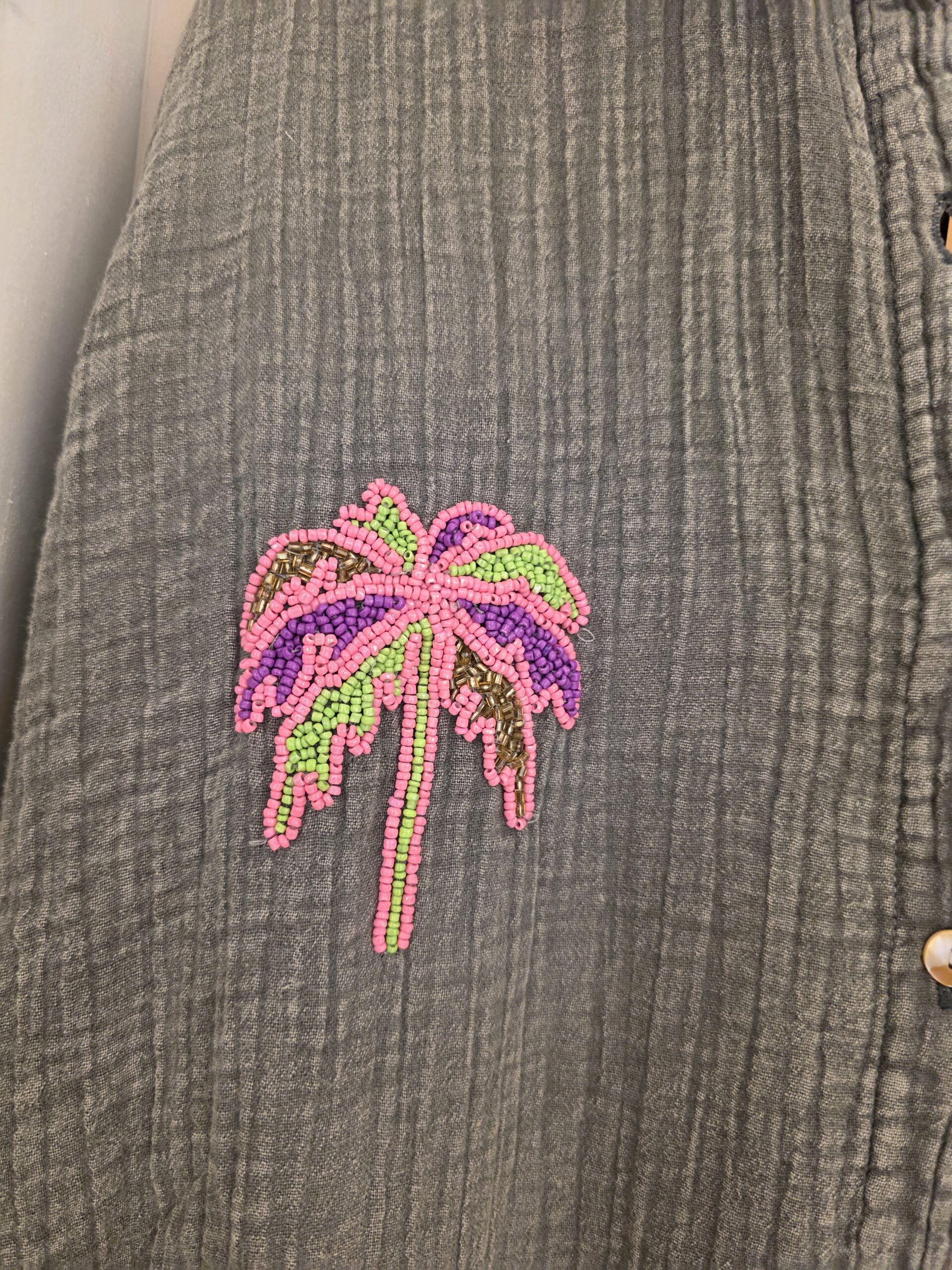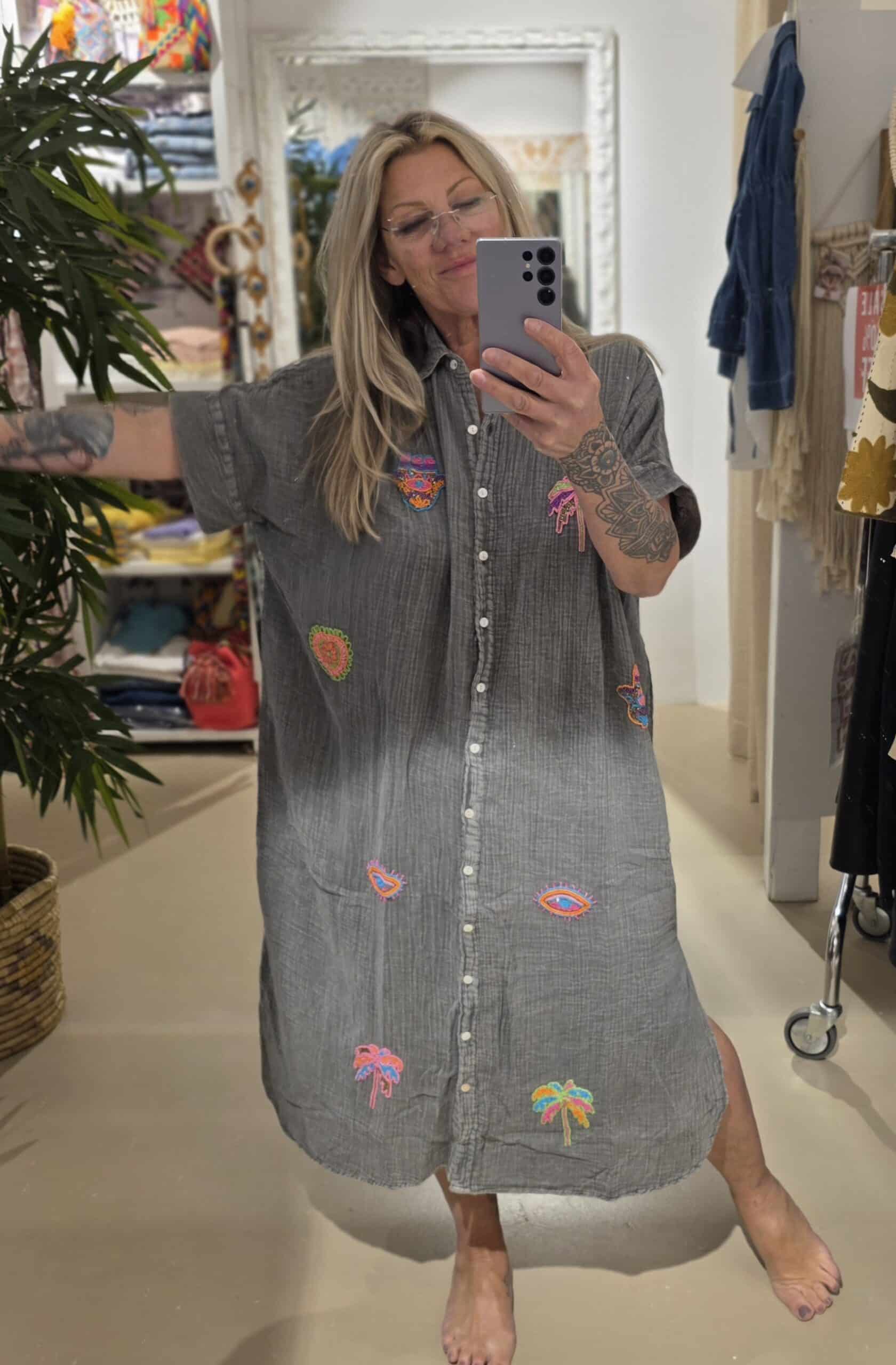 Van natuurlijk materiaal deze mooie soepele blouse jurk, één maat, valt ruim, stonewashed effect met geborduurde kraaltjes.