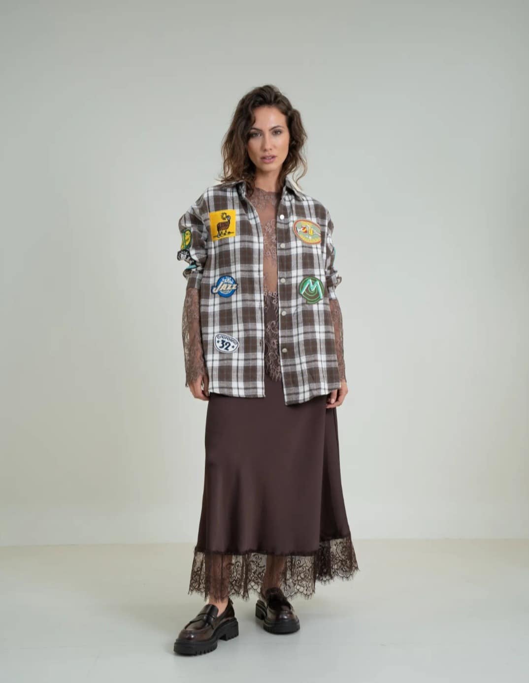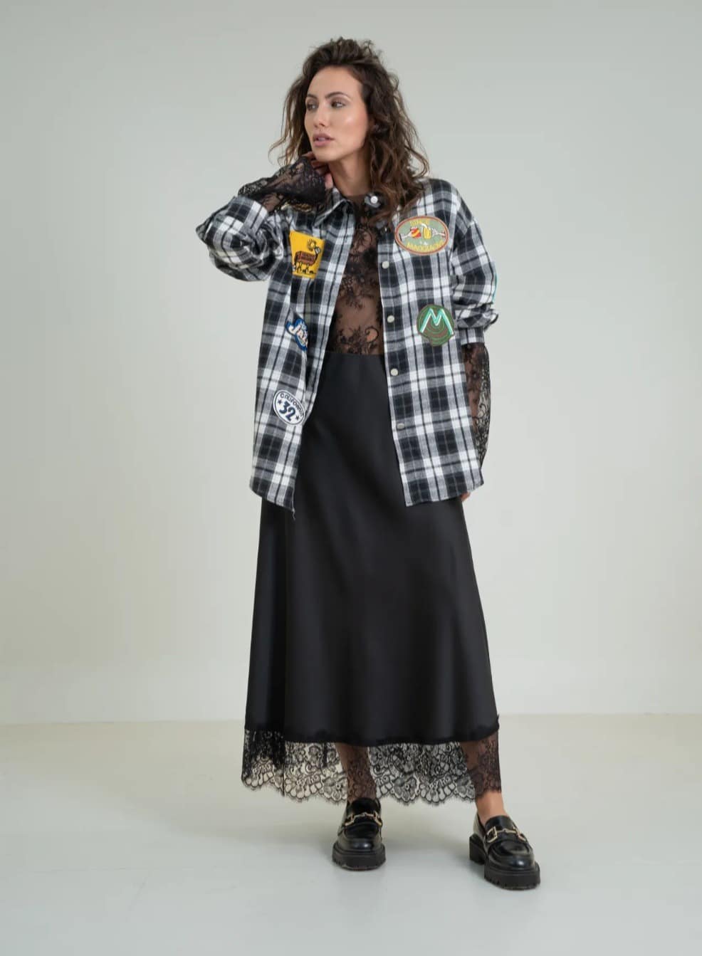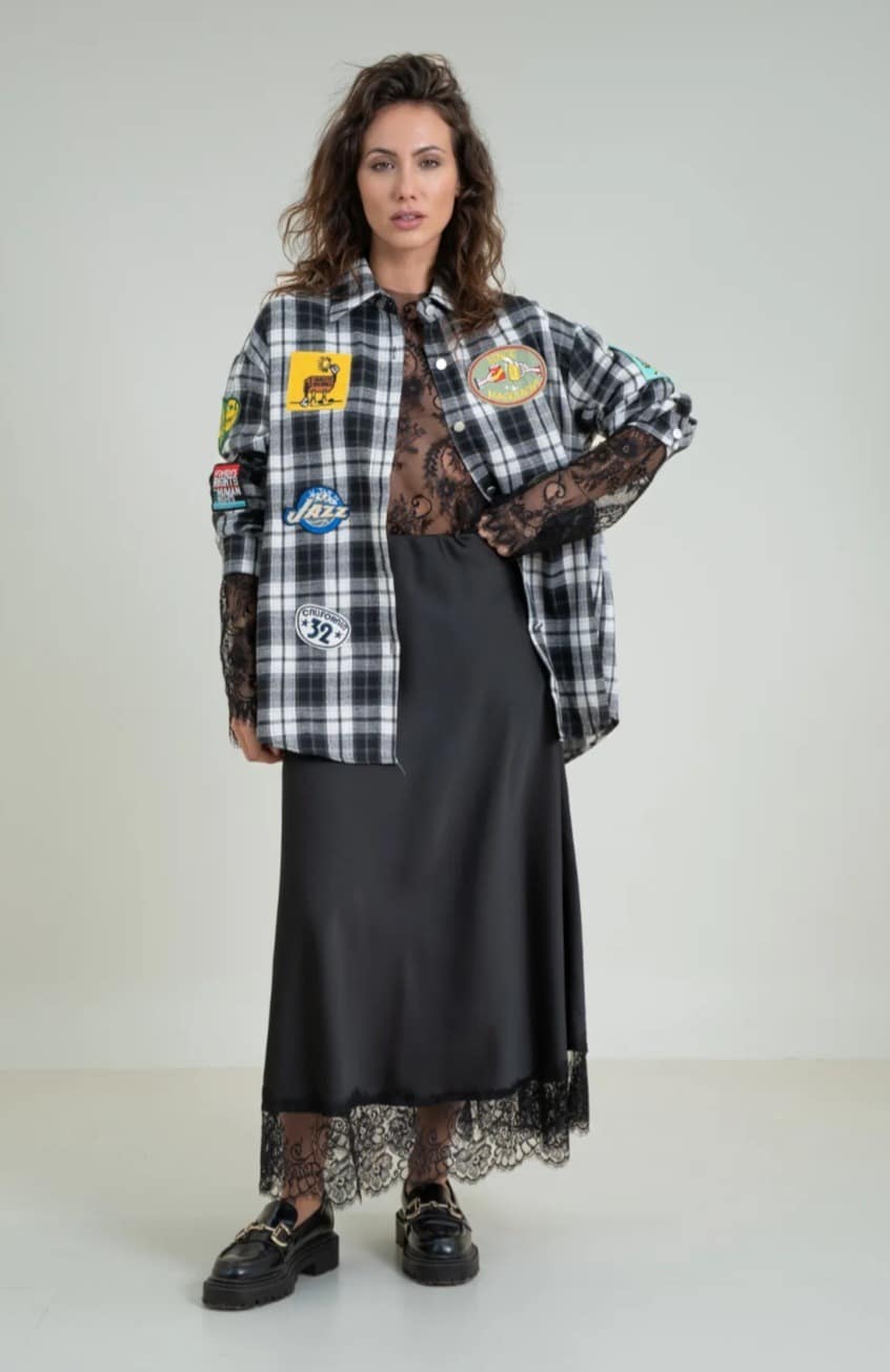 Katoenen blouse afgewerkt met leuke stoere patches in een trendy ruit, één maat, lange mouw, leuk open te dragen of dicht altijd goed, hier gecombineerd met de lace rok.