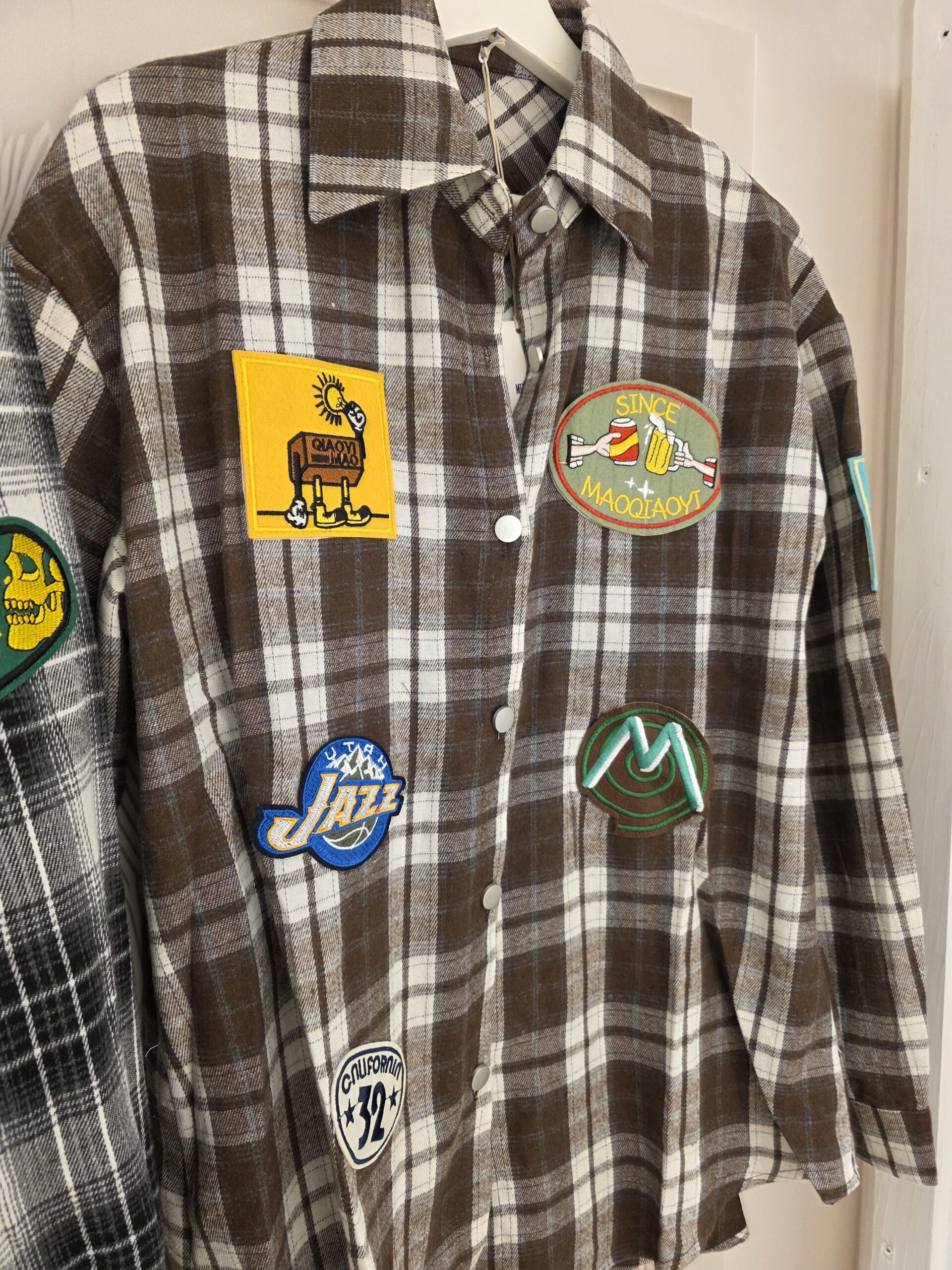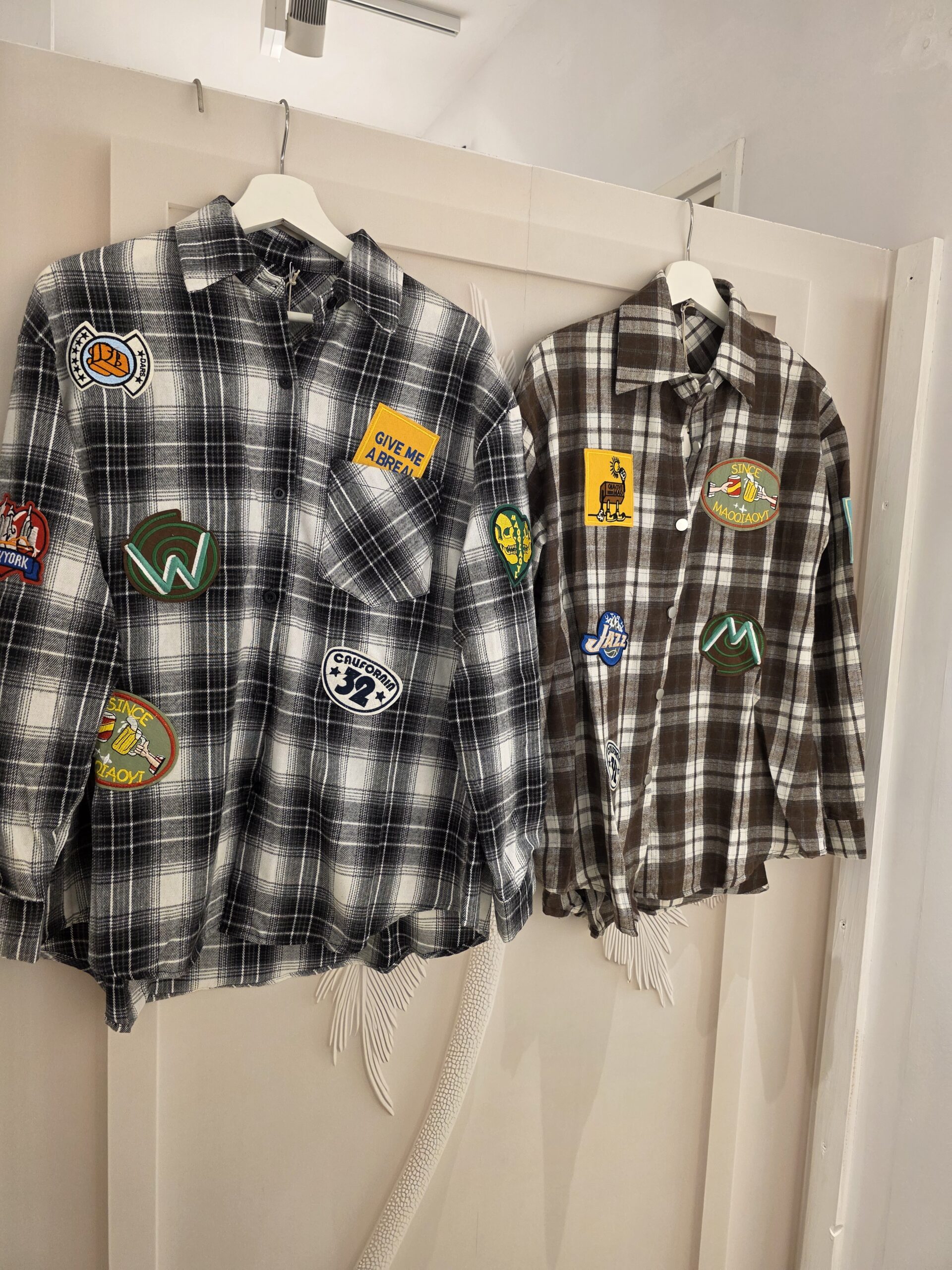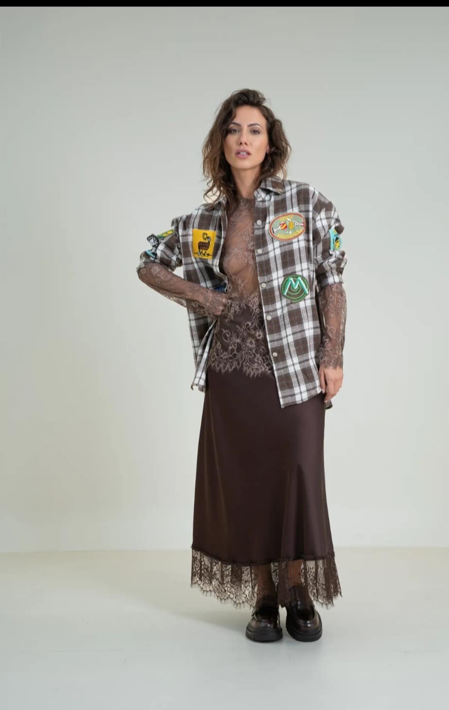 Katoenen blouse afgewerkt met leuke stoere patches in een trendy ruit, één maat, lange mouw, leuk open te dragen of dicht altijd goed, hier gecombineerd met de lace rok.