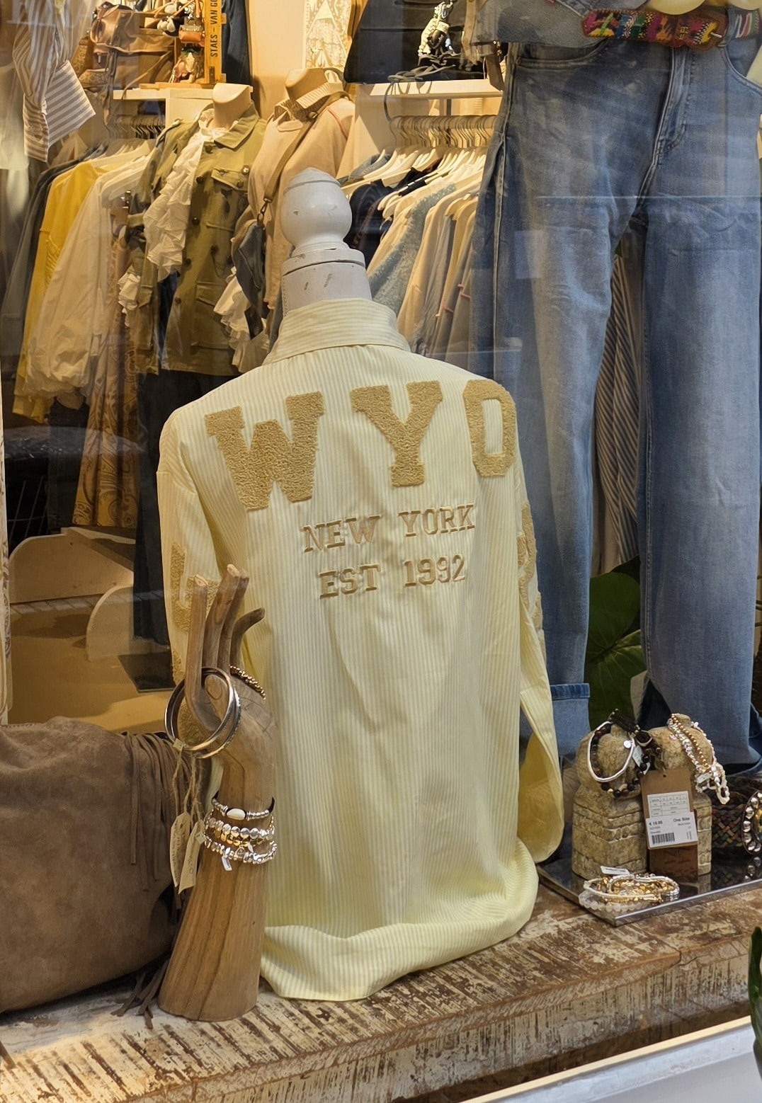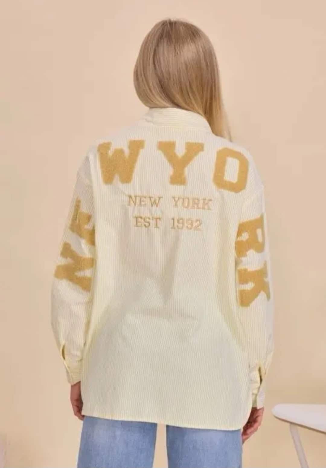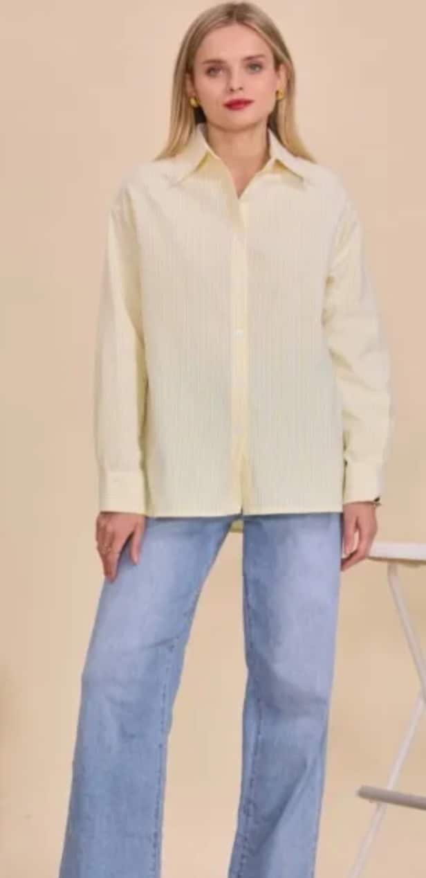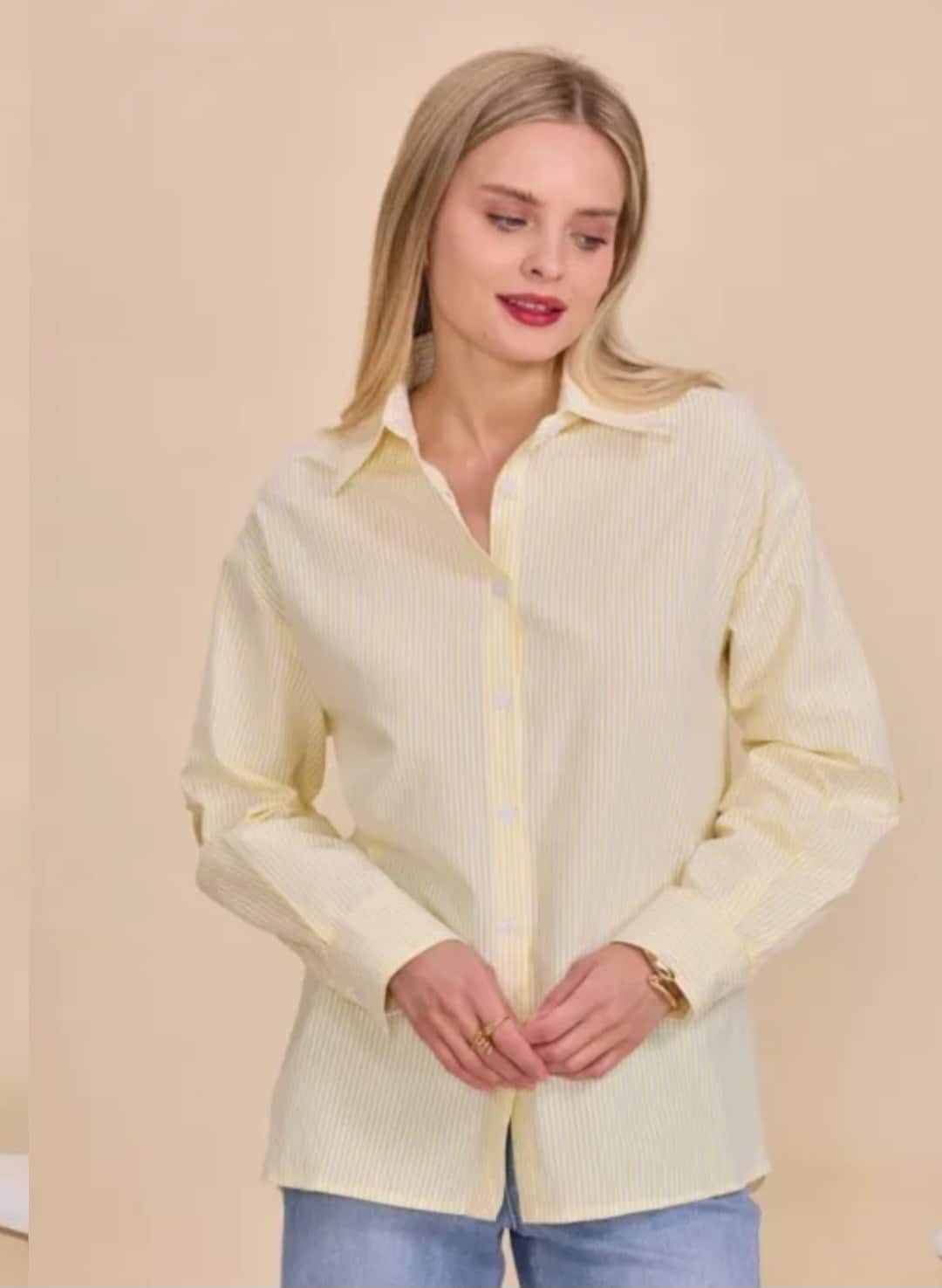 100 % katoen, deze mooie frisse blouse, één maat, past tot ongeveer 42, de gele heeft een streepje en iets andere tekst.