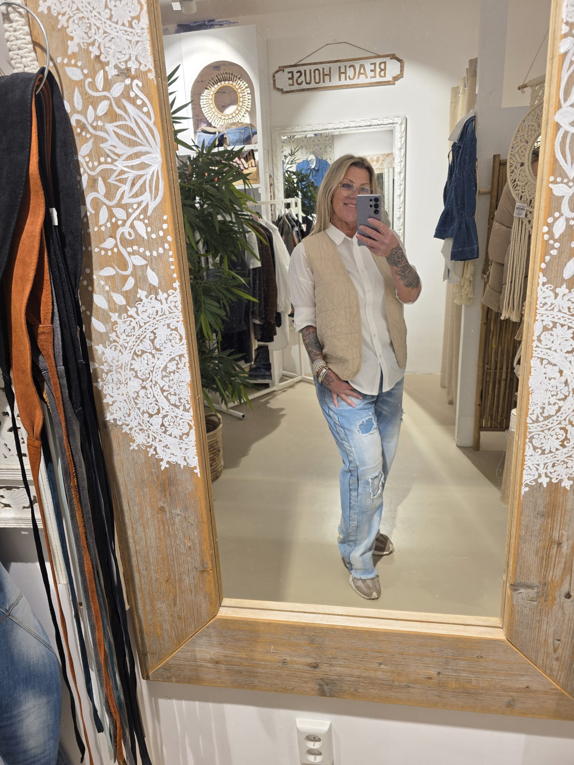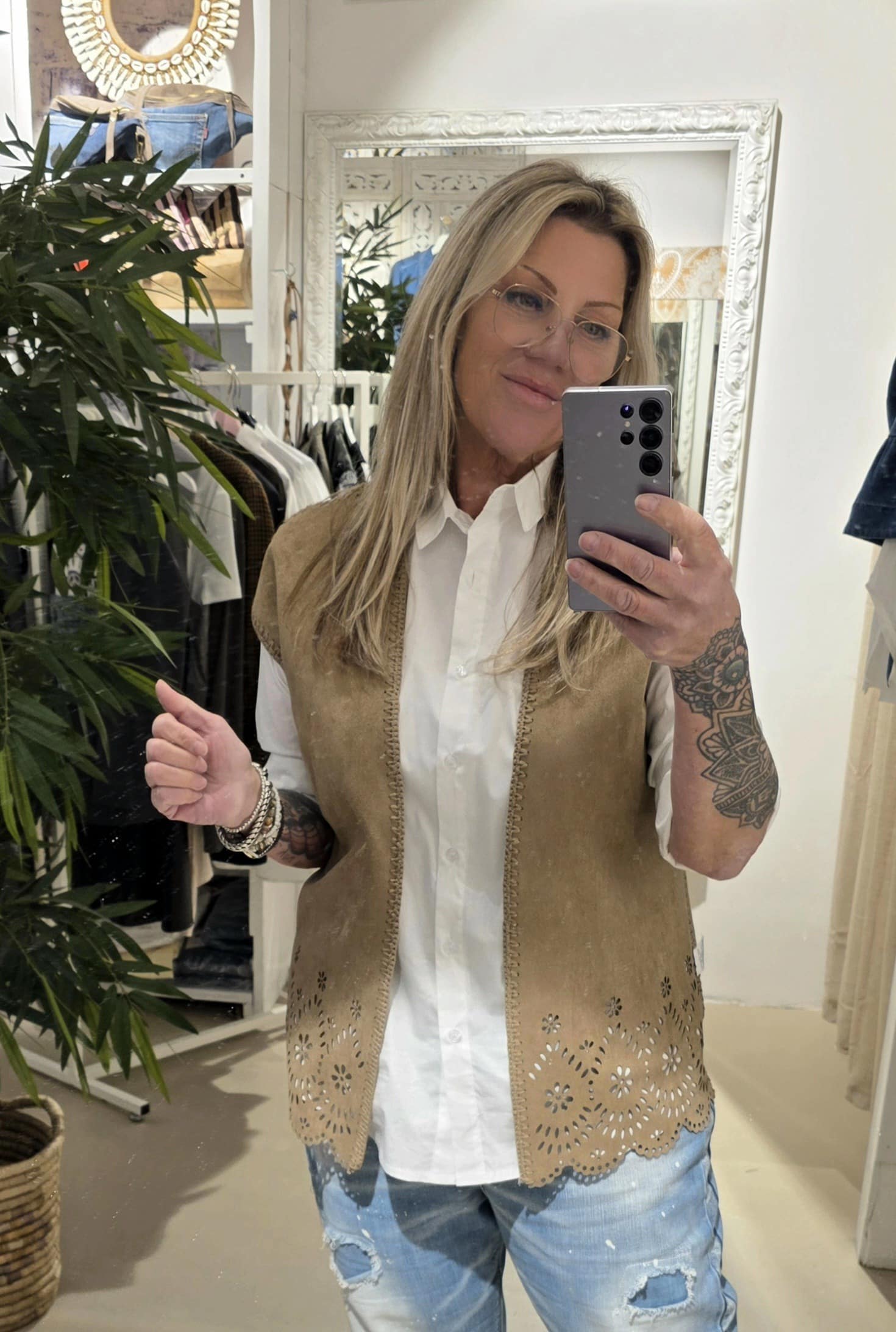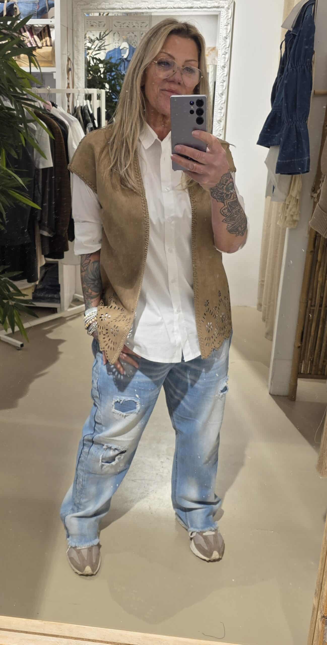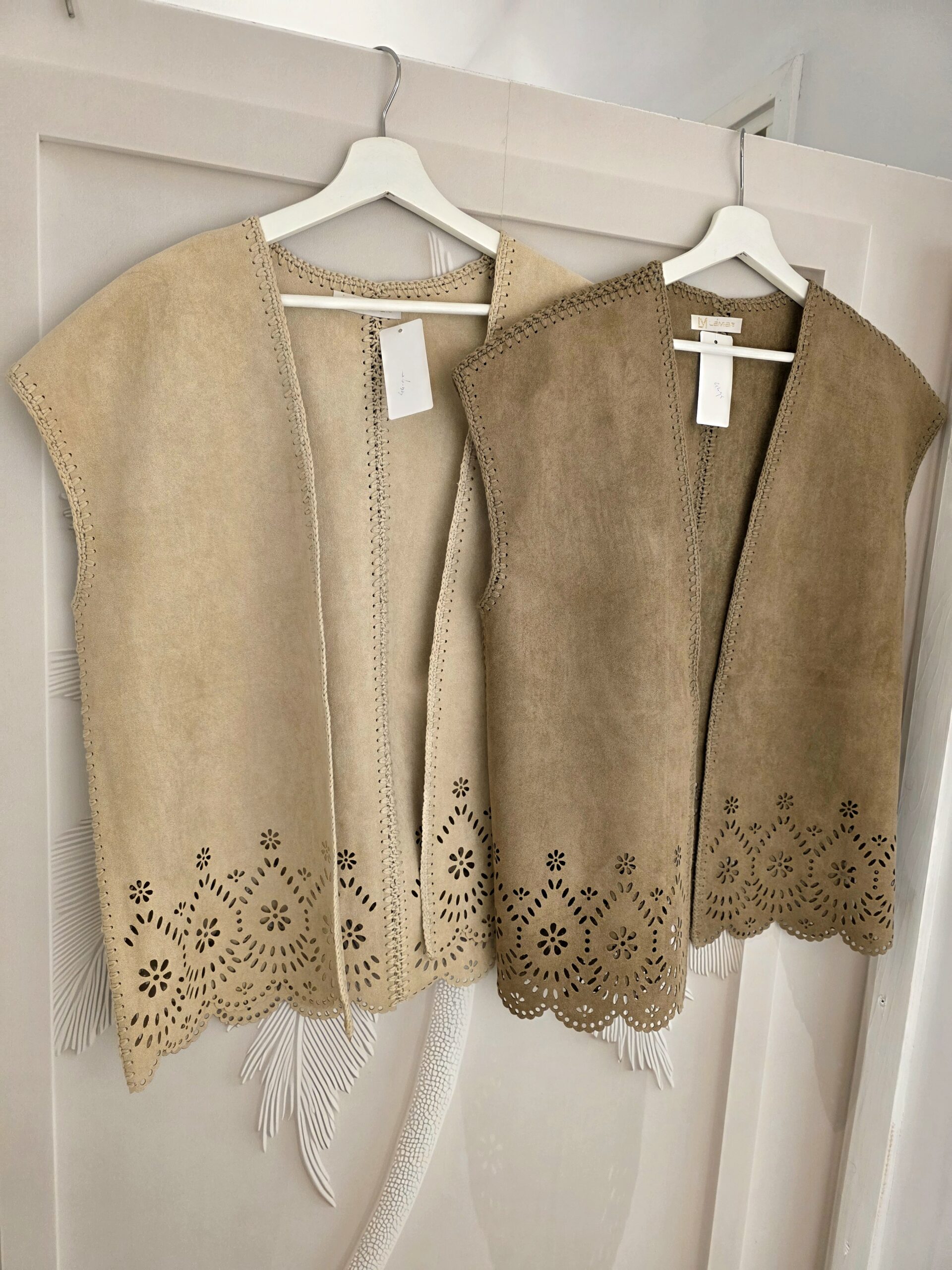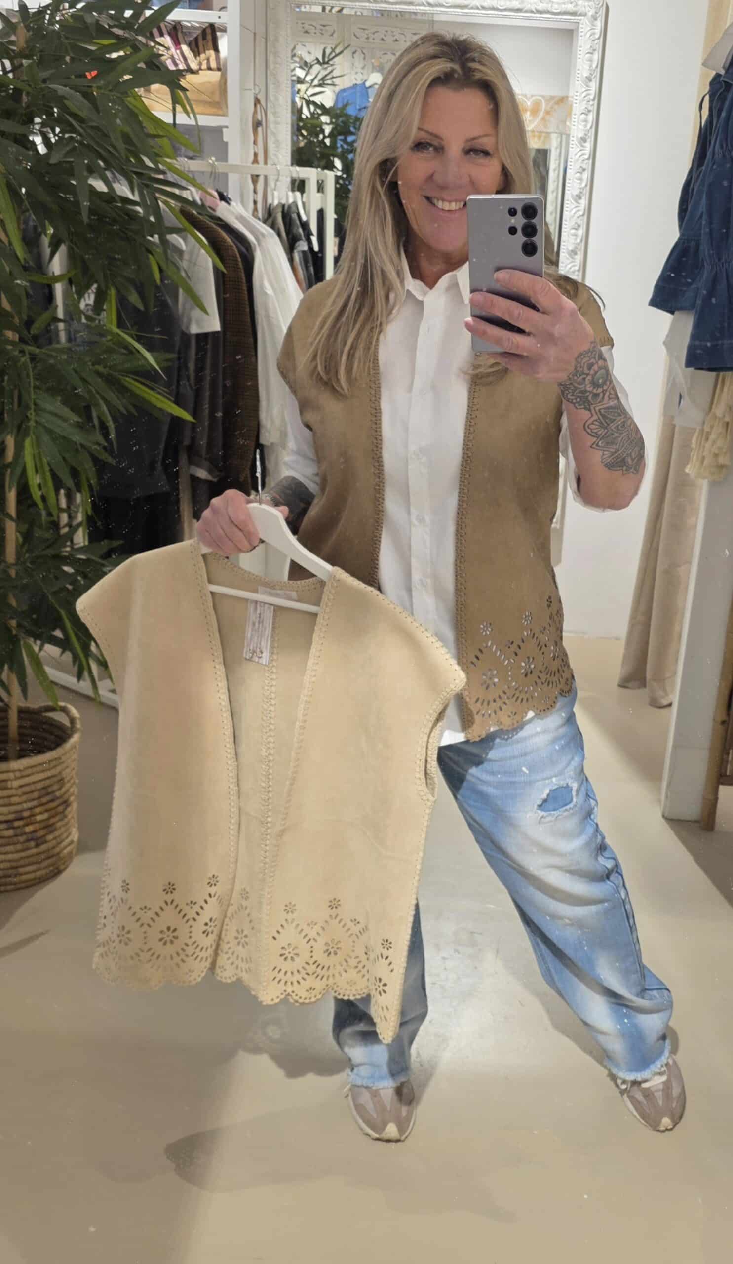 Heerlijk los giletje,één maat met opengewerkte details, past tot ongeveer 42/44 erg leuk om met veel outfits te combineren, nep suedine stof.