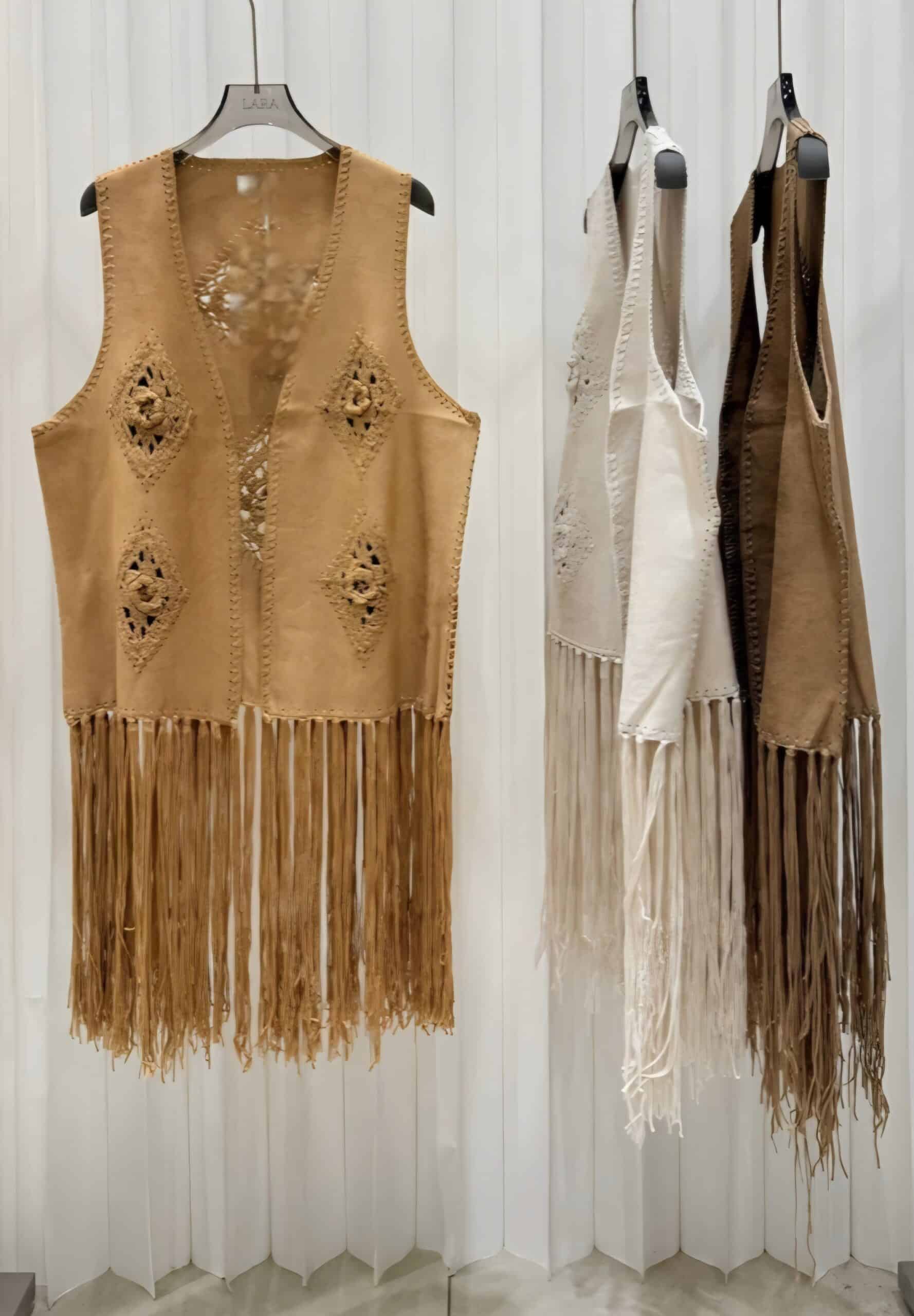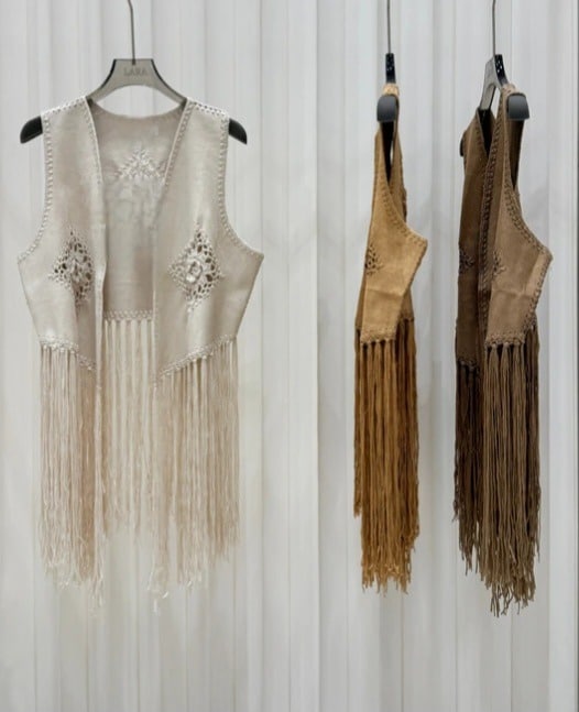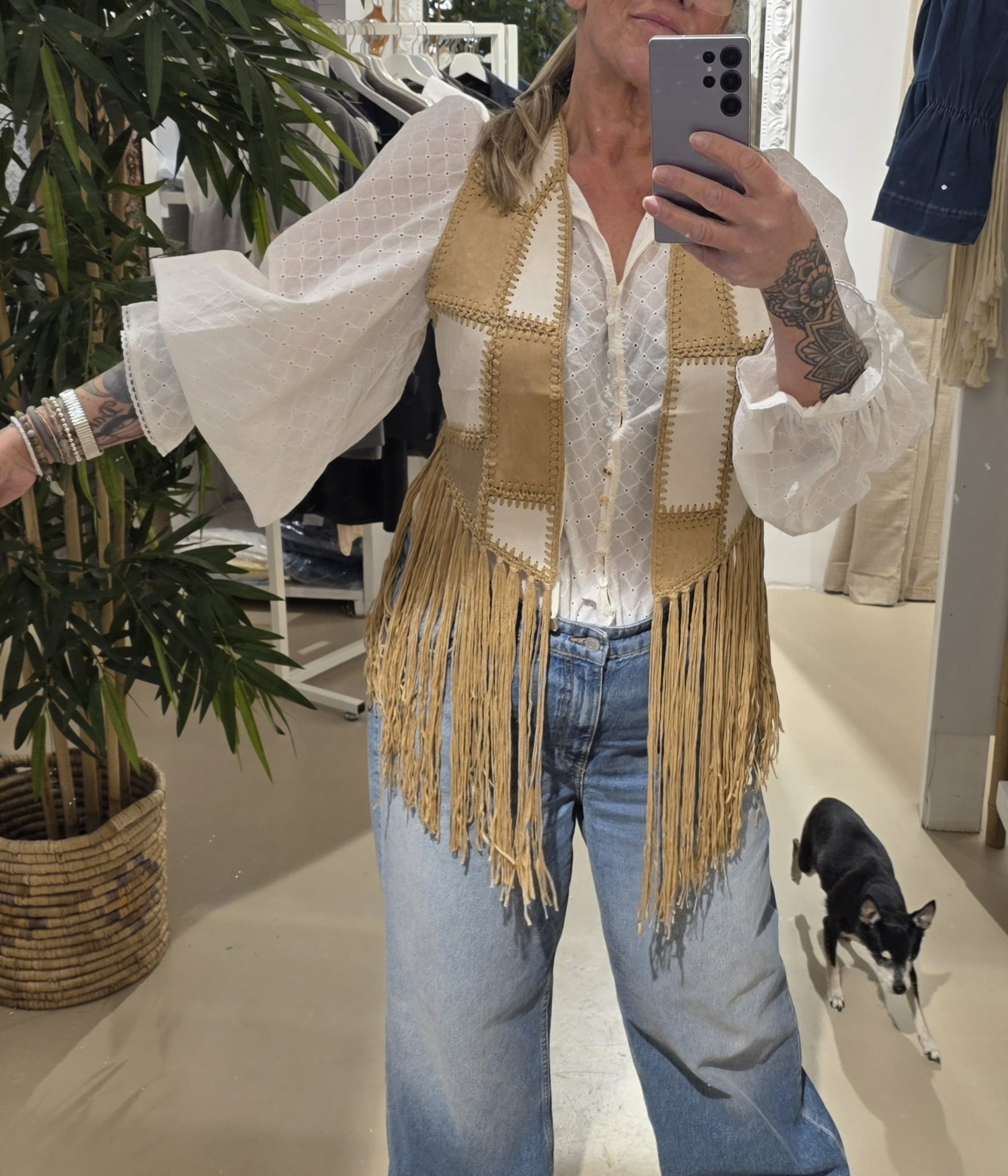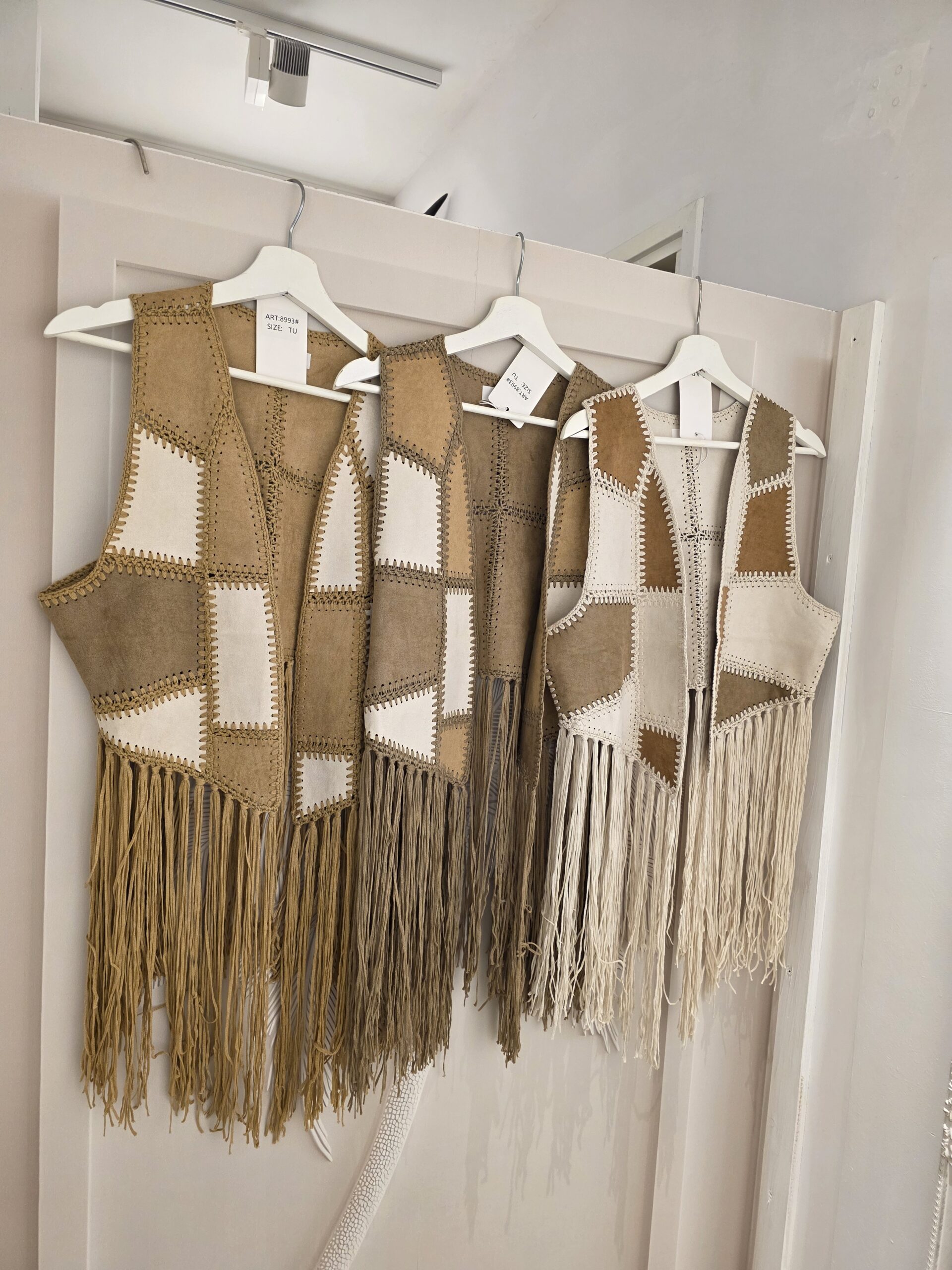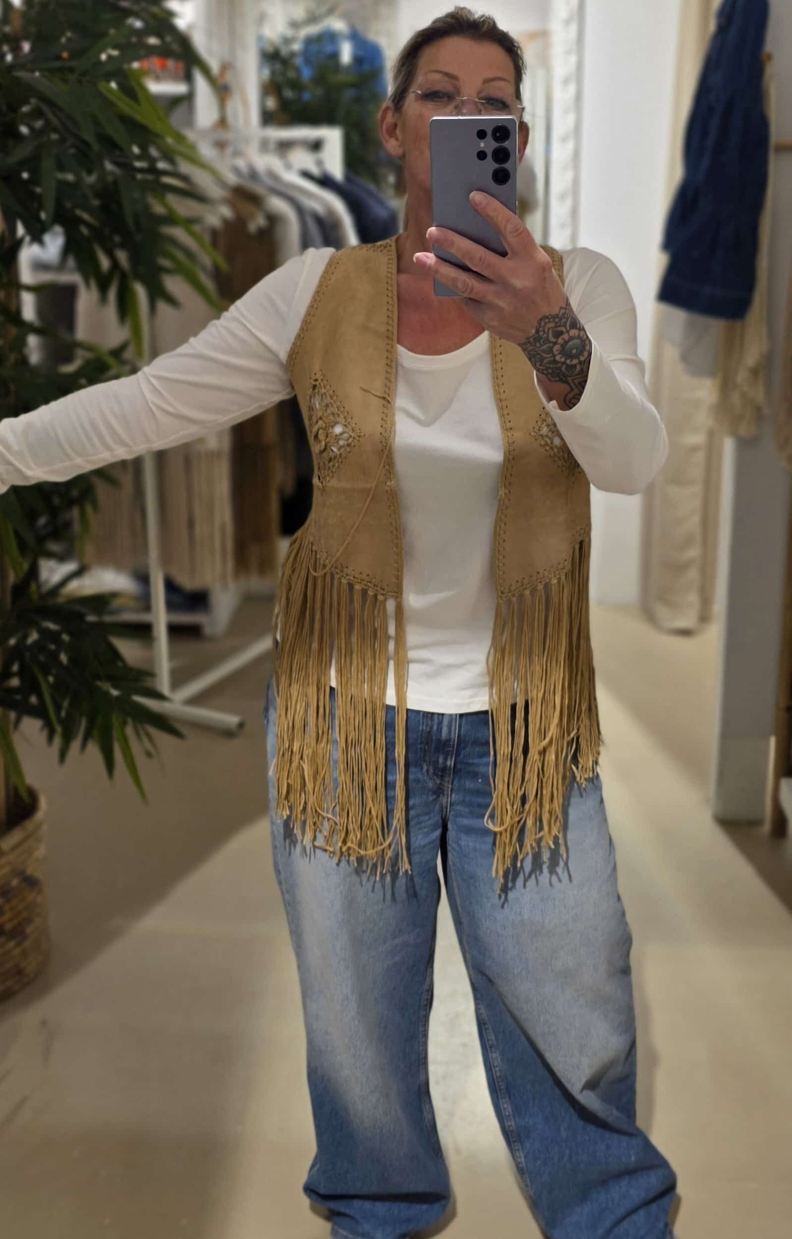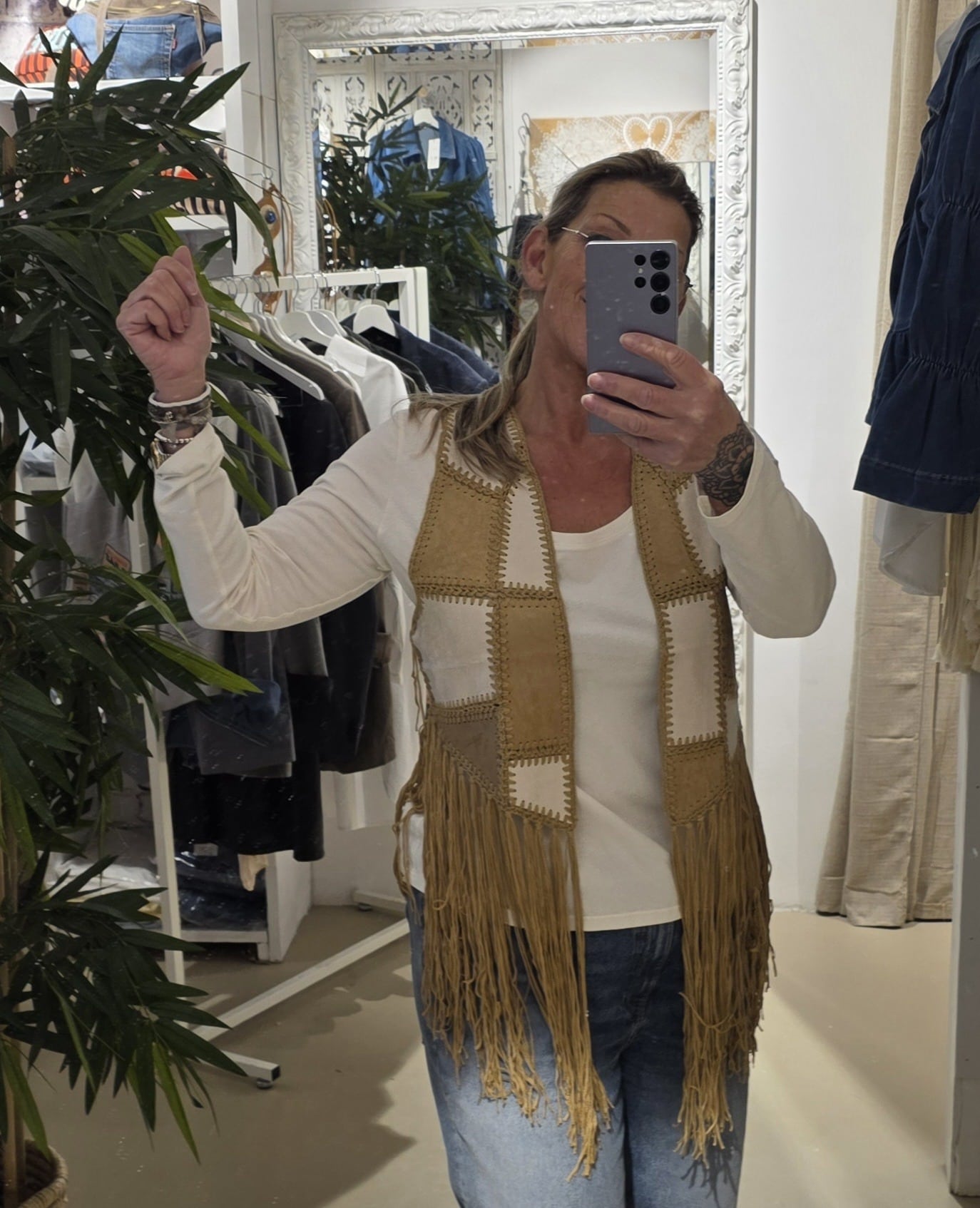 Dit geweldige gilet, maar nu in een kortere versie, één maat weer de lengte bij deze is 47 cm voor, 37 cm achter gemeten zonder franjes, materiaal is van polyester suèdine, leuk trendy gilet, onmisbaar in je garderobe, heerlijk boho vibe