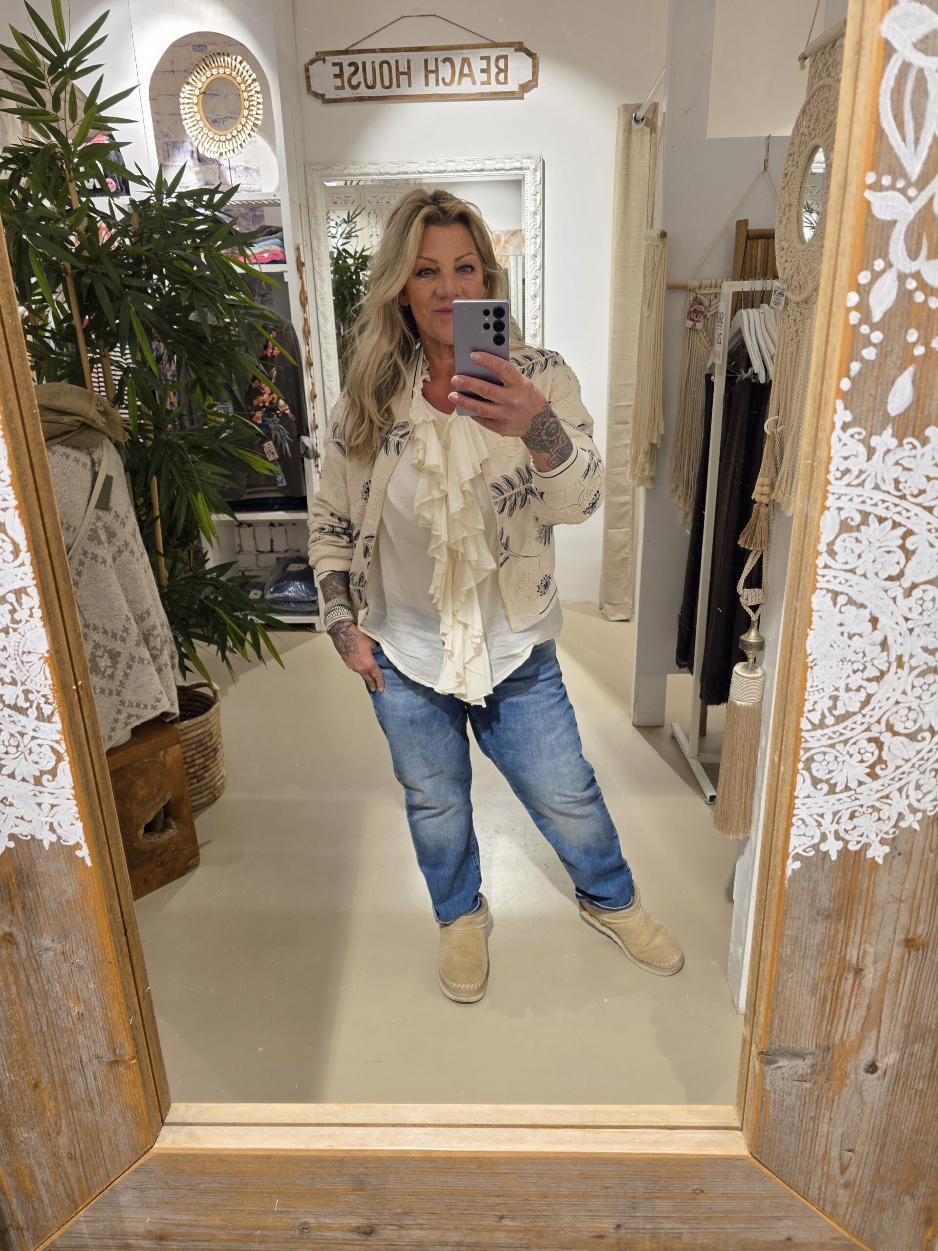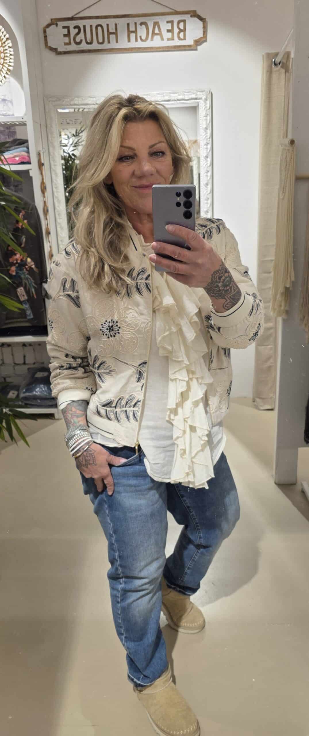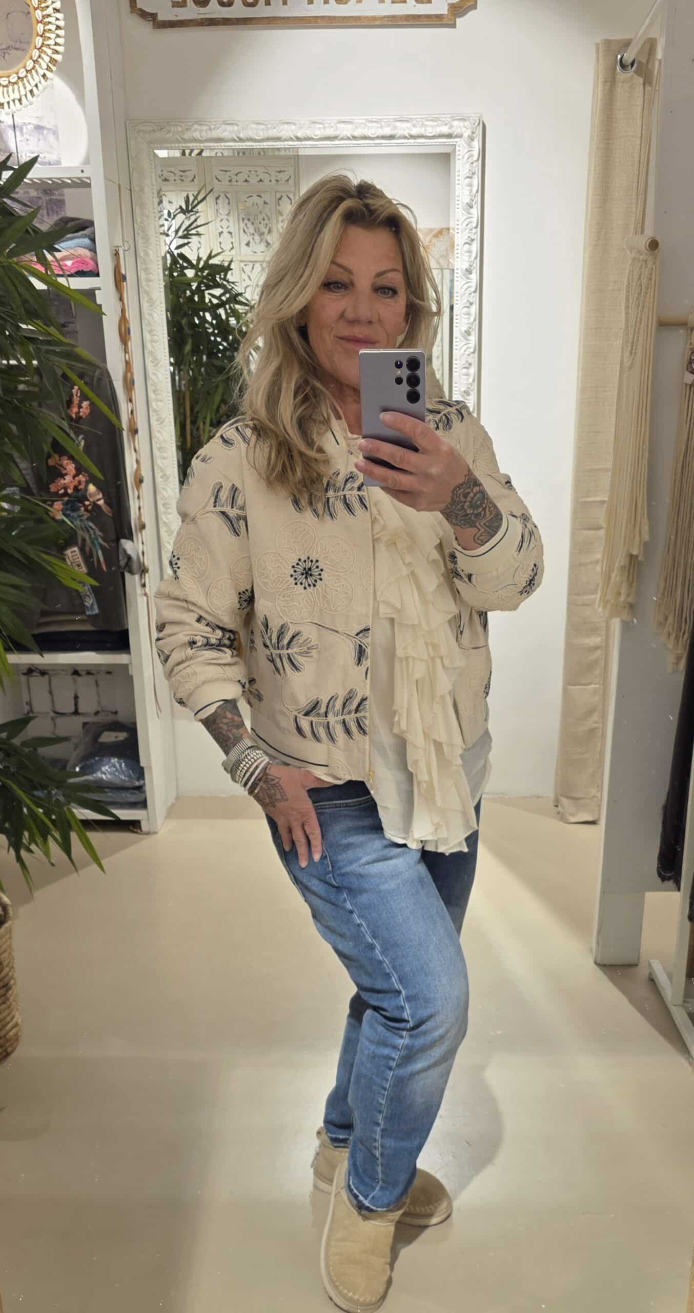 Mooi geborduurd jasje in één maat van 100% katoen, gevoerd, mooie rits én zakken, echt een eyecatcher, past tot ongeveer 42/44 klkeur is roomwit met navy