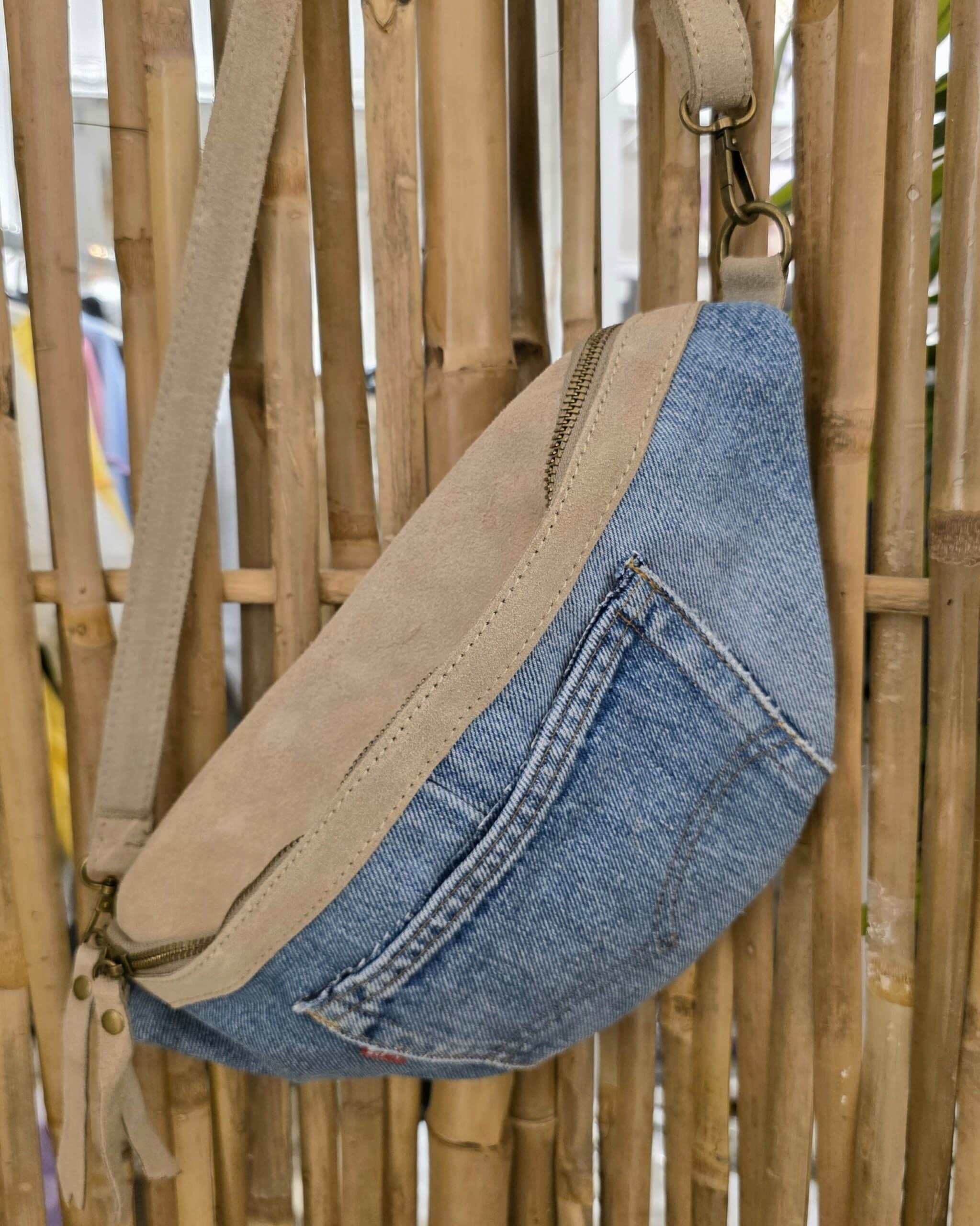 Leuke tas, crossbody te dragen, afgewerkt met echt suède met een rits, verstelbare bandjes, de tassen zijn gemaakt van oude jeans, dus iedere tas is een beetje anders, leuke stoere jeans tas die je outfit compleet maakt.