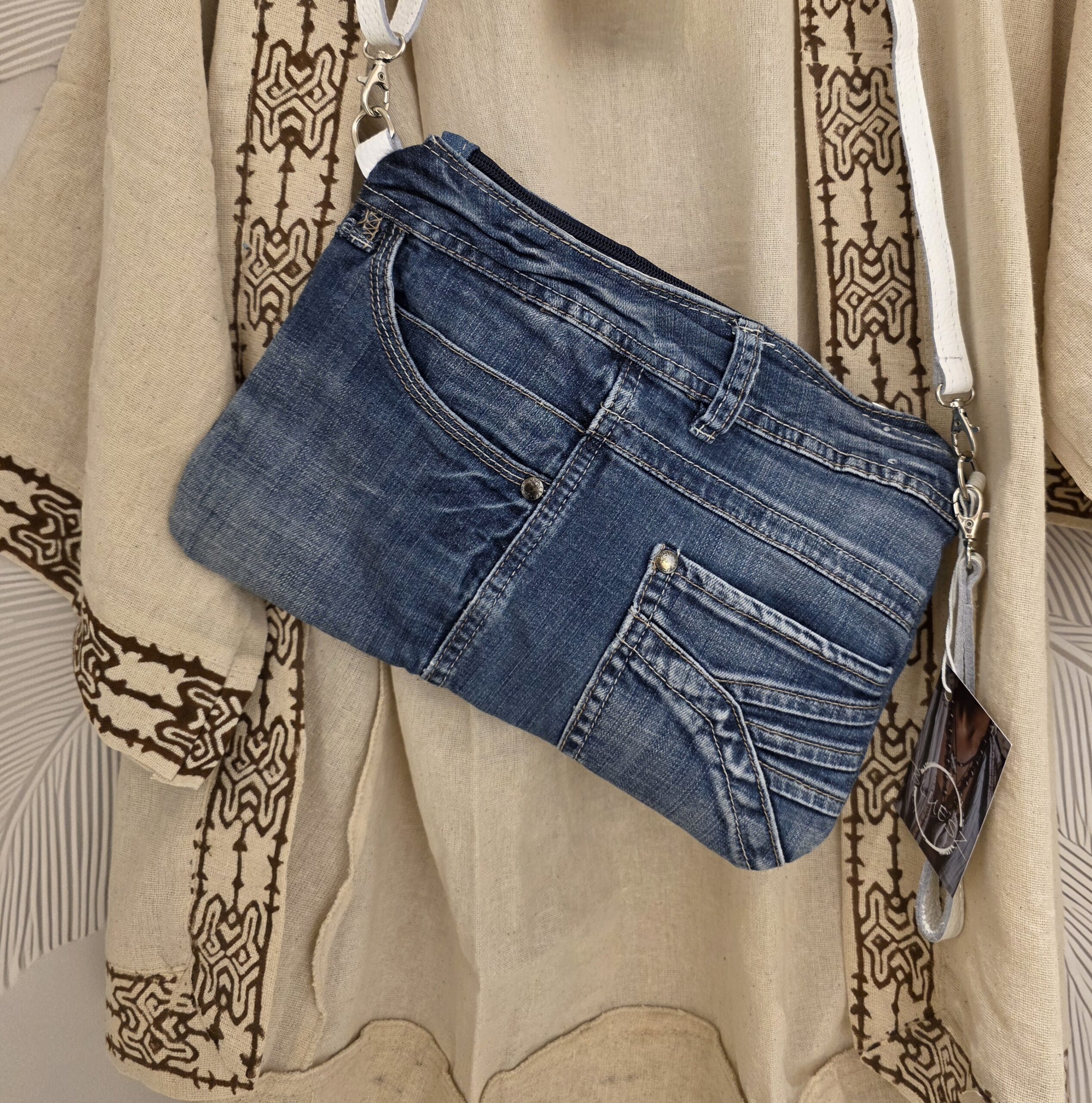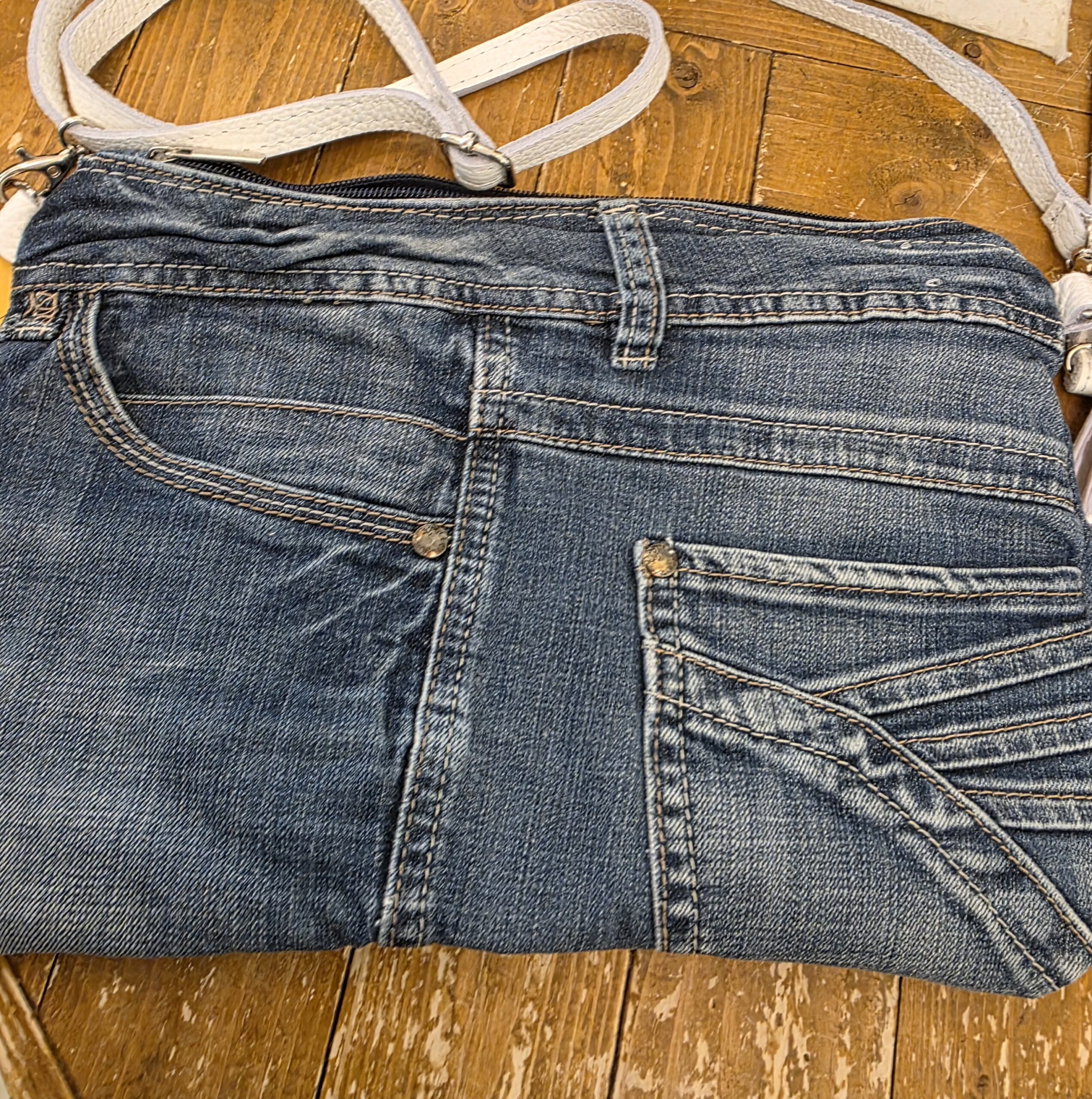 Gemaakt van oude jeans, dus ieder tasje is anders, ze hebben een witte of beige hengsel, verstelbare bandjes, rits en een super stoere stonewashed look.