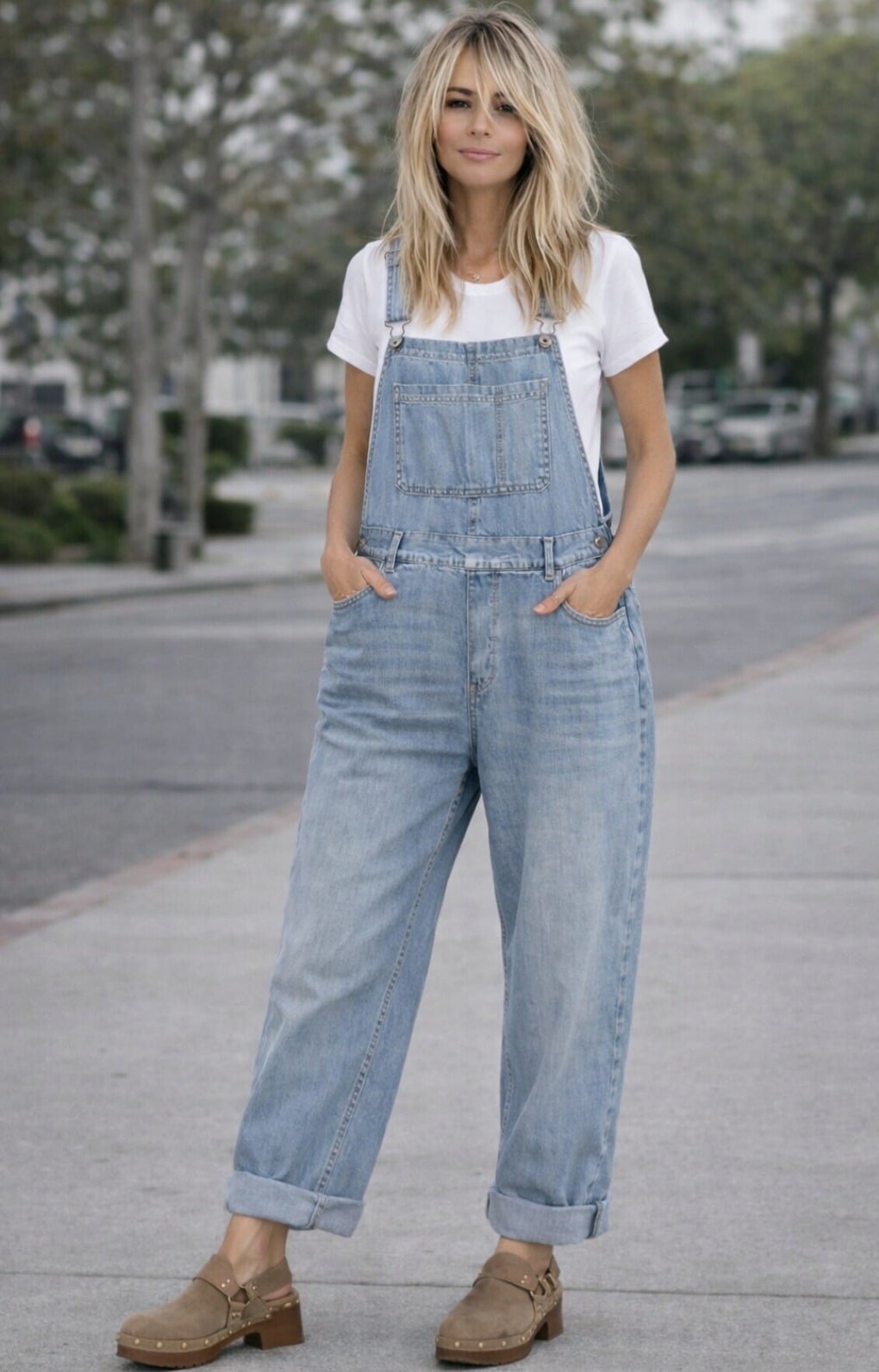 Mooie stoere wassing in dit oversized pak, tuinpak van soepel natuurlijk materiaal in jeans, super trendy, past tot 44 zeker