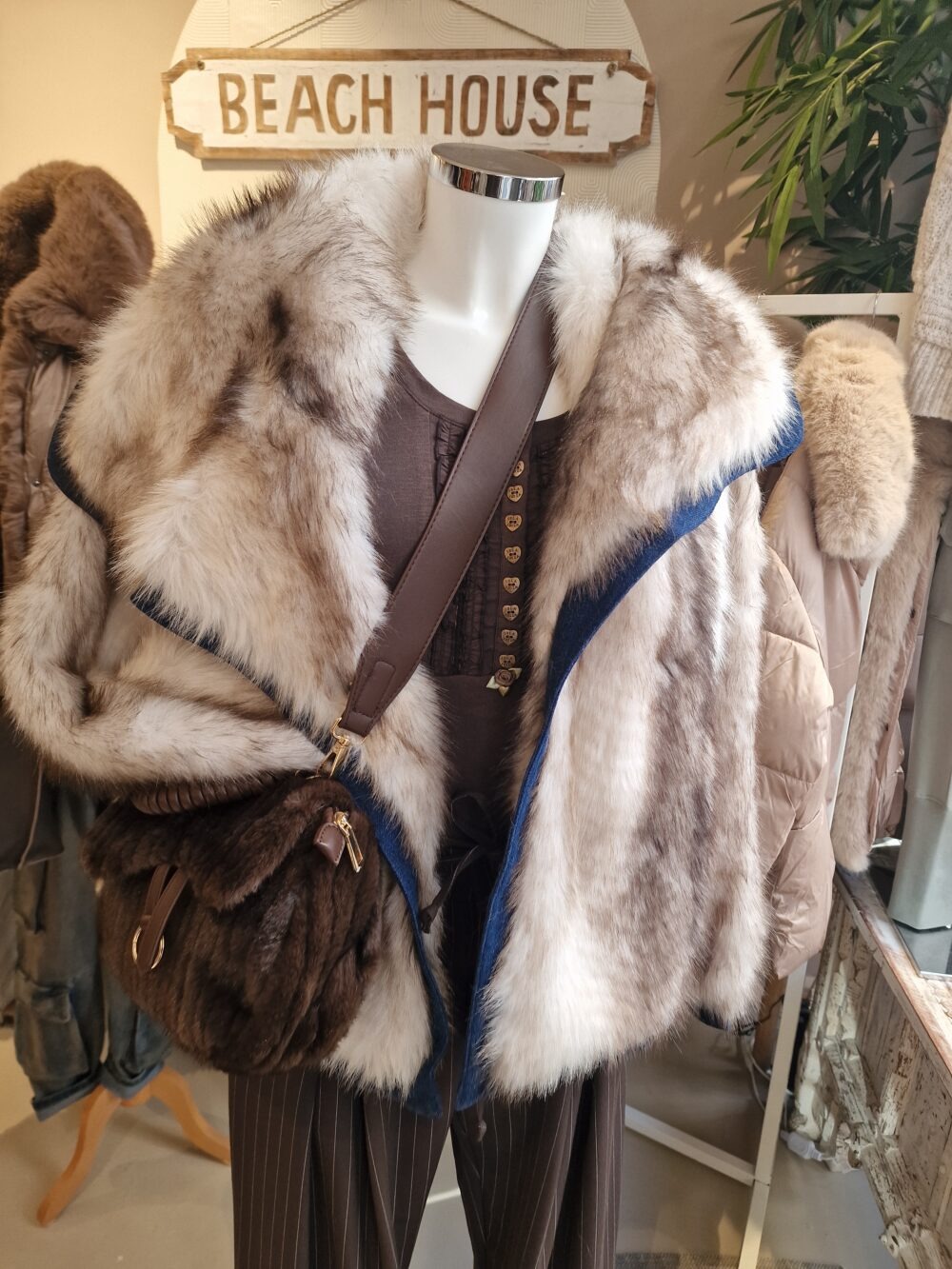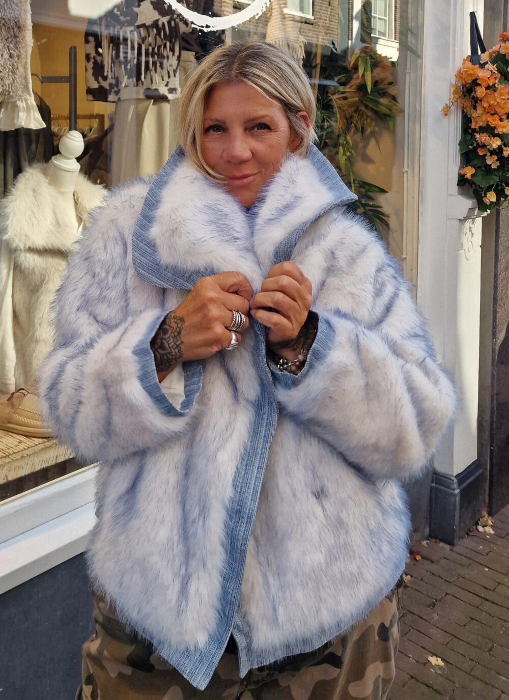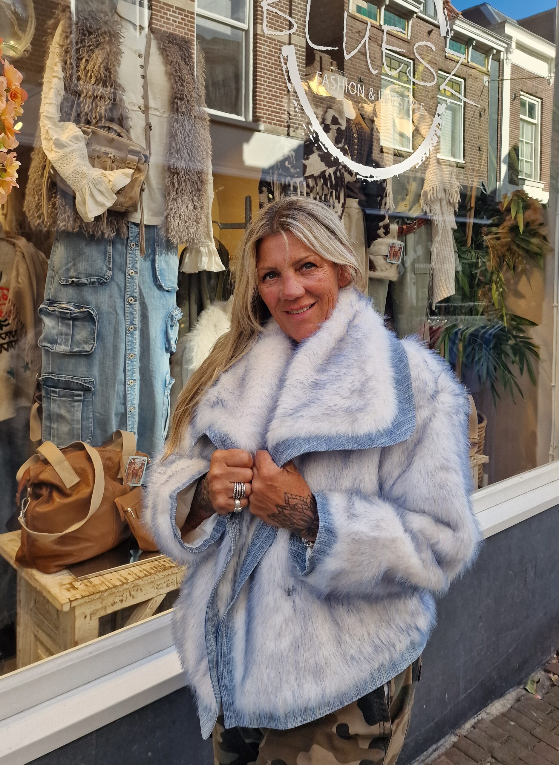 van nep bont, mooie kwaliteit in één maat met grote kraag, afgewerkt met een jeans randje, mooie volle jas, zit heerlijk