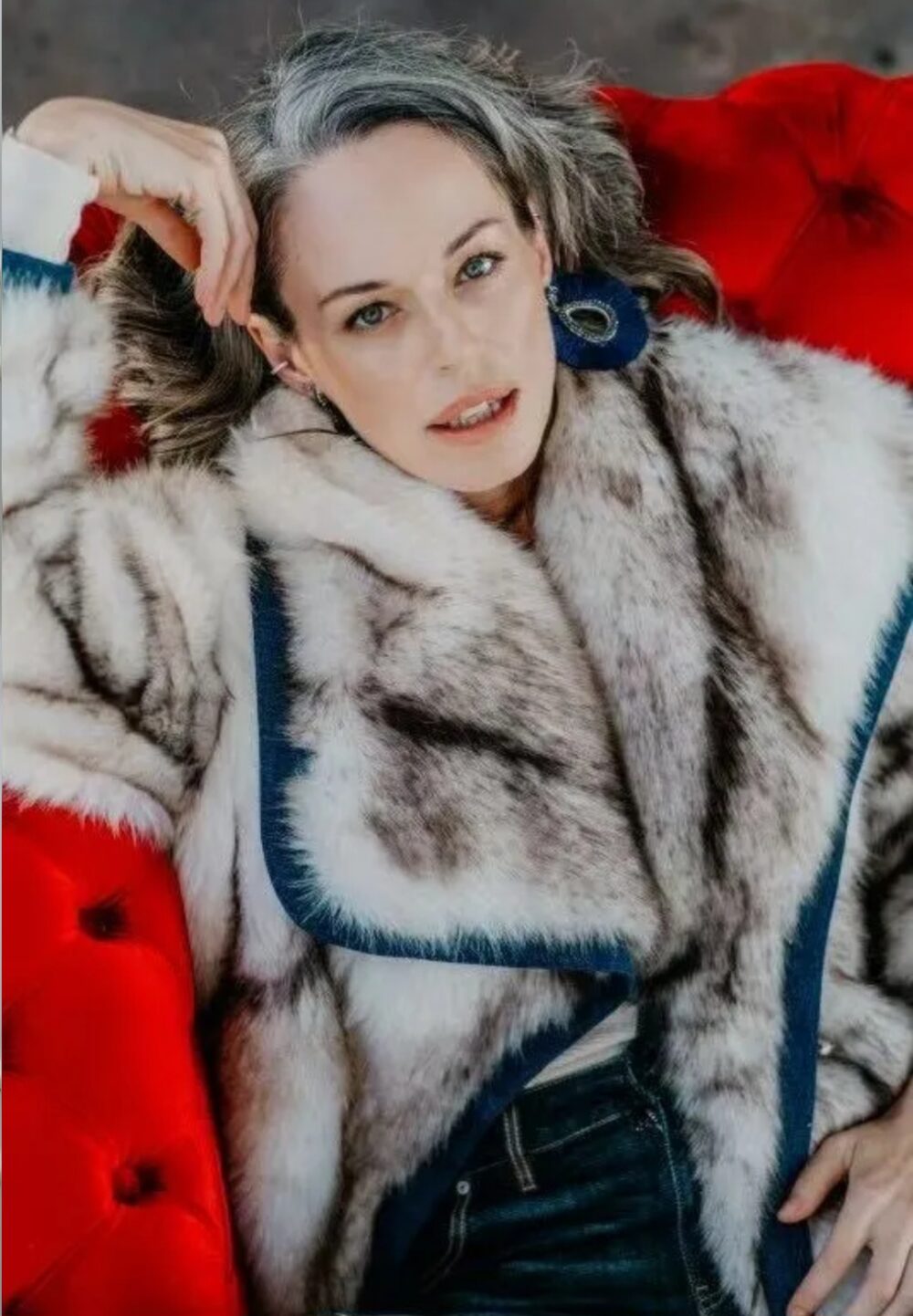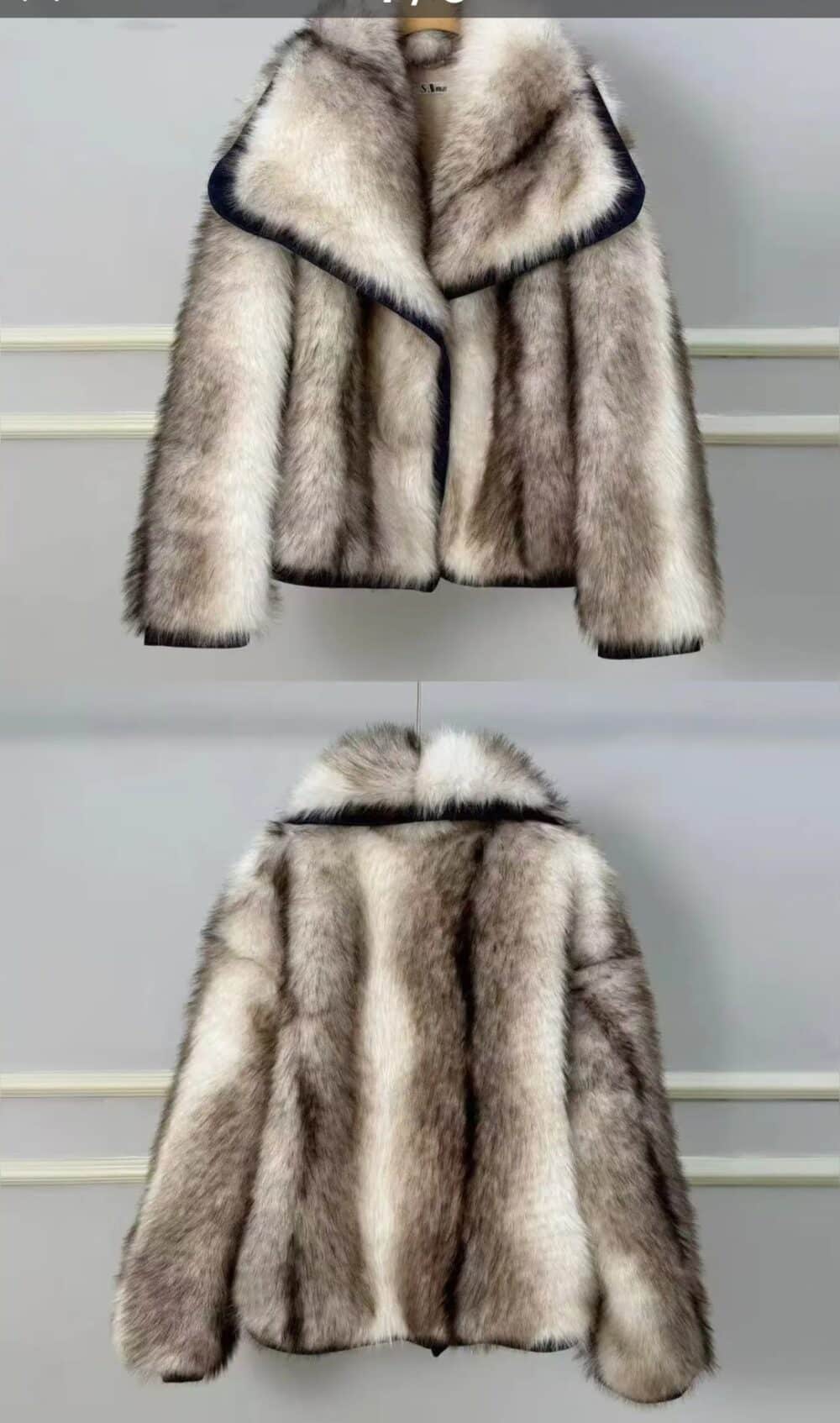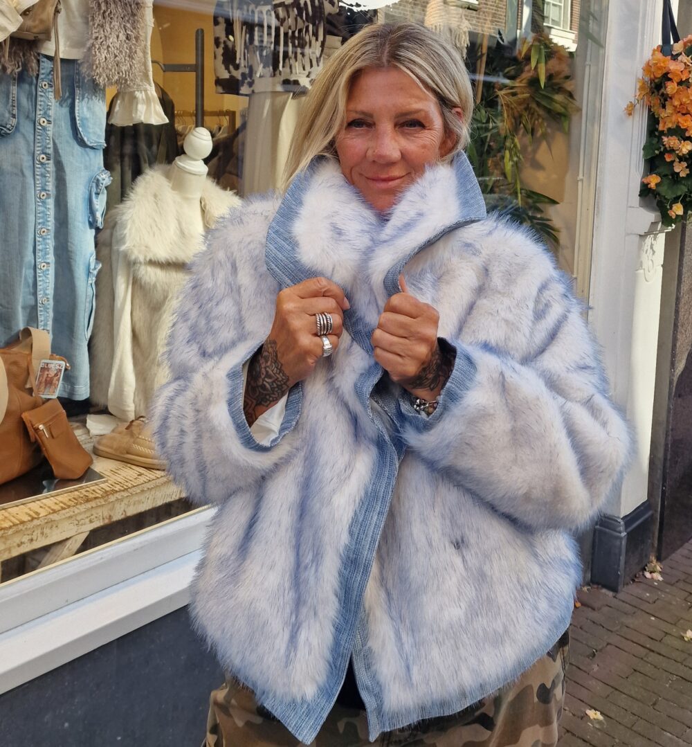 van nep bont, mooie kwaliteit in één maat met grote kraag, afgewerkt met een jeans randje, mooie volle jas, zit heerlijk