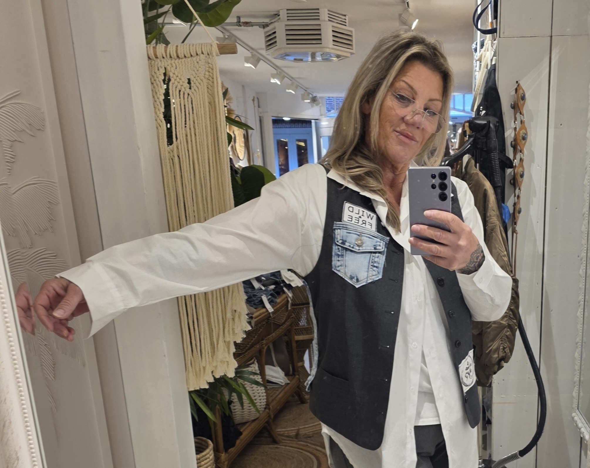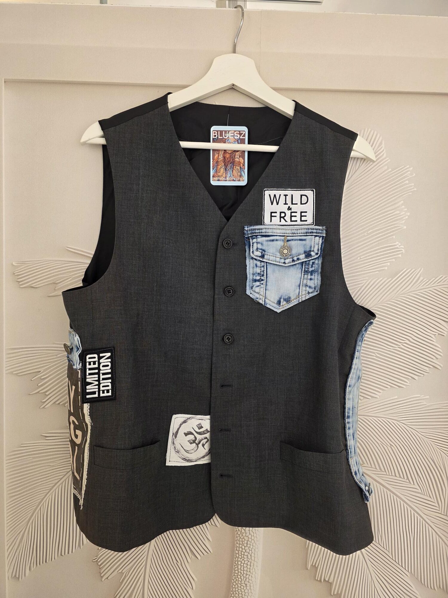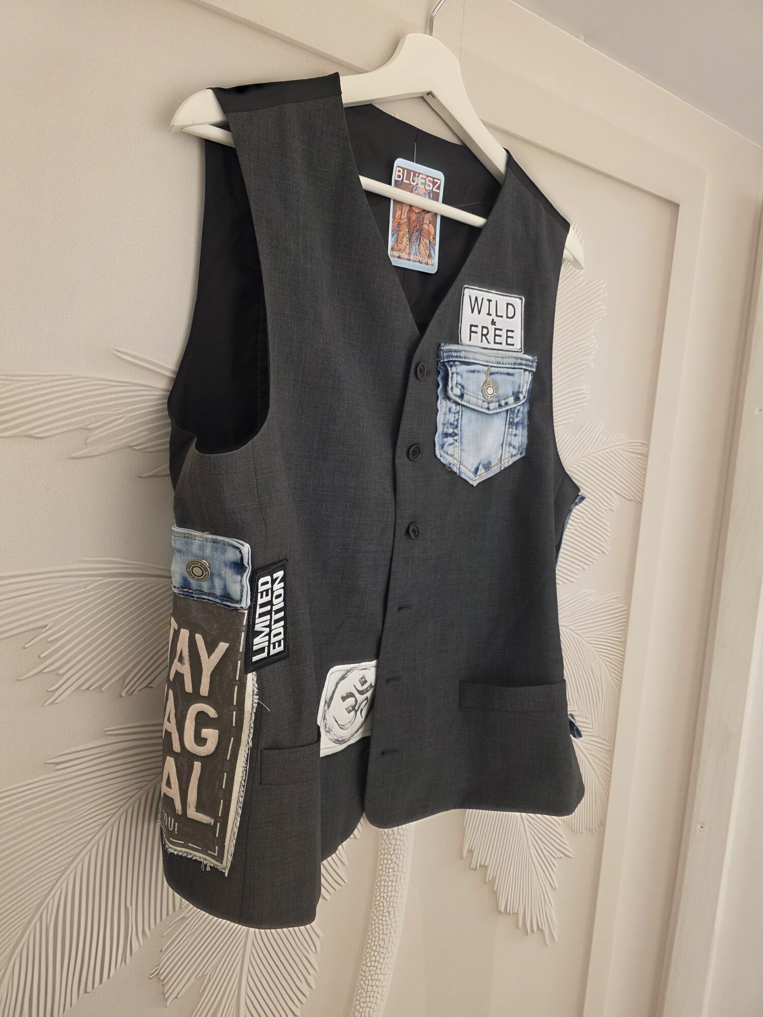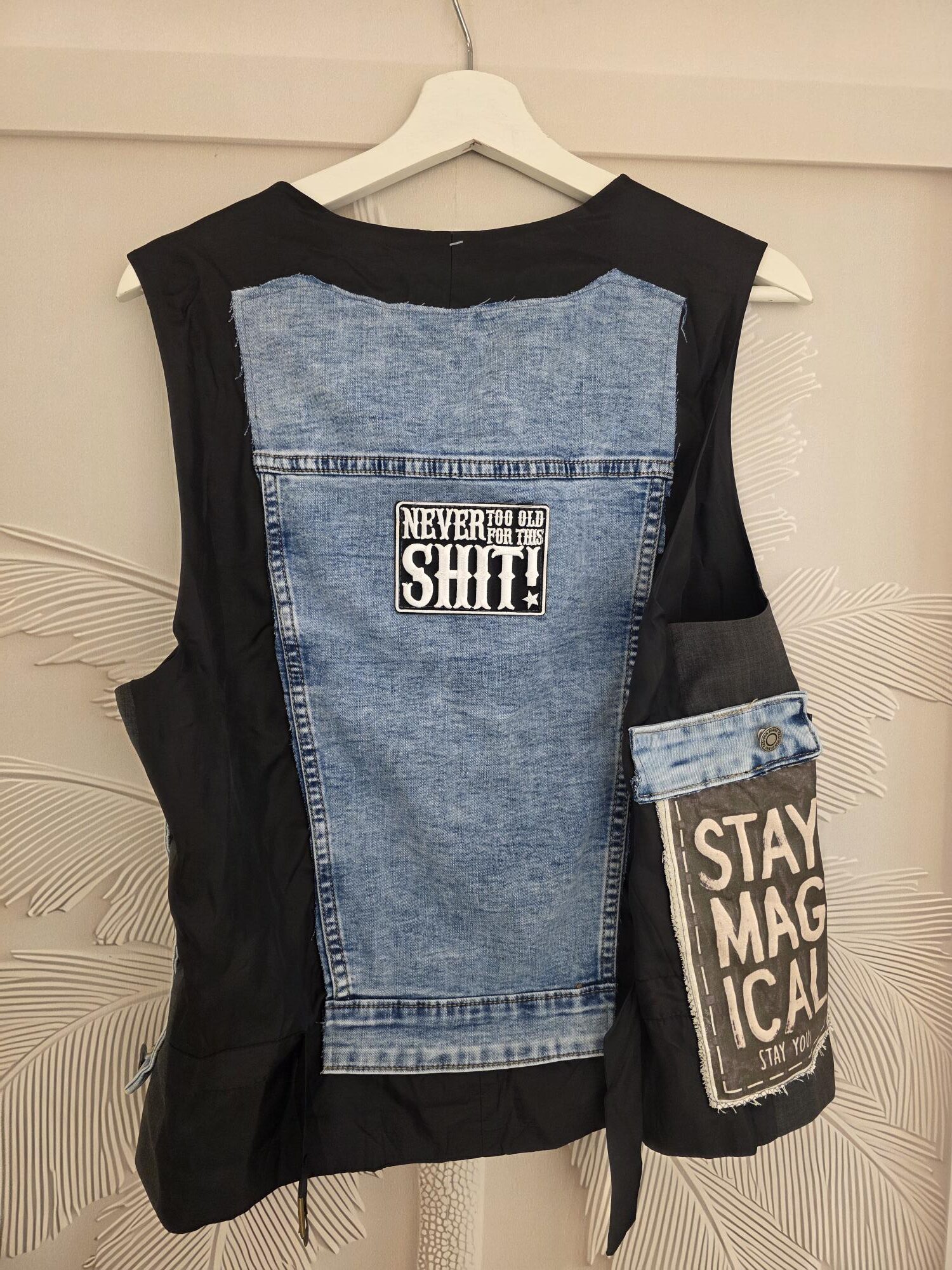Mooi gilet, one of a kind, dit soort gilets worden er altijd maar één van gemaakt en dus uniek, hand bewerkt, deze heeft jeans en diverse patch, dit is een L/XL, lekker stoer én tijdloos