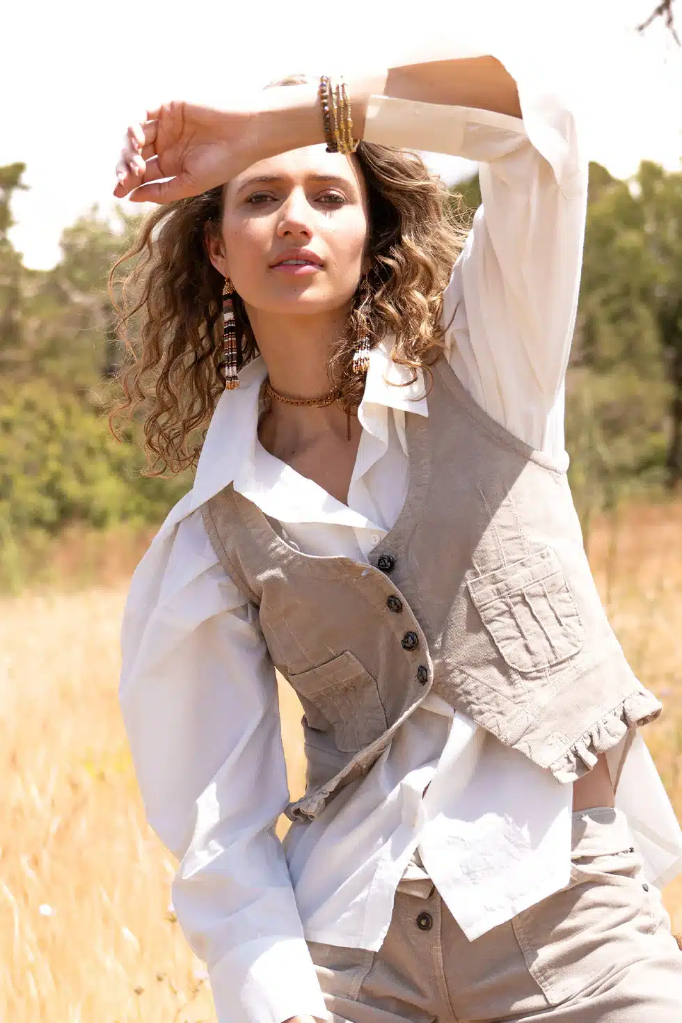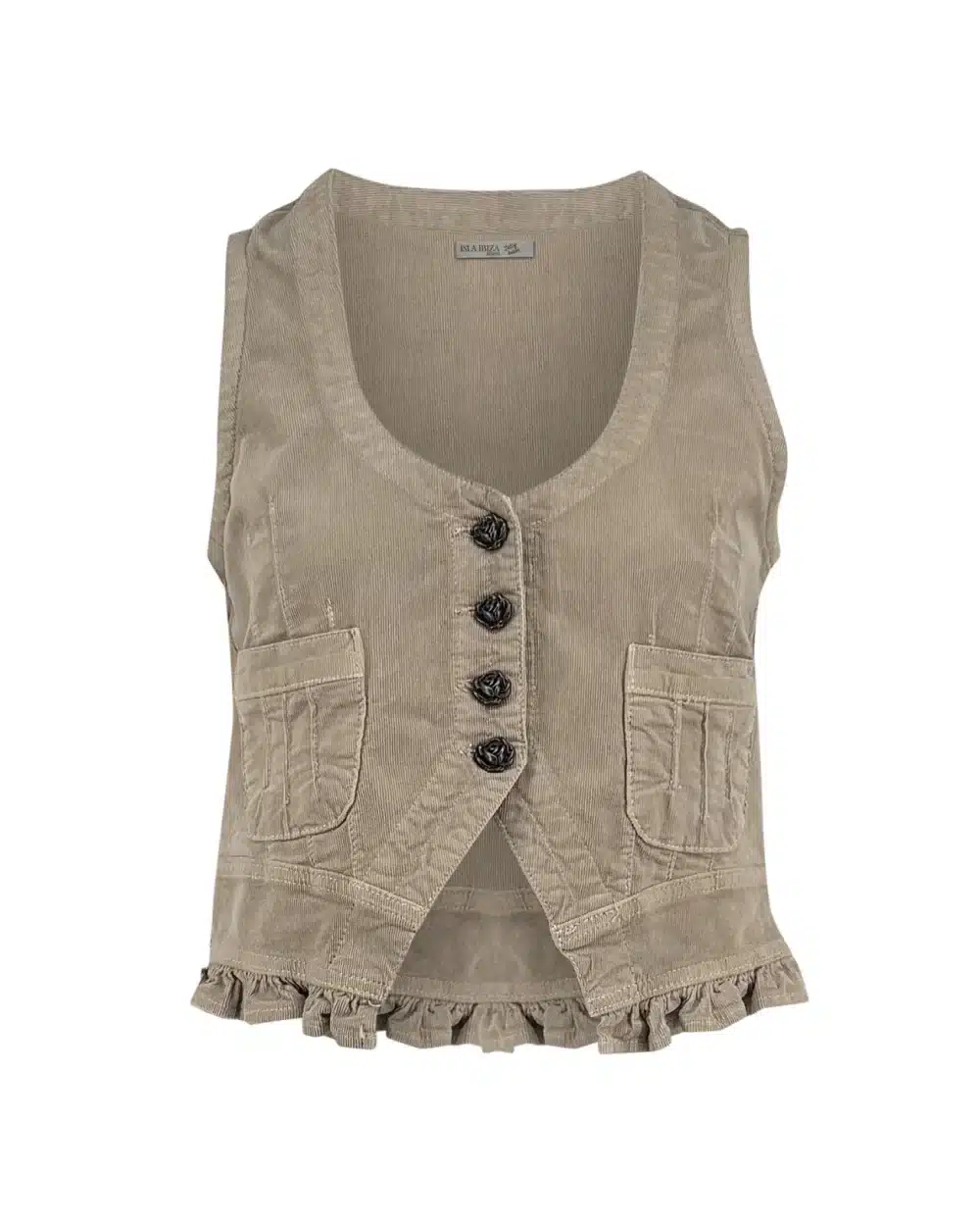 Product gegevens: Gilet gemaakt van een zachte stof, heeft een kraagje, knoopjes en ruche onderrand