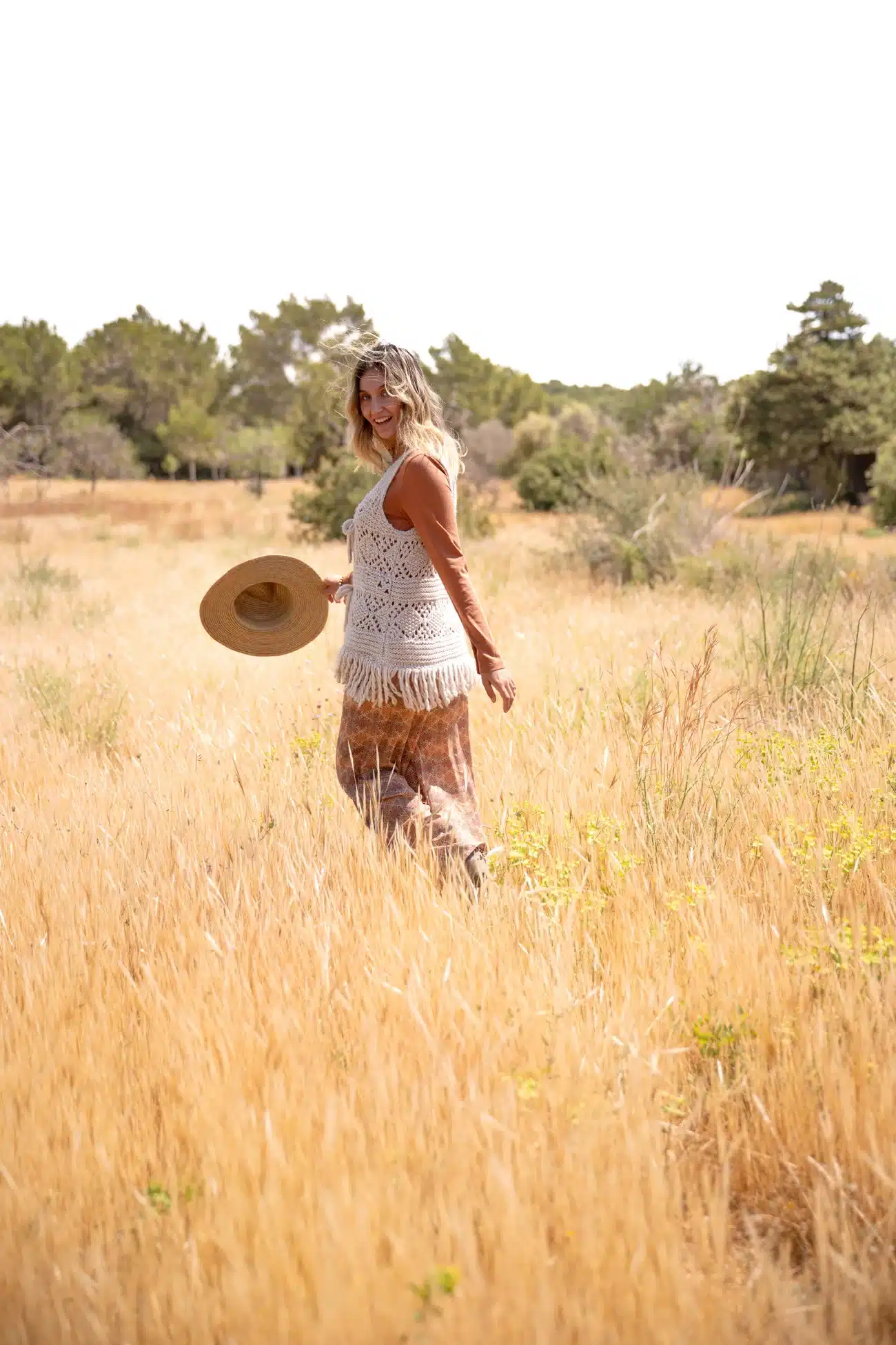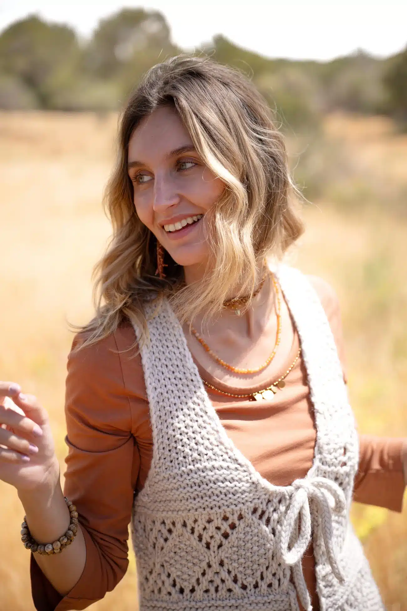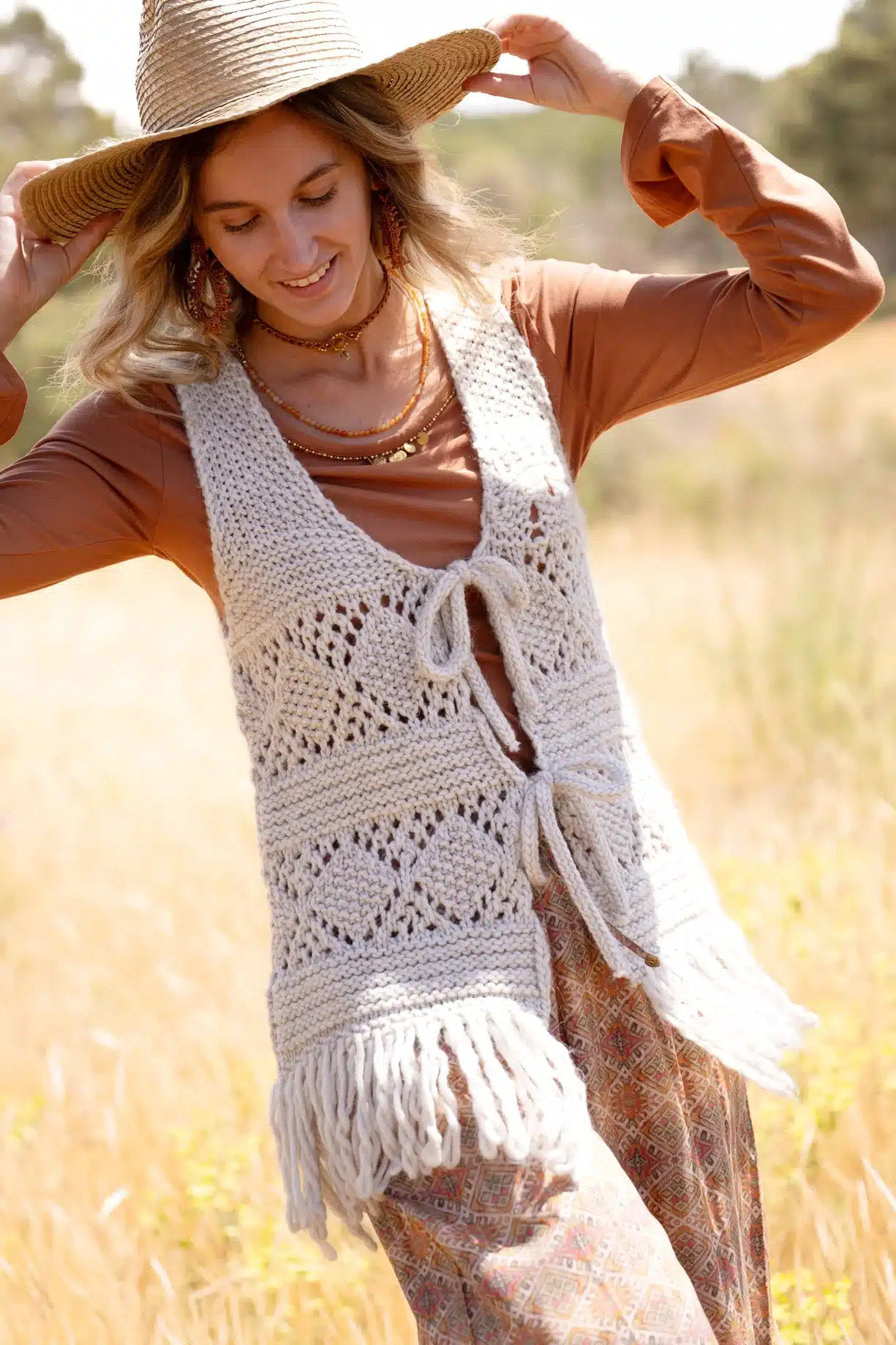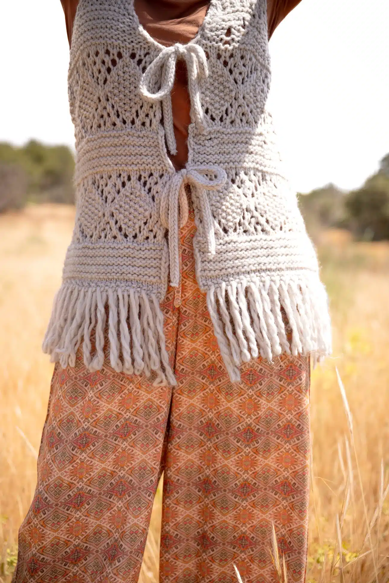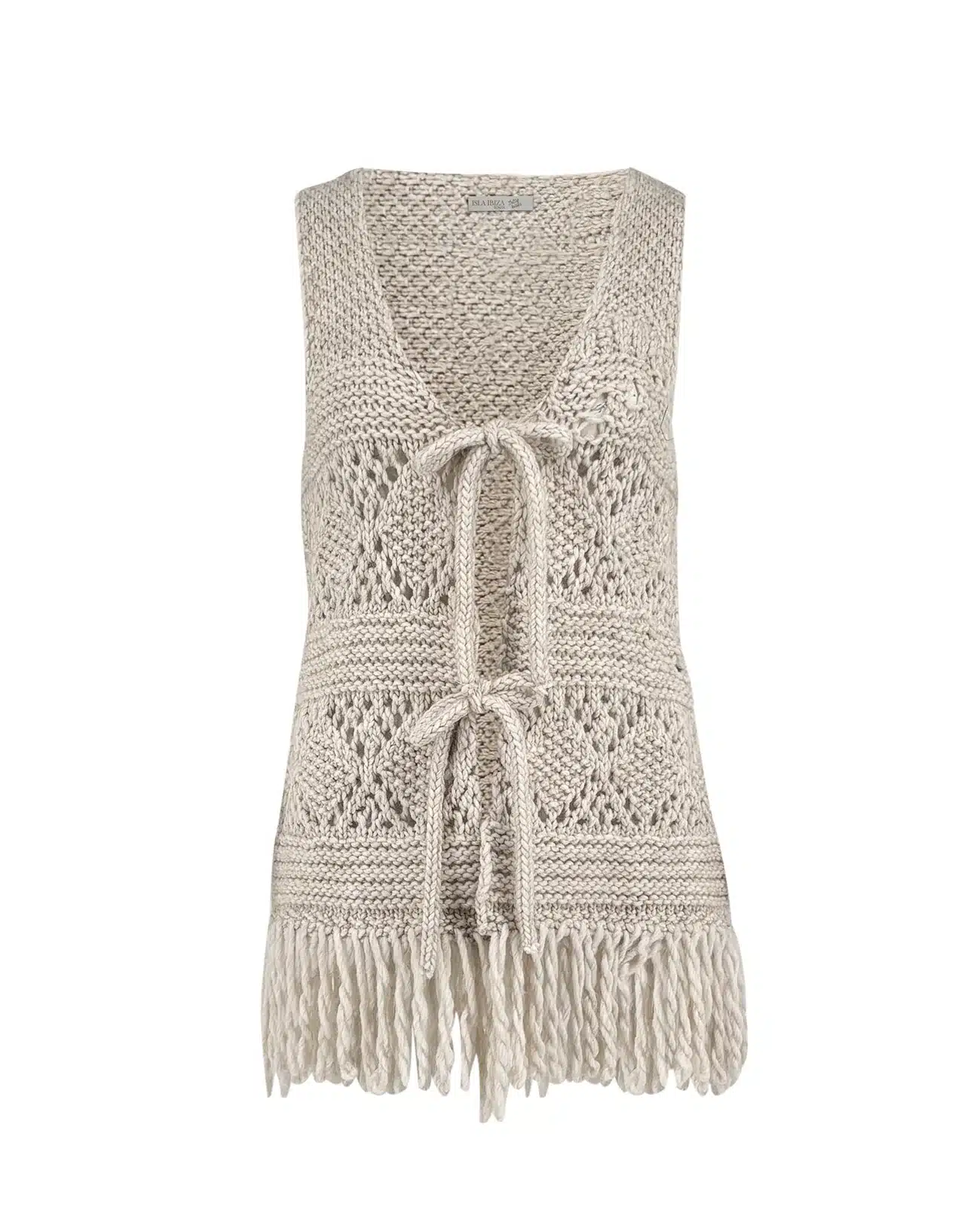 Product gegevens: Gebreid gilet met franjes, striksluiting aan de voorkant, heeft een gebreid dessin