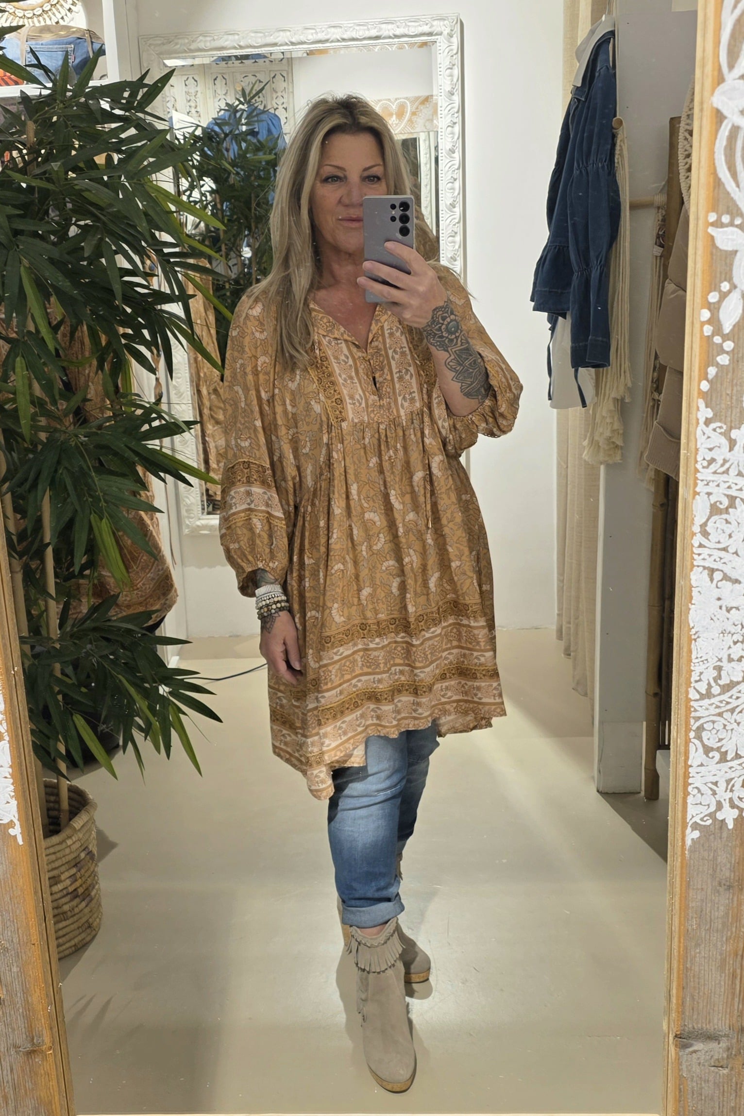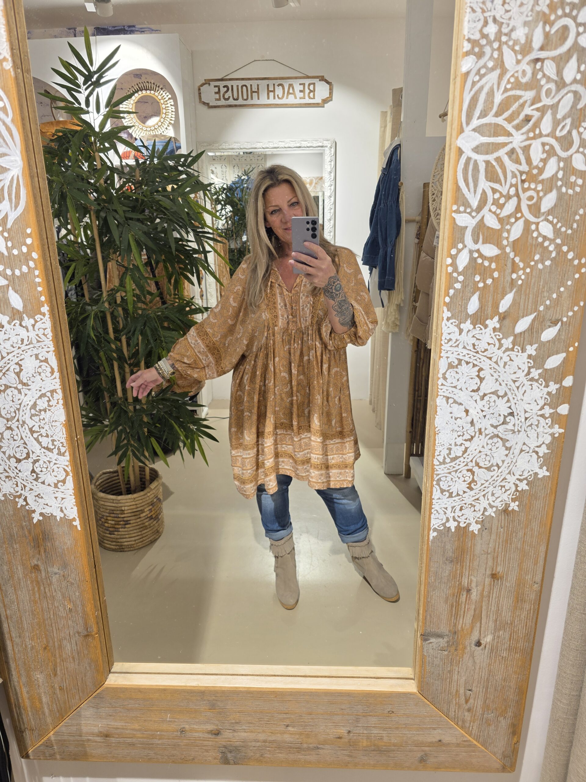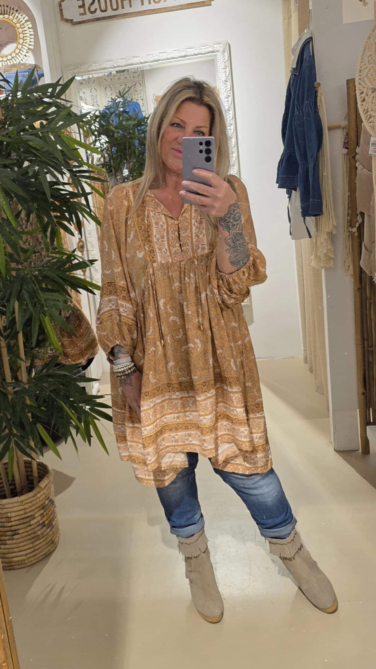 Jaase, een geweldig Australisch merk , prachtige kwaliteit, geheel natuurlijk materiaal met een vleugje bamboe, draagt heerlijk en blijft mooi, romantic bohemien brand, dit is een wijd vallende jurk/tuniek met een mooie bloemenprint, trendy met een paar boots of leuke sandaal, deze vallen qua model erg ruim, hou daar rekening mee.