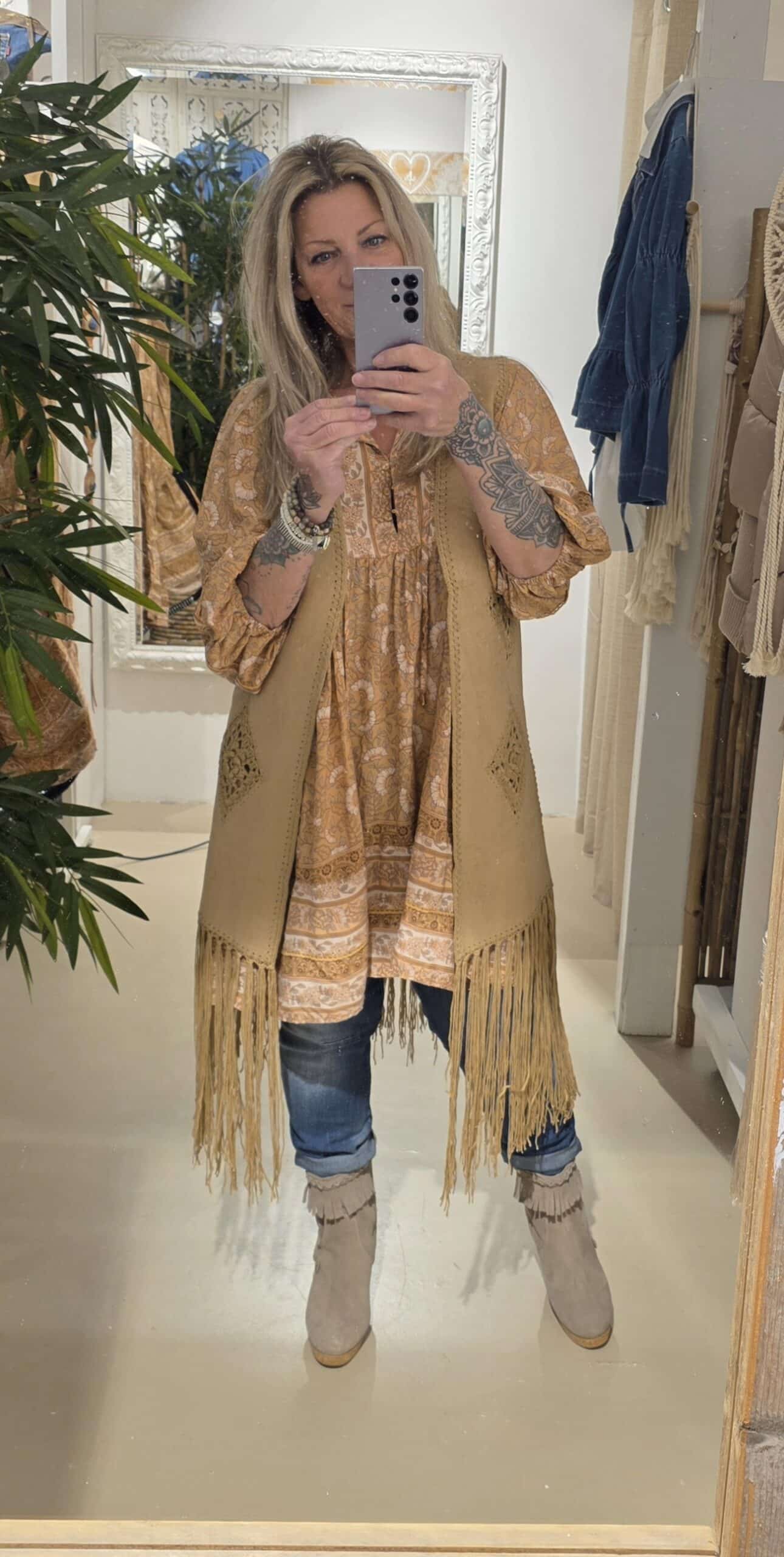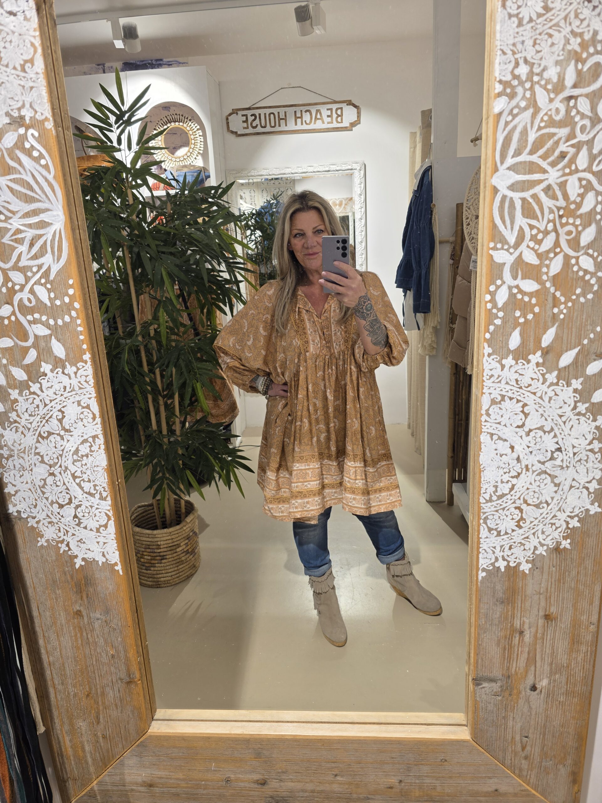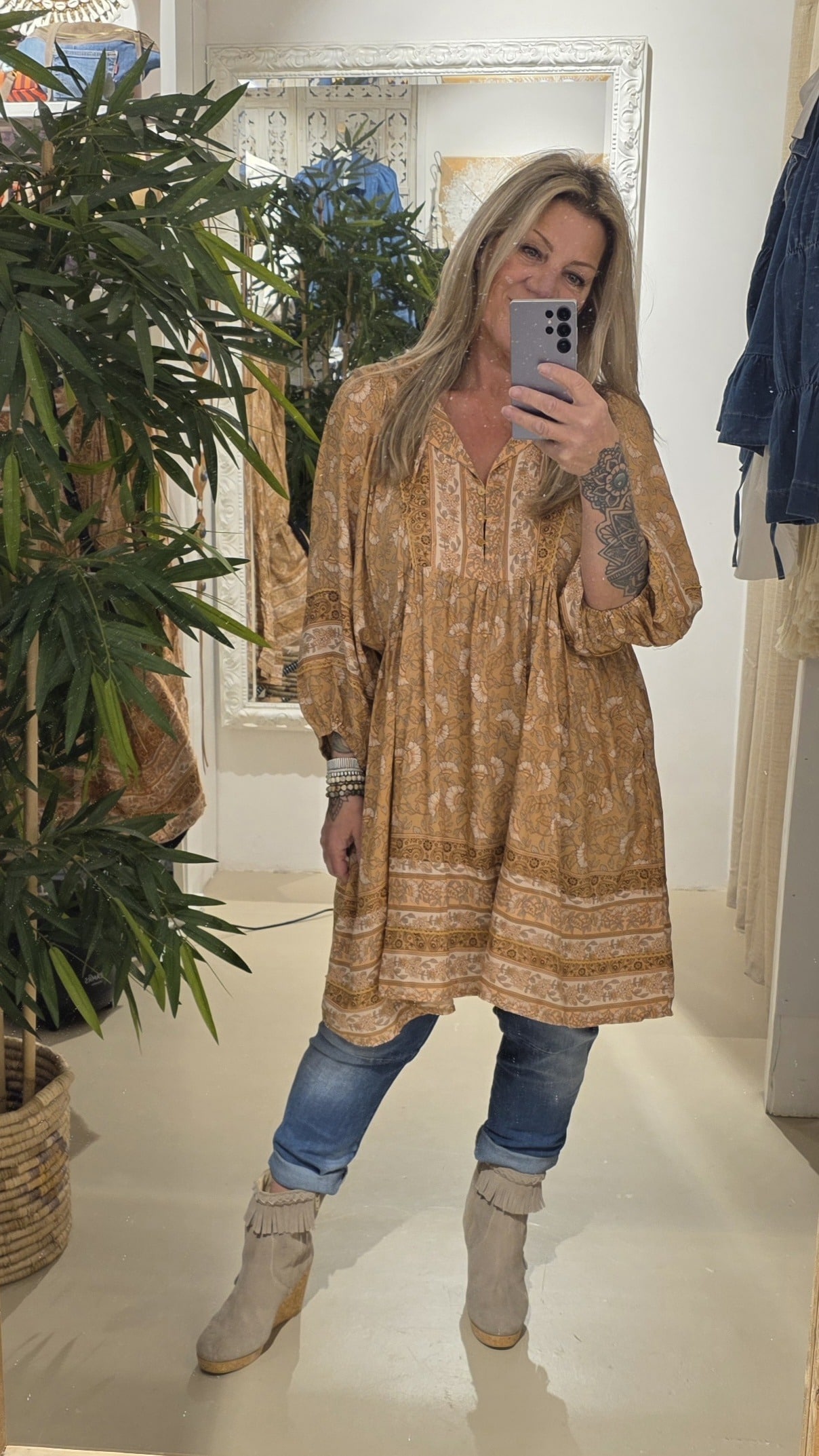Jaase, een geweldig Australisch merk , prachtige kwaliteit, geheel natuurlijk materiaal met een vleugje bamboe, draagt heerlijk en blijft mooi, romantic bohemien brand, dit is een wijd vallende jurk/tuniek met een mooie bloemenprint, trendy met een paar boots of leuke sandaal, deze vallen qua model erg ruim, hou daar rekening mee.