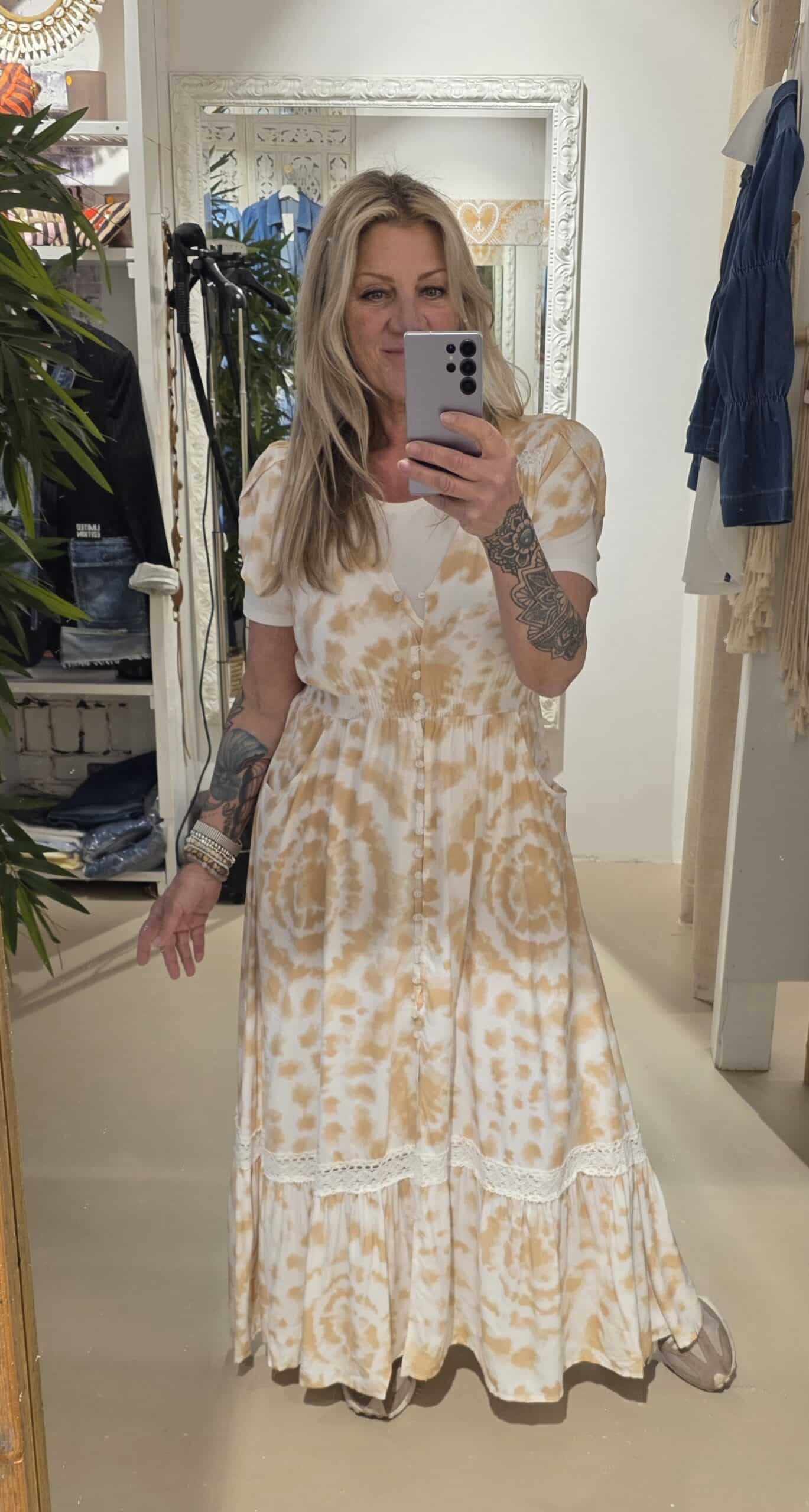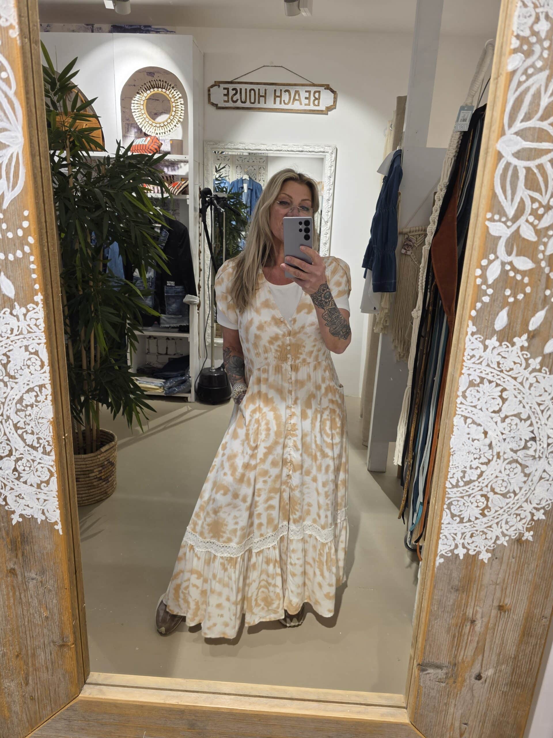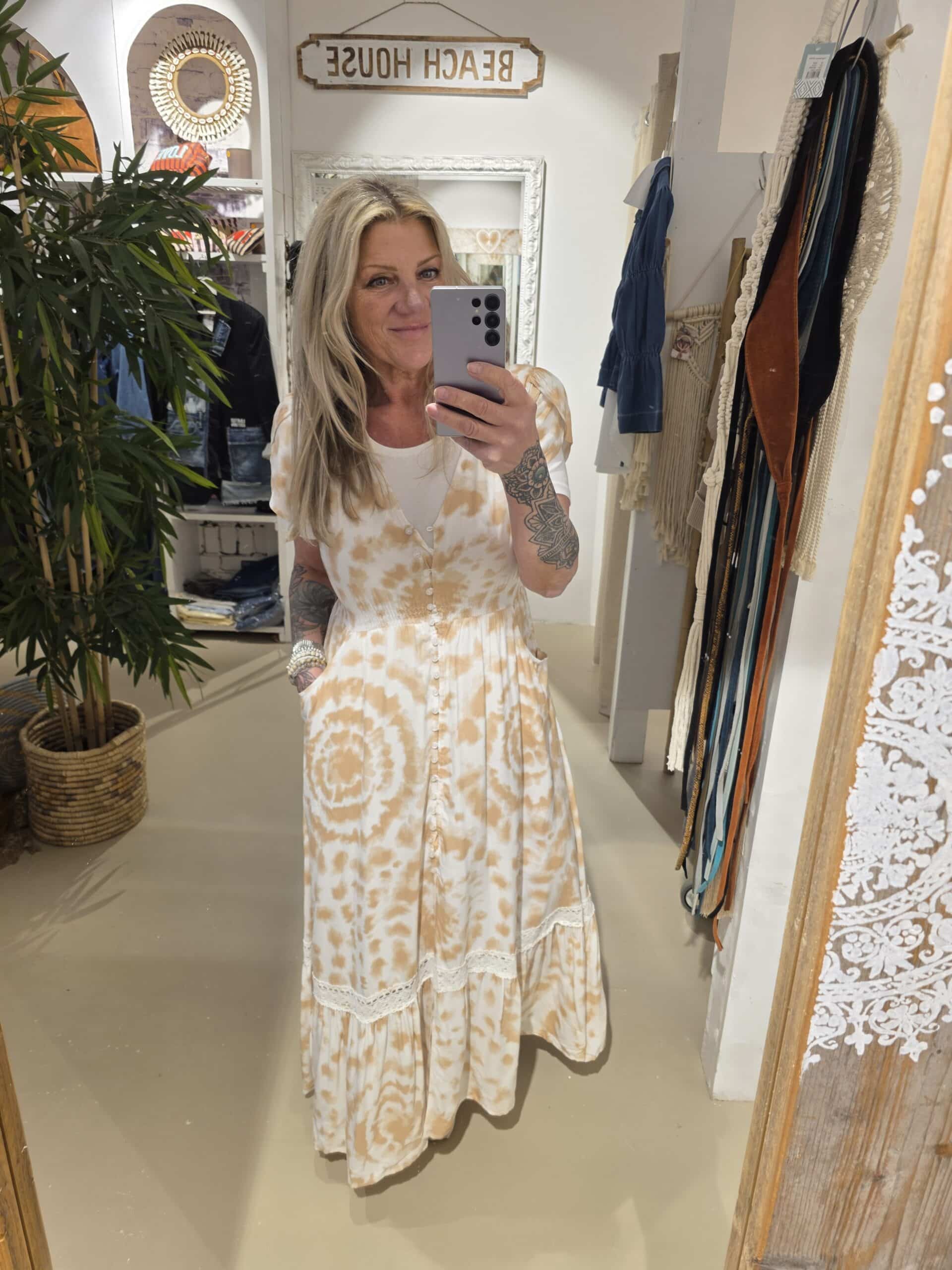 Prachtige jurk van een prachtig Australisch merk, geheel natuurlijk materiaal, met vleugje bamboe, mooi lijfje , knoopjes tot dexsplit net over de knie, mooie maxi lengte én kort mouwtje met elastische taille, jaase valt een maat groter.