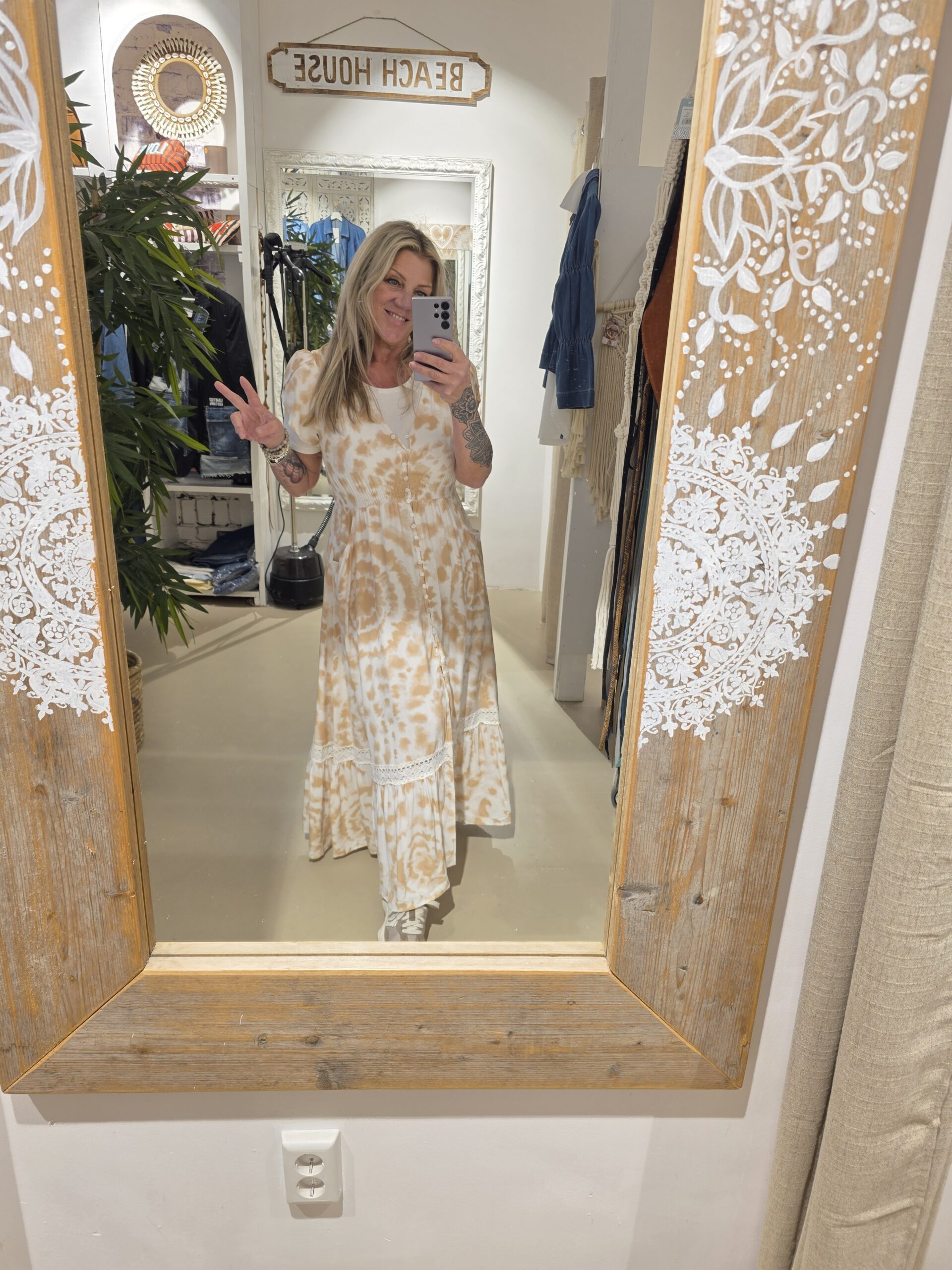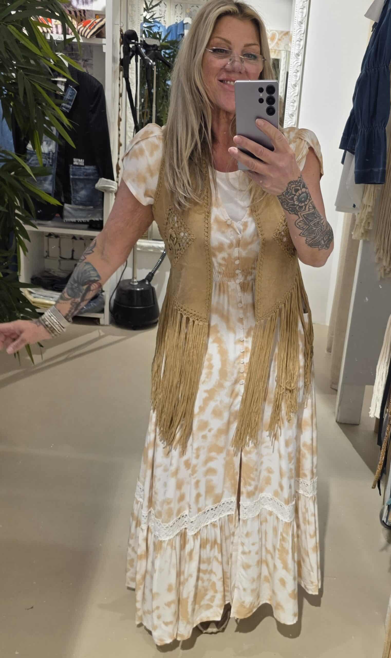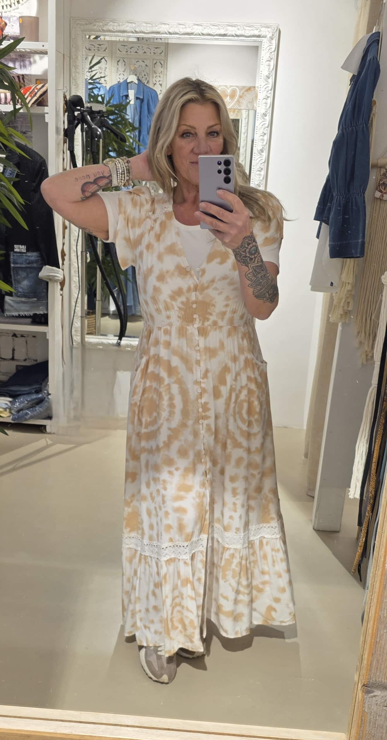 Prachtige jurk van een prachtig Australisch merk, geheel natuurlijk materiaal, met vleugje bamboe, mooi lijfje , knoopjes tot dexsplit net over de knie, mooie maxi lengte én kort mouwtje met elastische taille, jaase valt een maat groter.