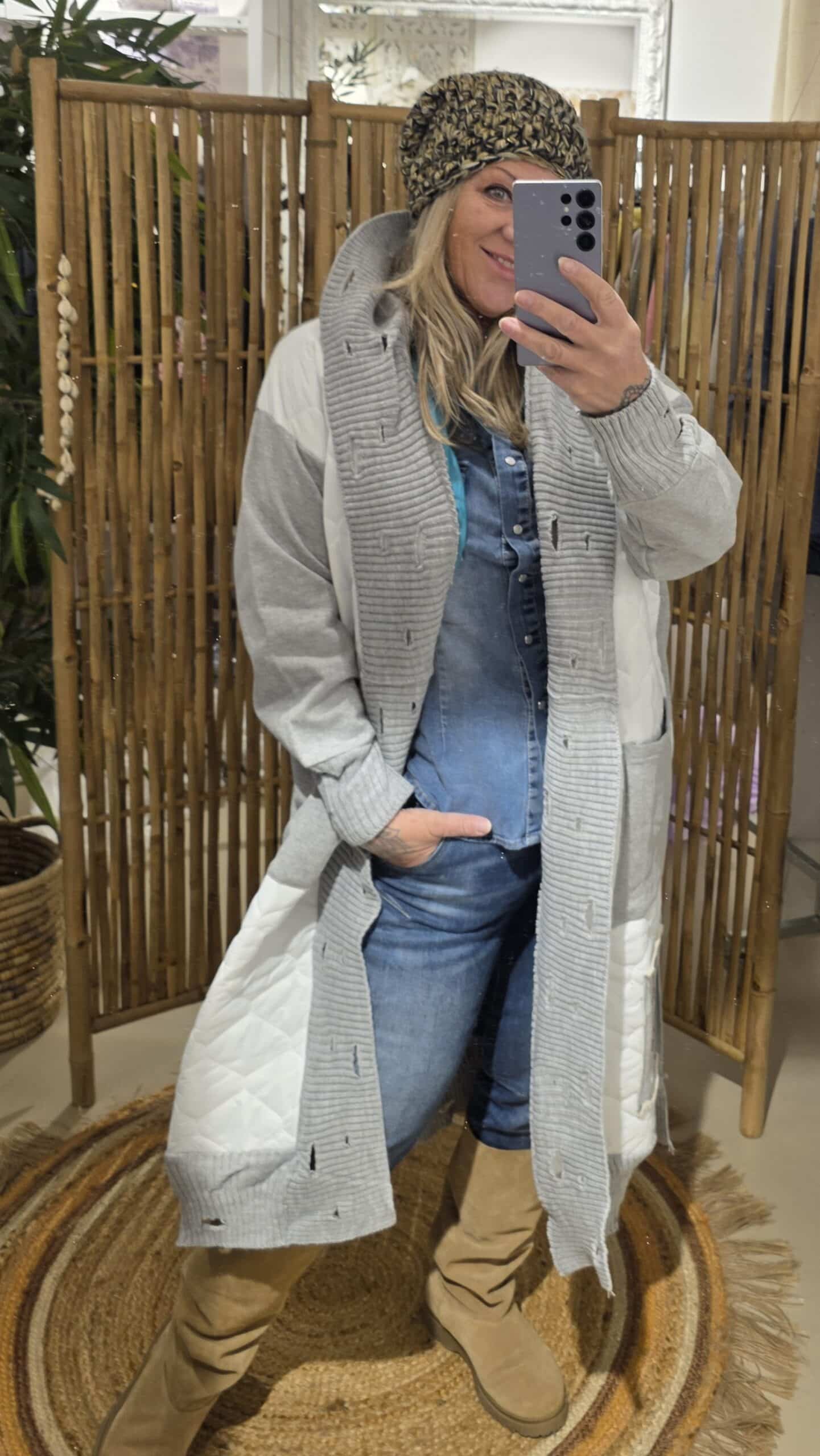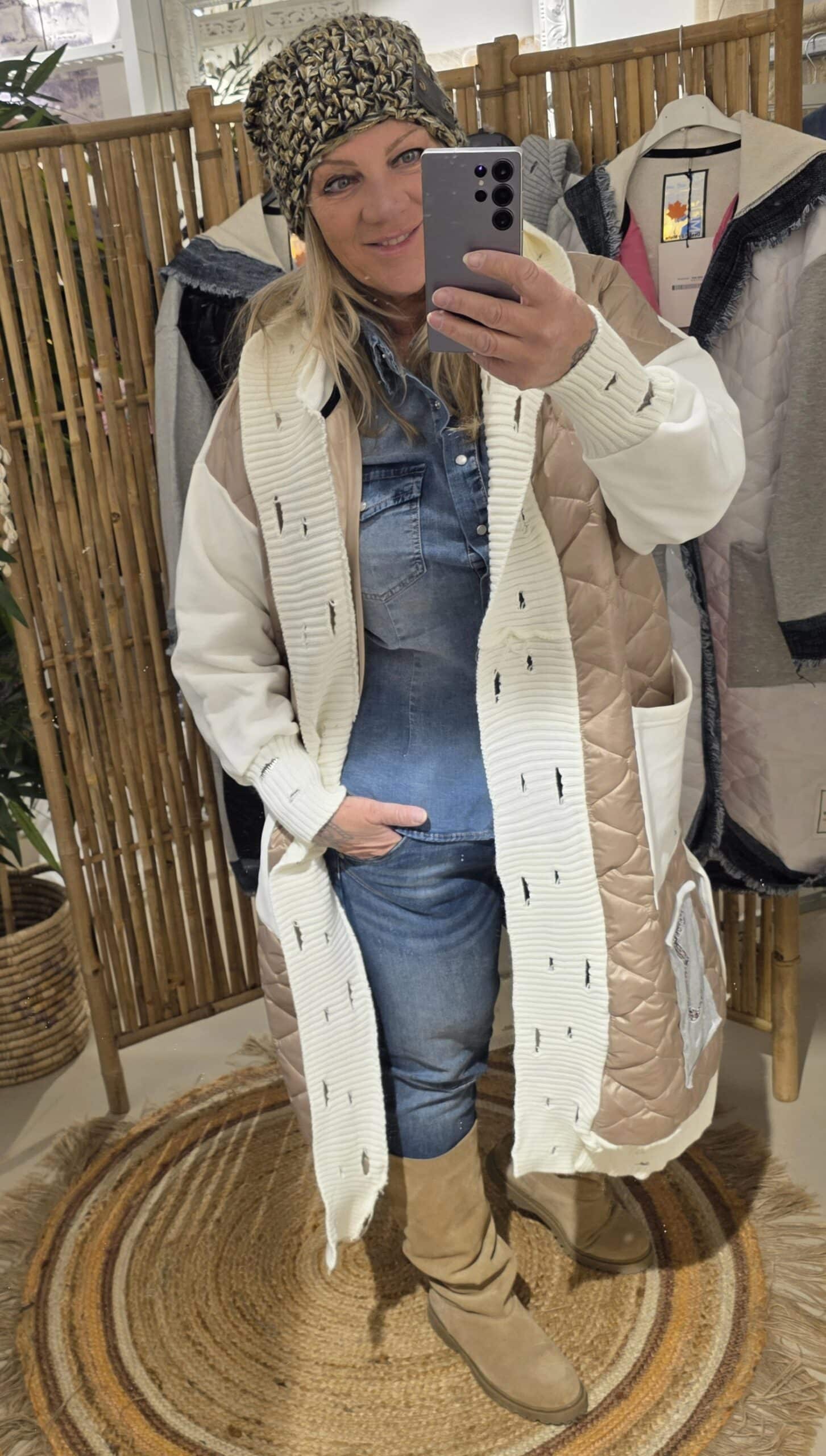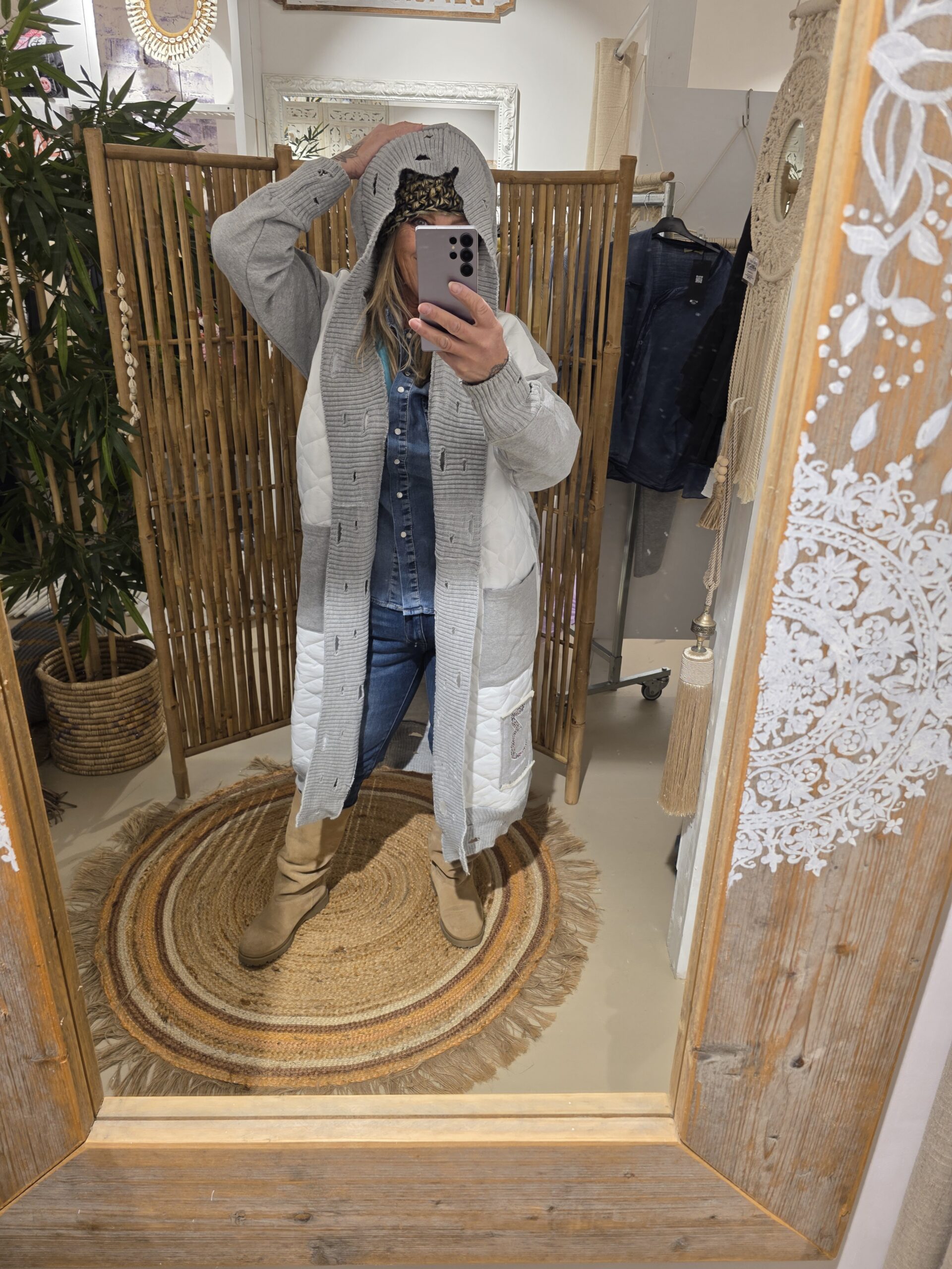Zo stoer en trendy deze gave jas. Afgewerkt met diverse stofjes destressed details in de randen, met capuchon,  geen sluiting, je laat hem lekker oversized hangen, één maat valt ruim, klein strass detail op de jeans zak beneden aan de jas, zo uniek deze jassen.
