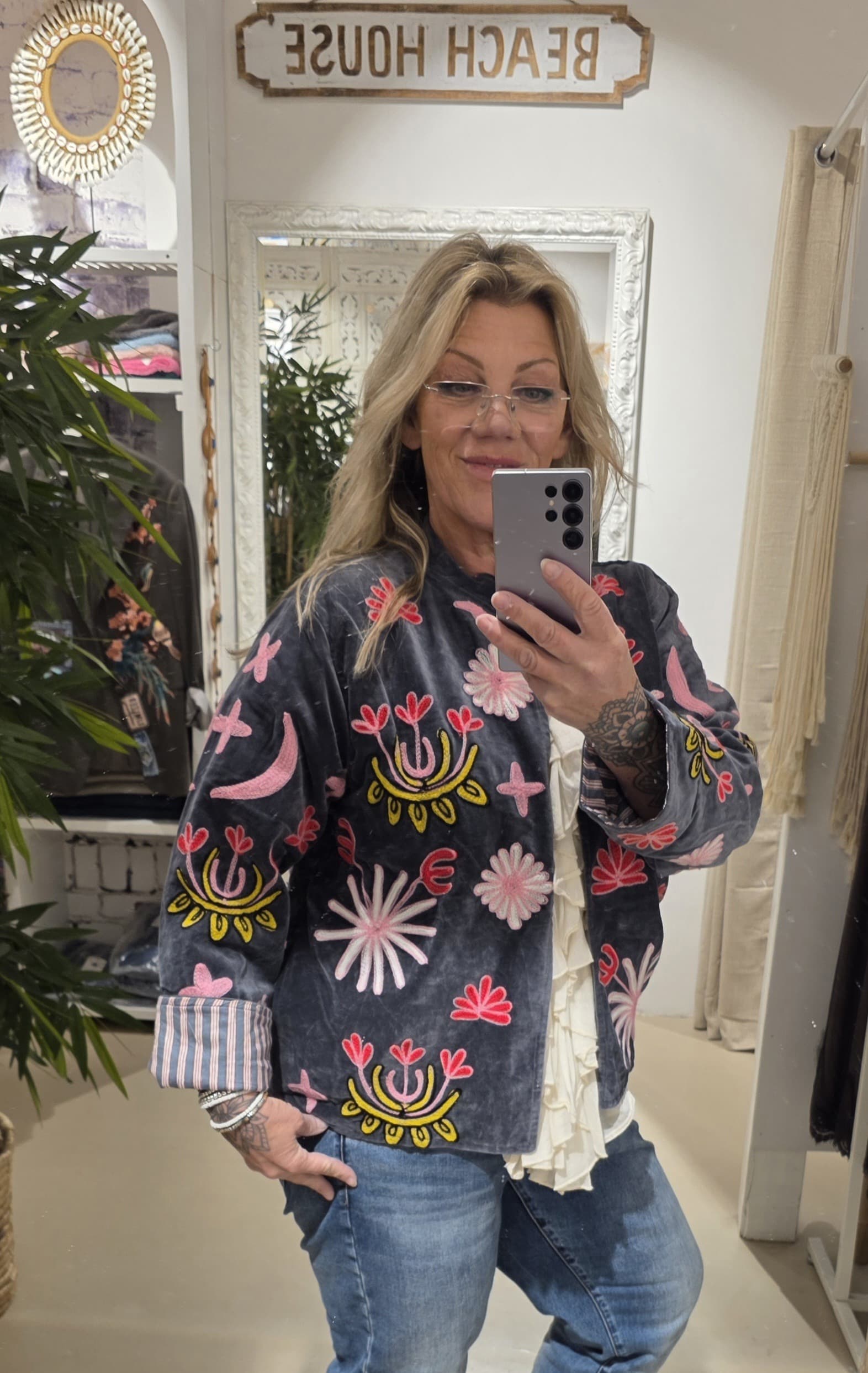 Prachtig jasje, hand geborduurd en gevoerd met een leuke streep voering, één maat, past tot 44, recht model, een echte leukerd met die mooie kleuren.
