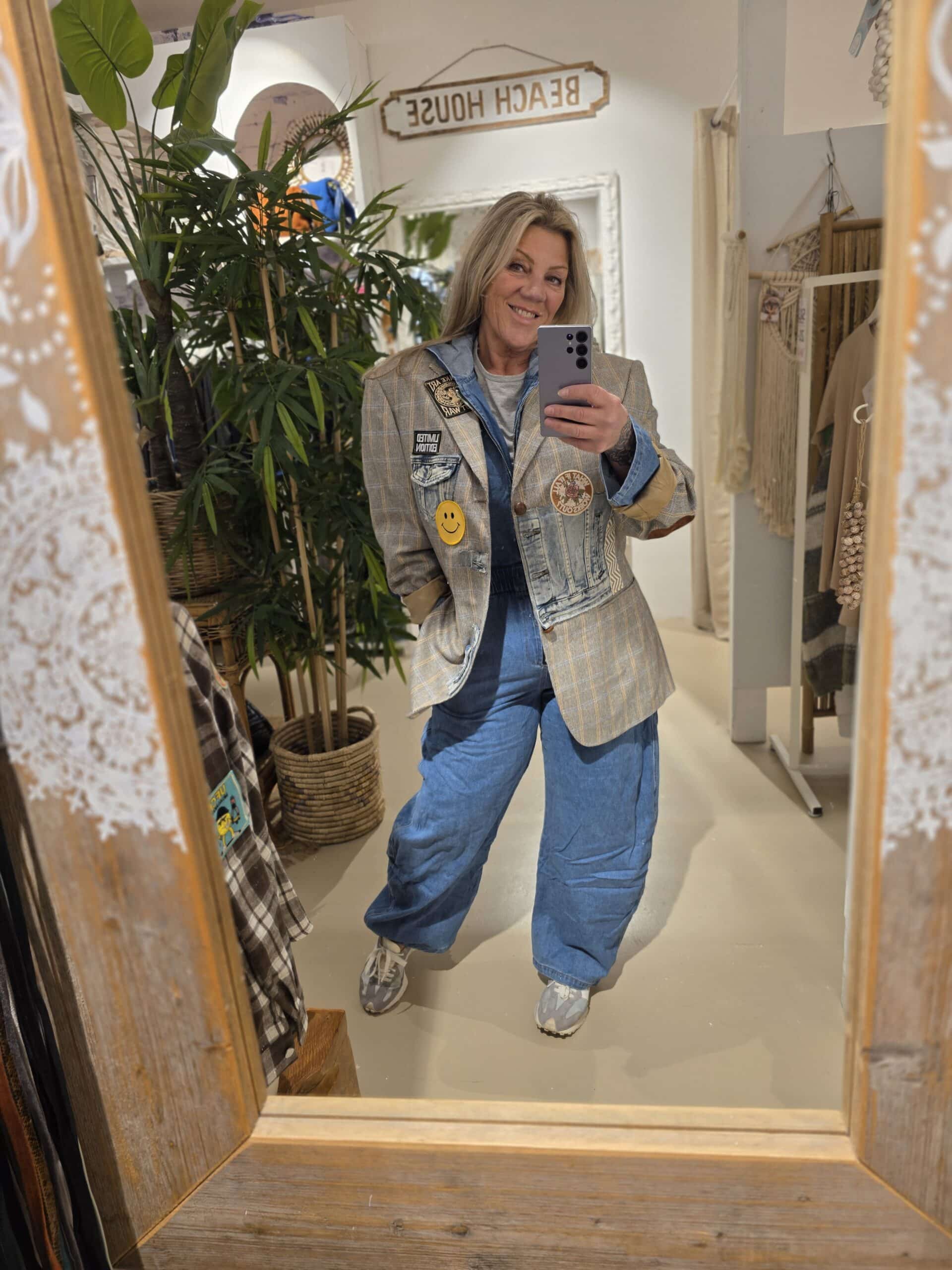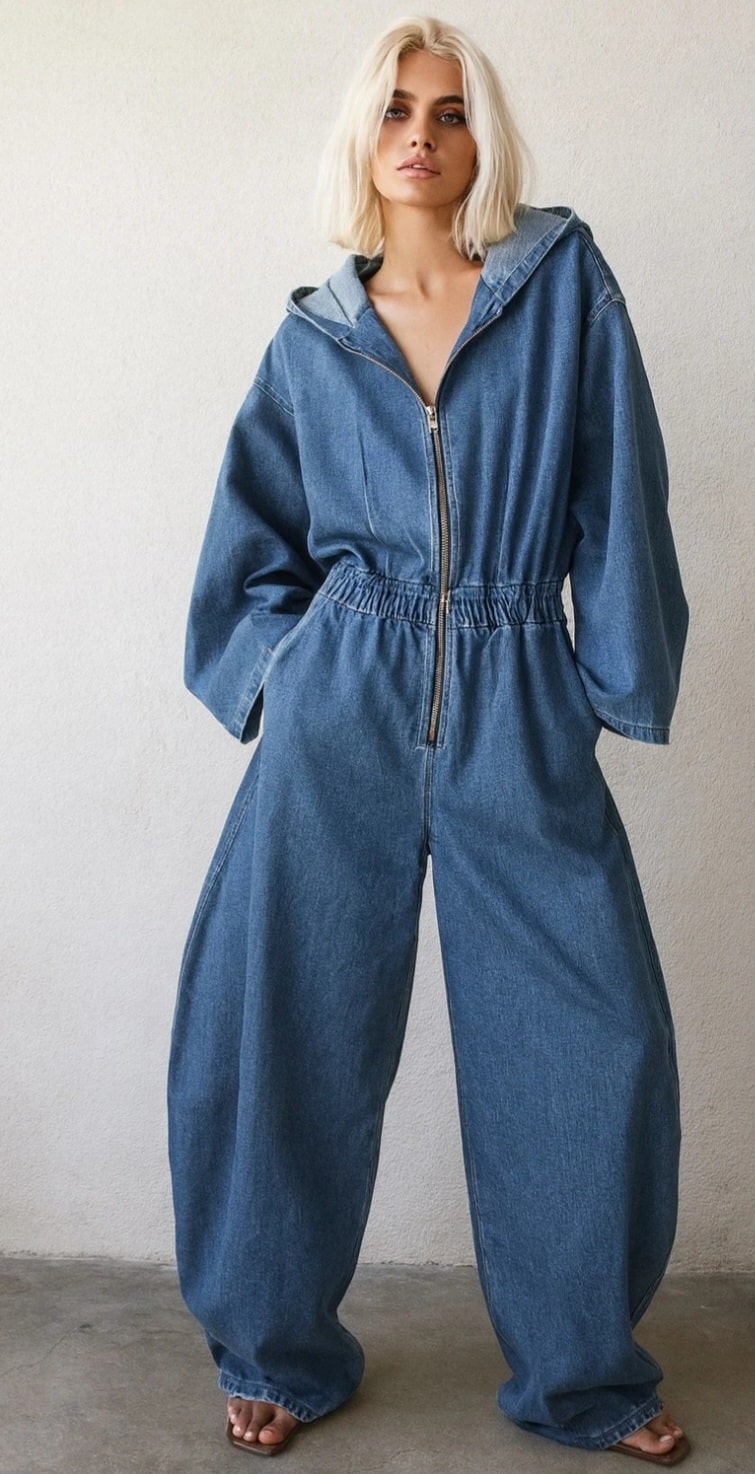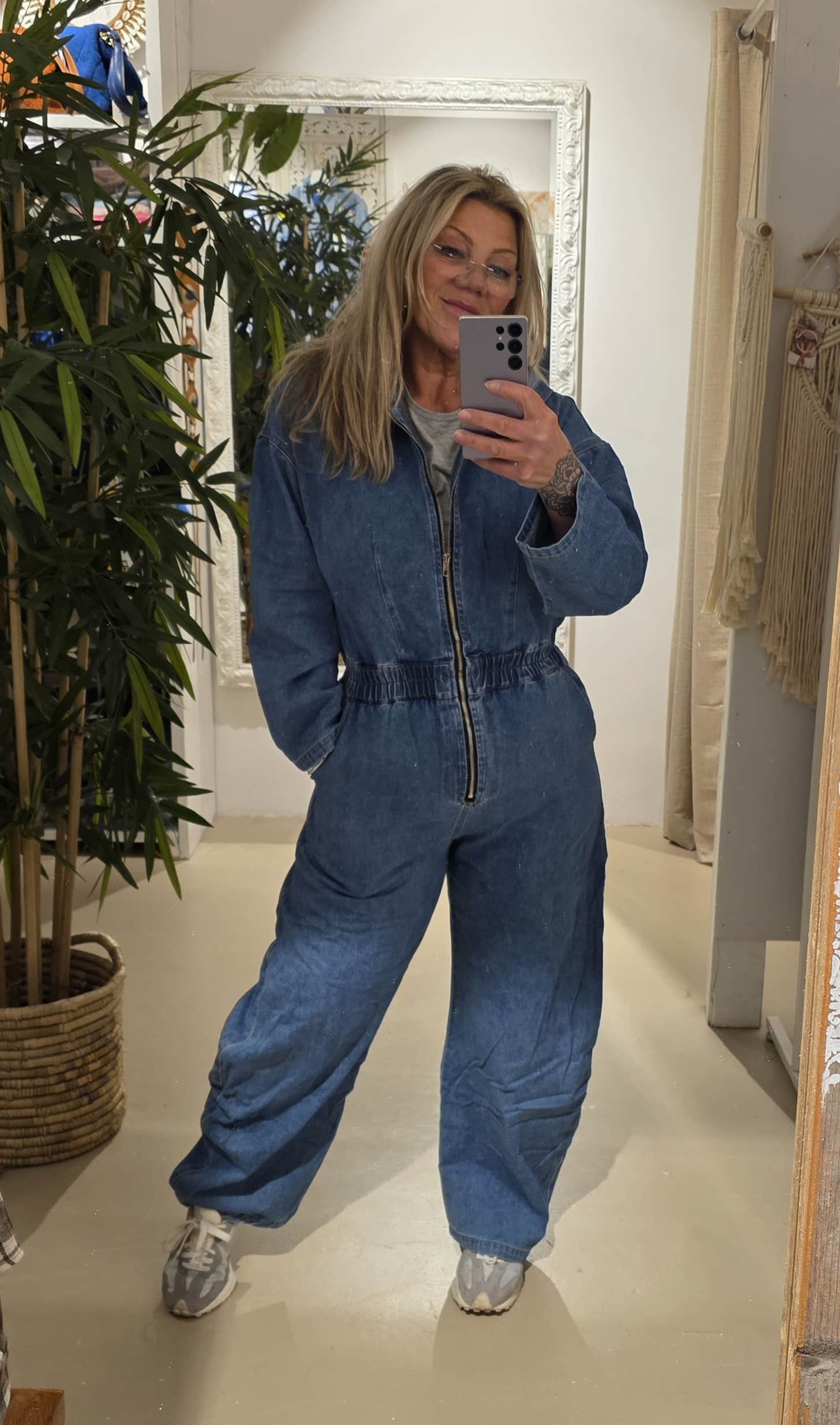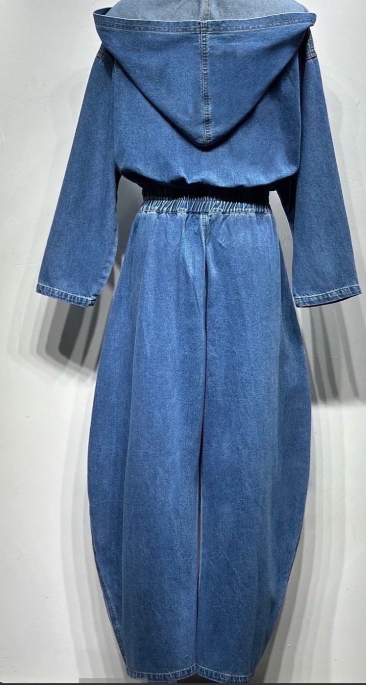 Super leuke jumpsuit met capuchon en rits, Barrel model, leuke wassing, elastische taille m/l past tot maat 44
