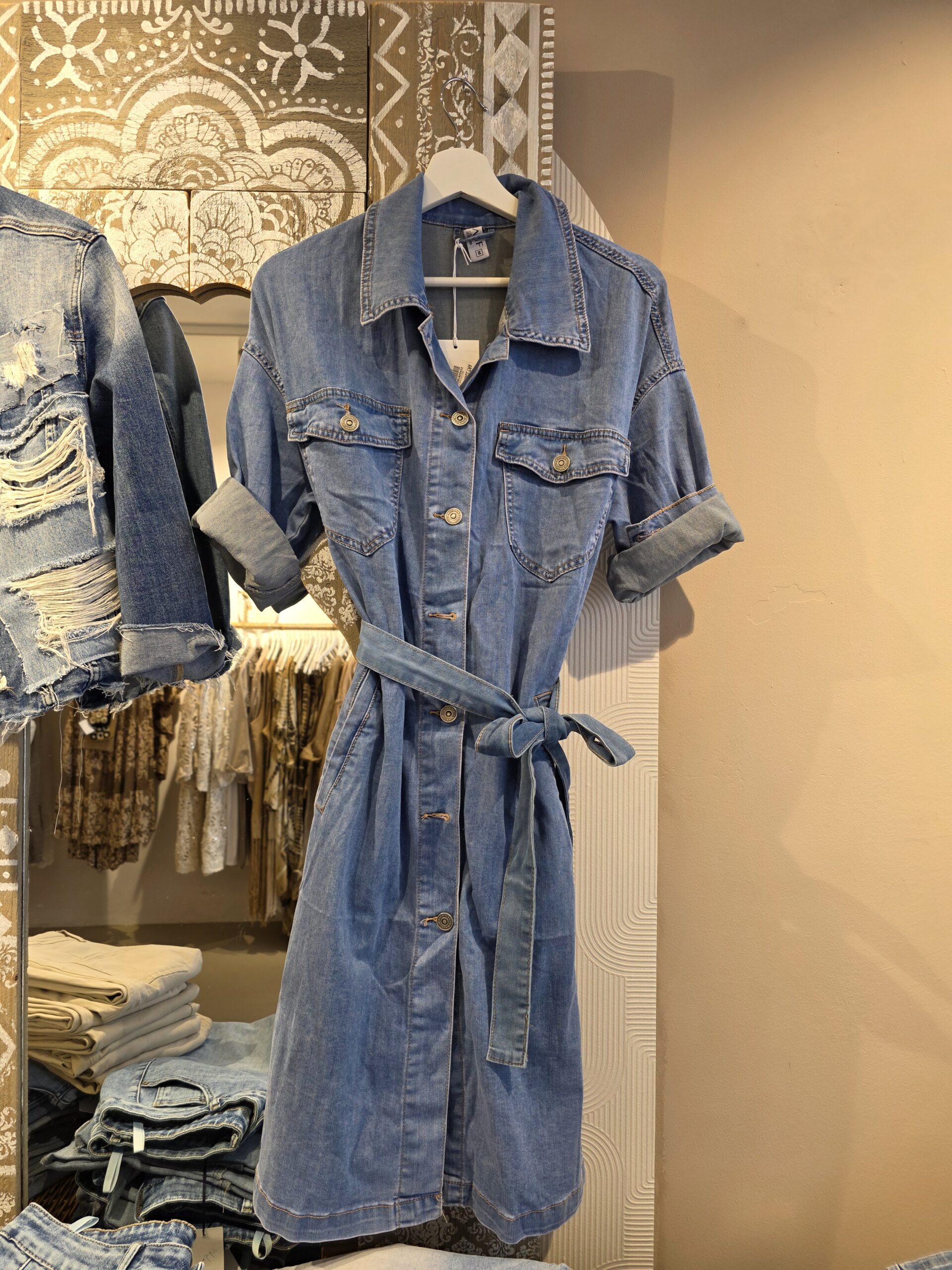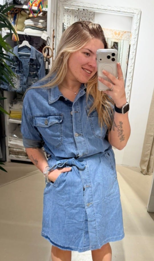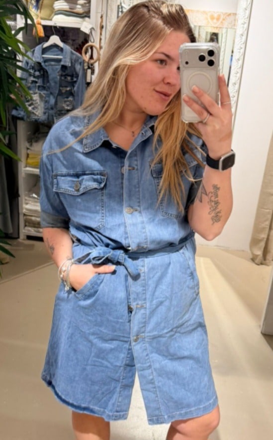 Lekkere soepele stonewashed jeans stof, leuke doorknippen jurk, natuurlijk ook als jad te dragen, lange mouwen met bijpassende ceintuur