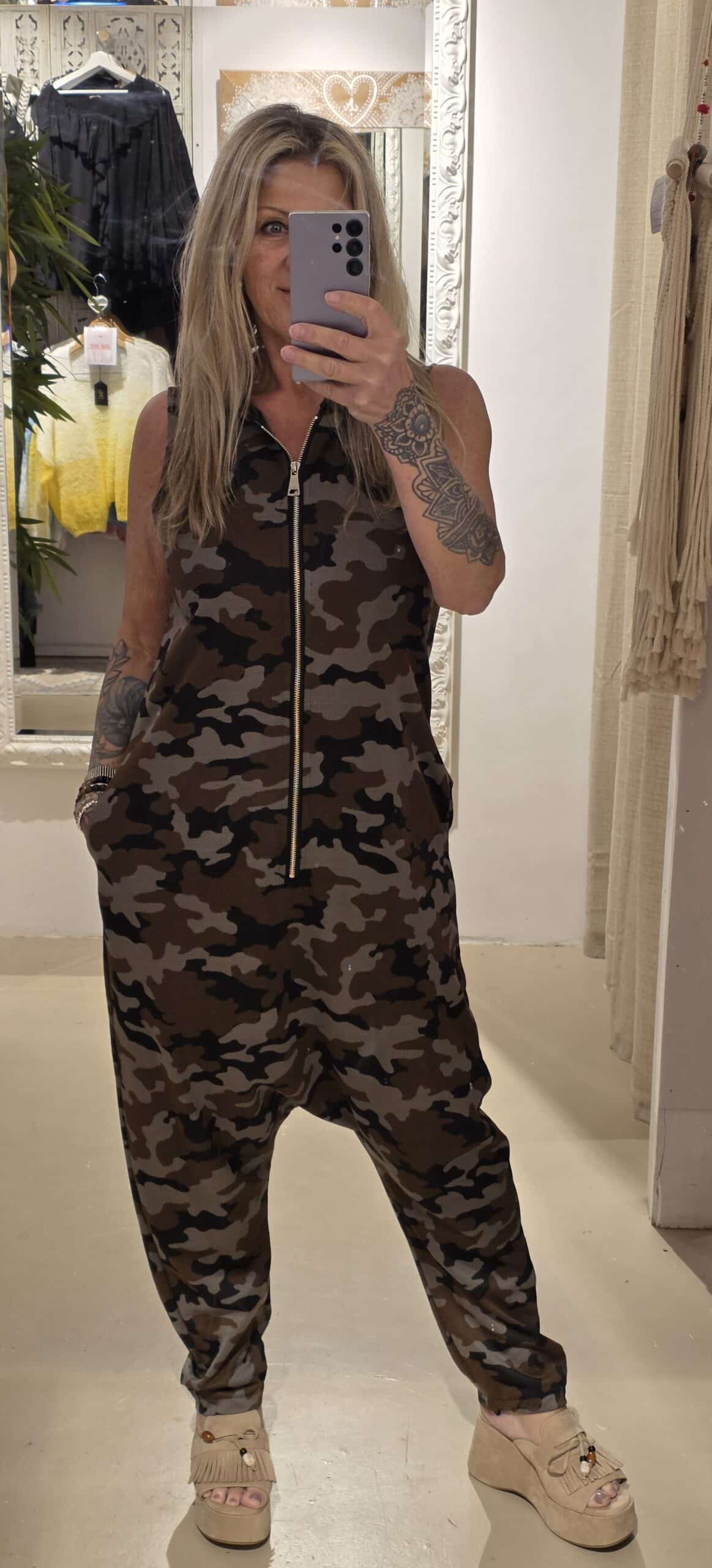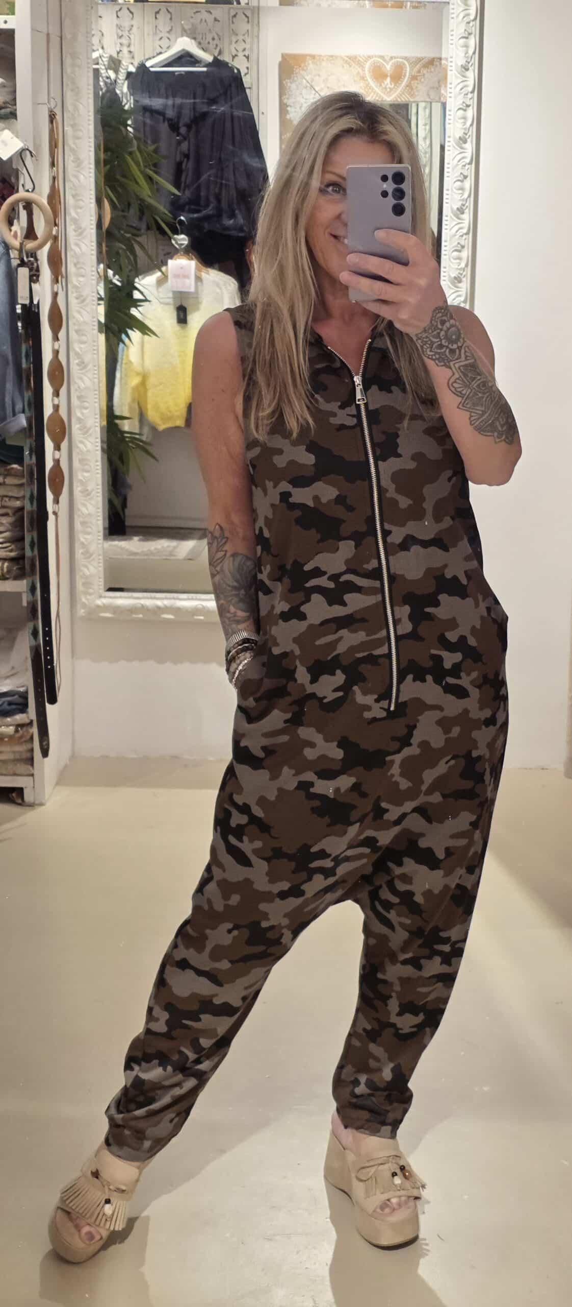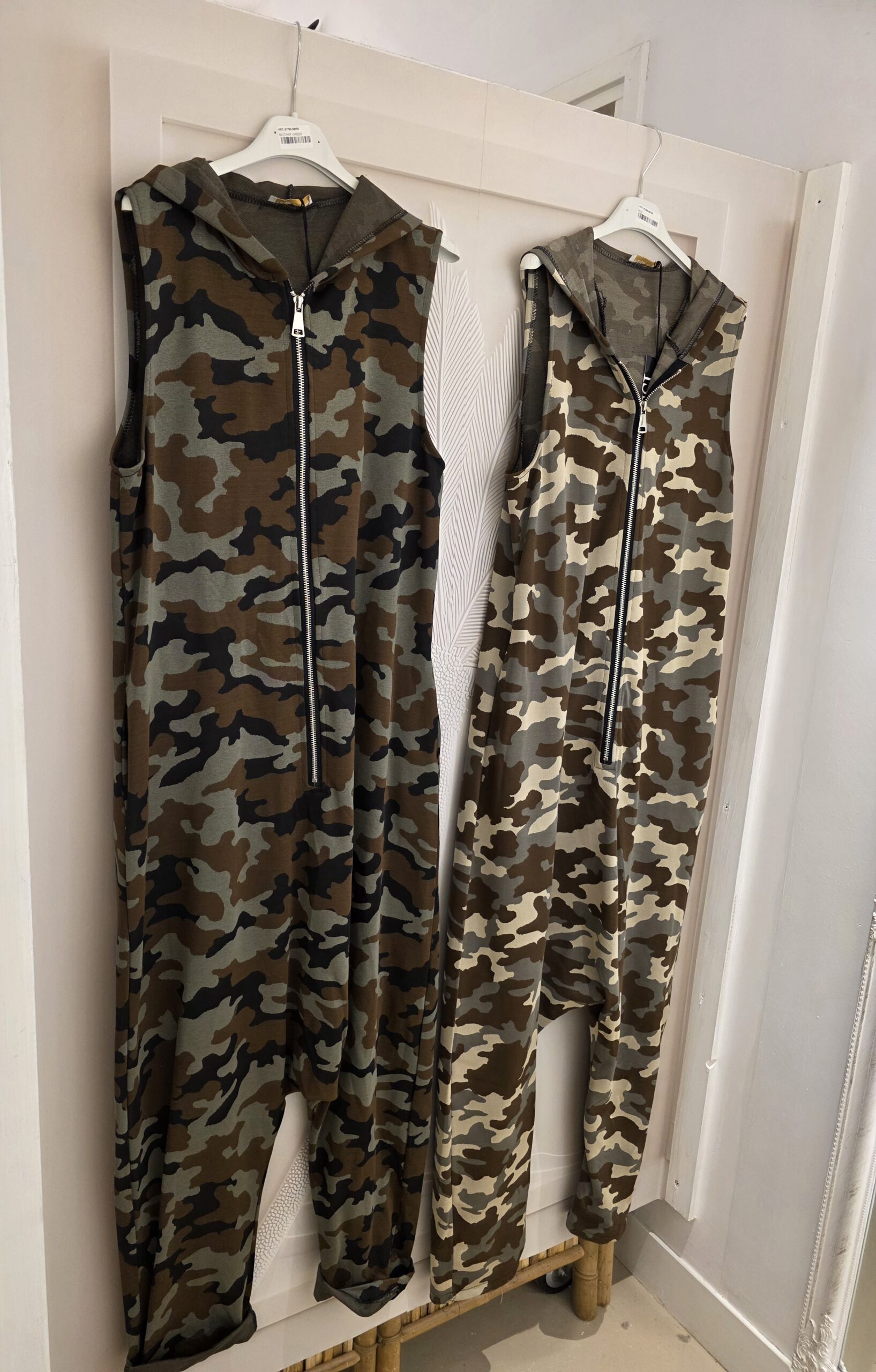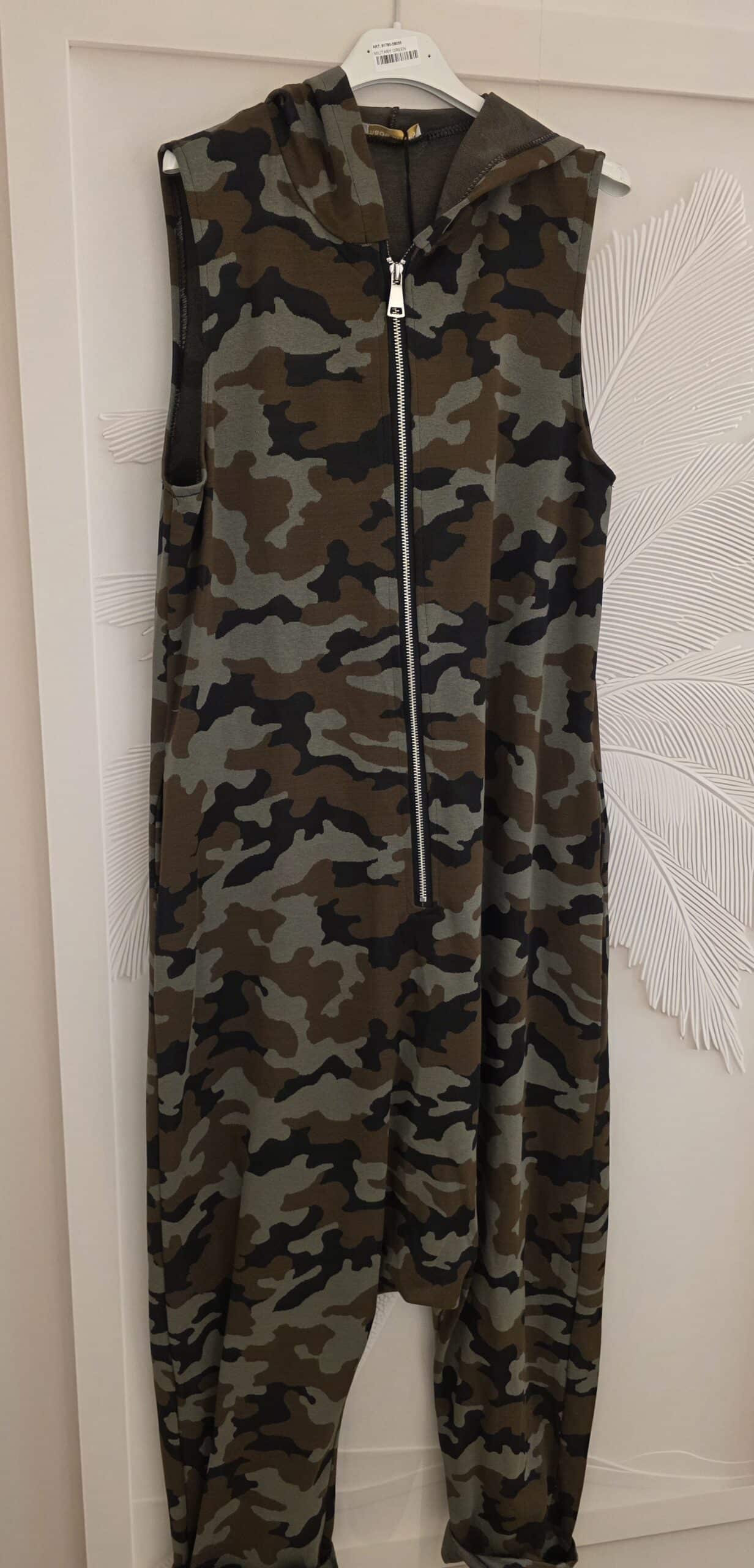 Van natuurlijk materiaal dit geweldige pak, jumpsuit met een laag kruis én rits, past tot zeker 44/46 het pak heeft een capuchon en is mouwloos, óók leuk te combineren met jeans jasje of stoere blazer.