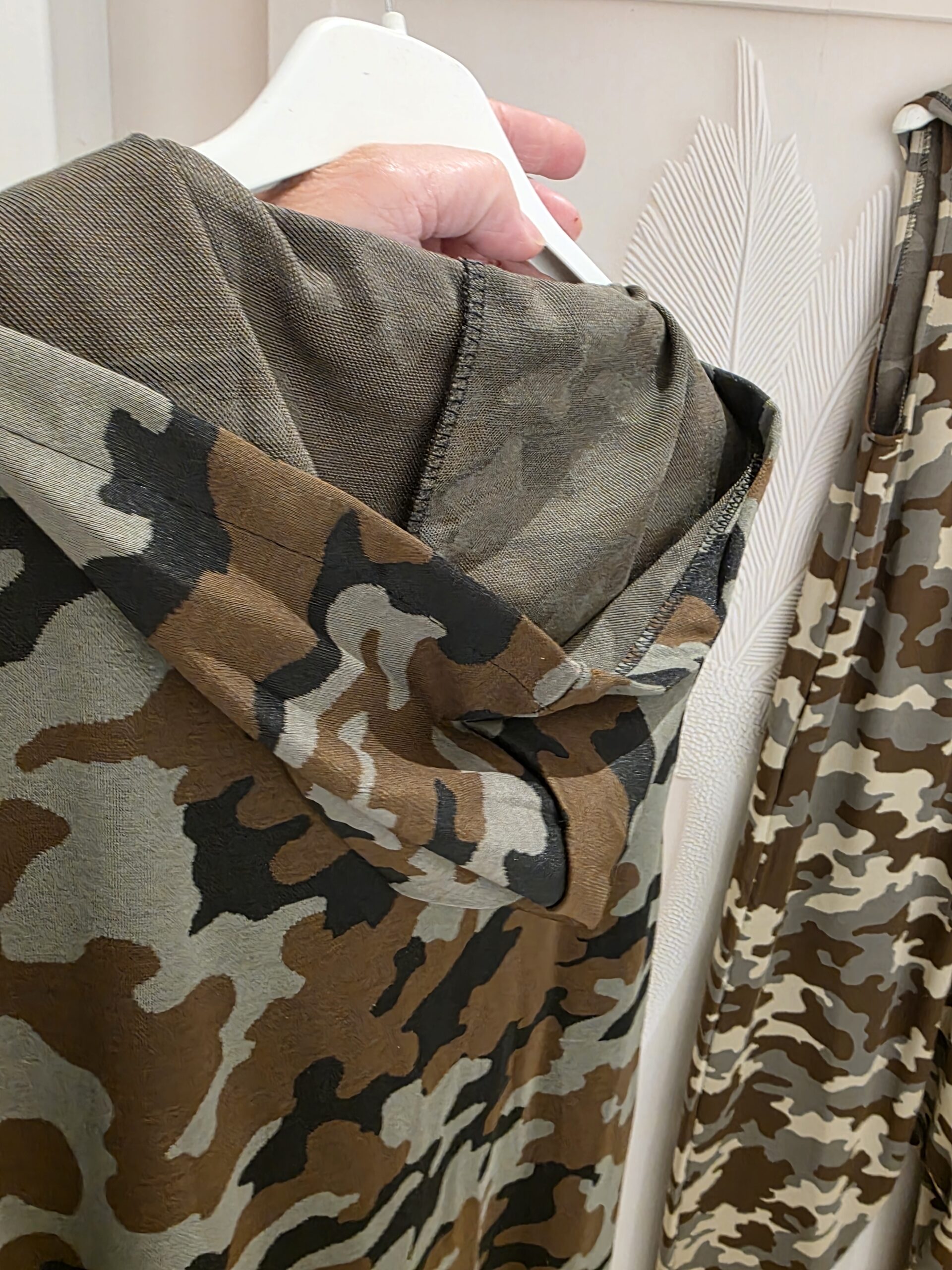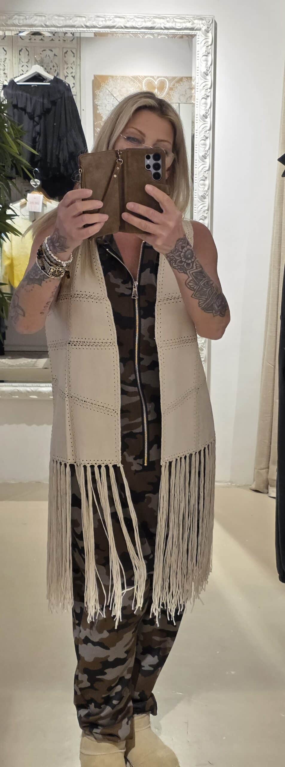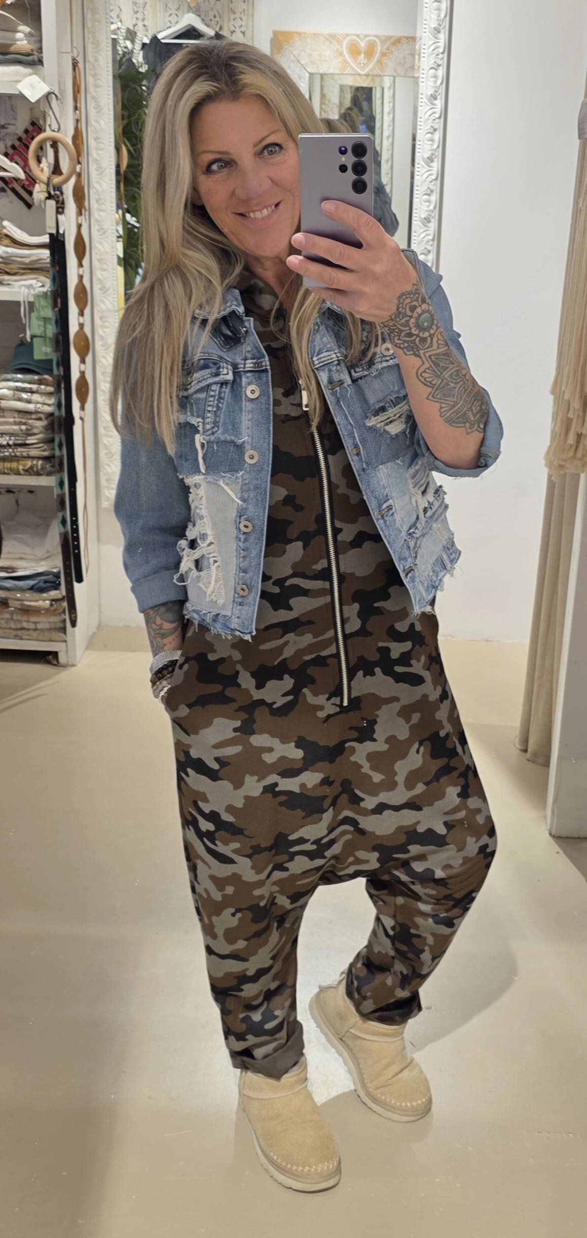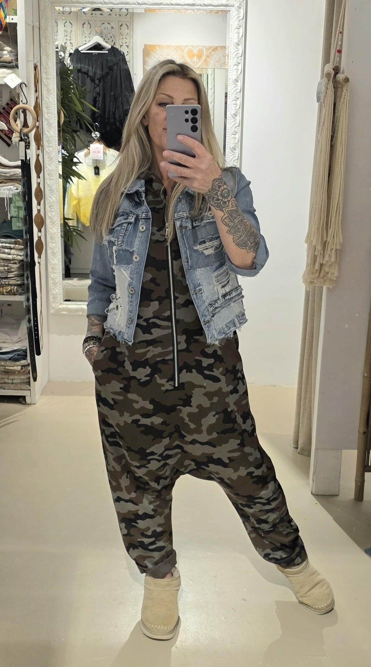 Van natuurlijk materiaal dit geweldige pak, jumpsuit met een laag kruis én rits, past tot zeker 44/46 het pak heeft een capuchon en is mouwloos, óók leuk te combineren met jeans jasje of stoere blazer.