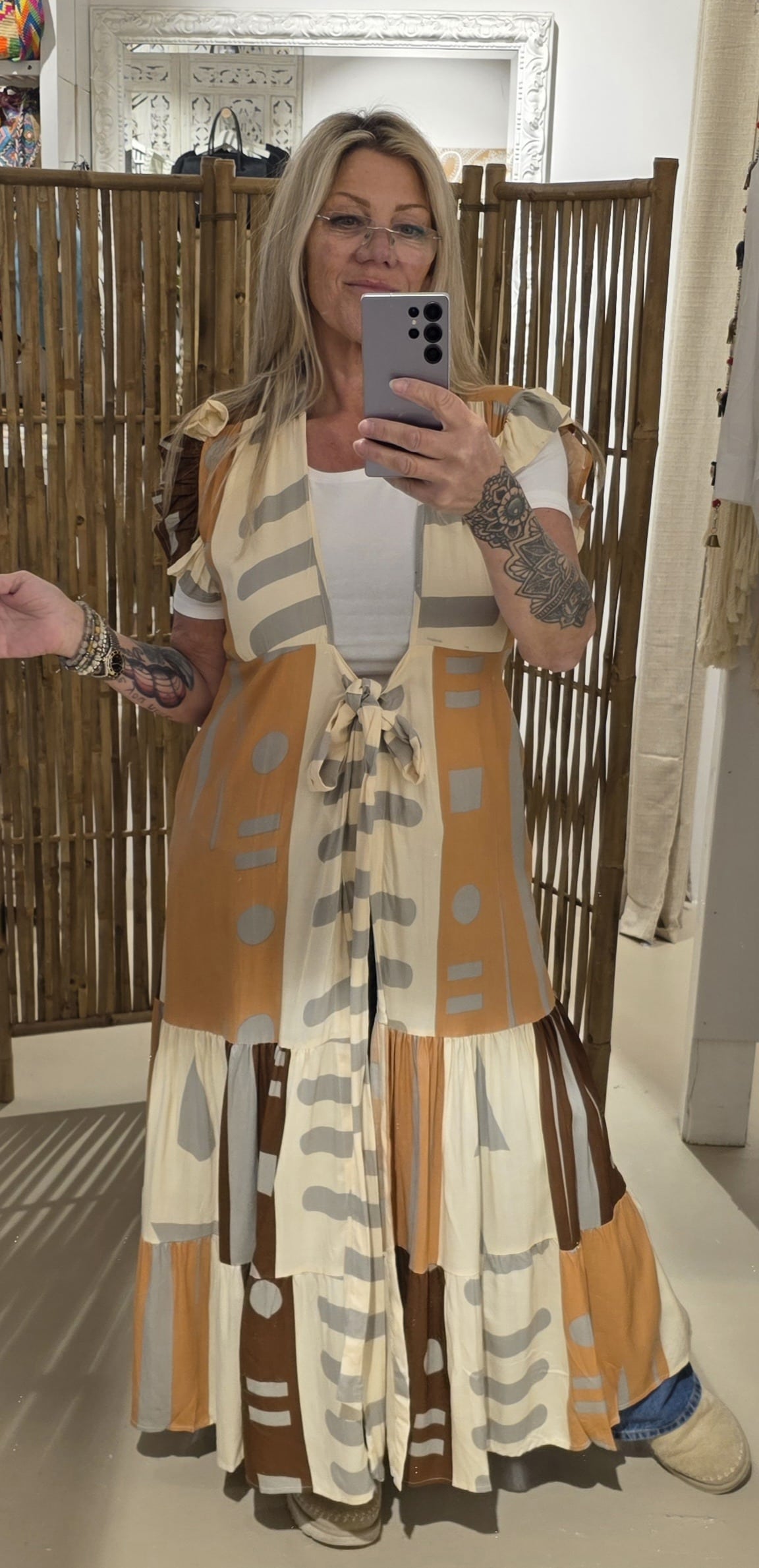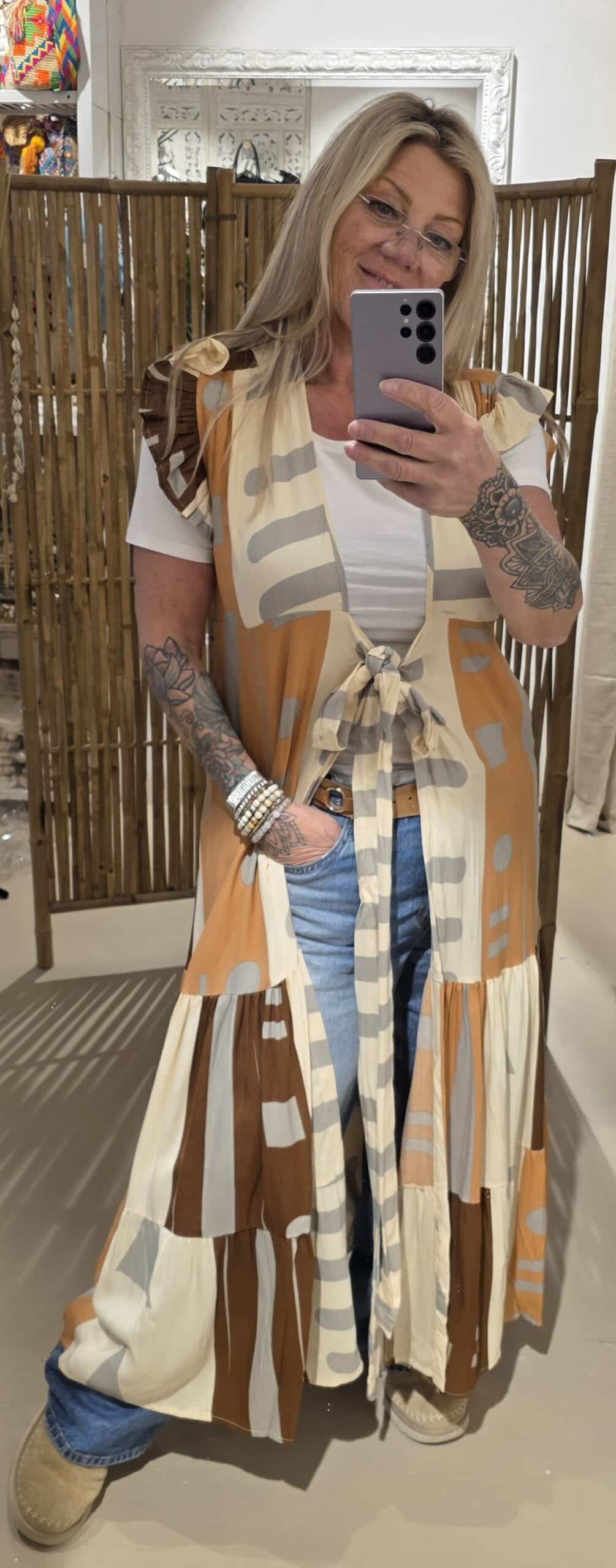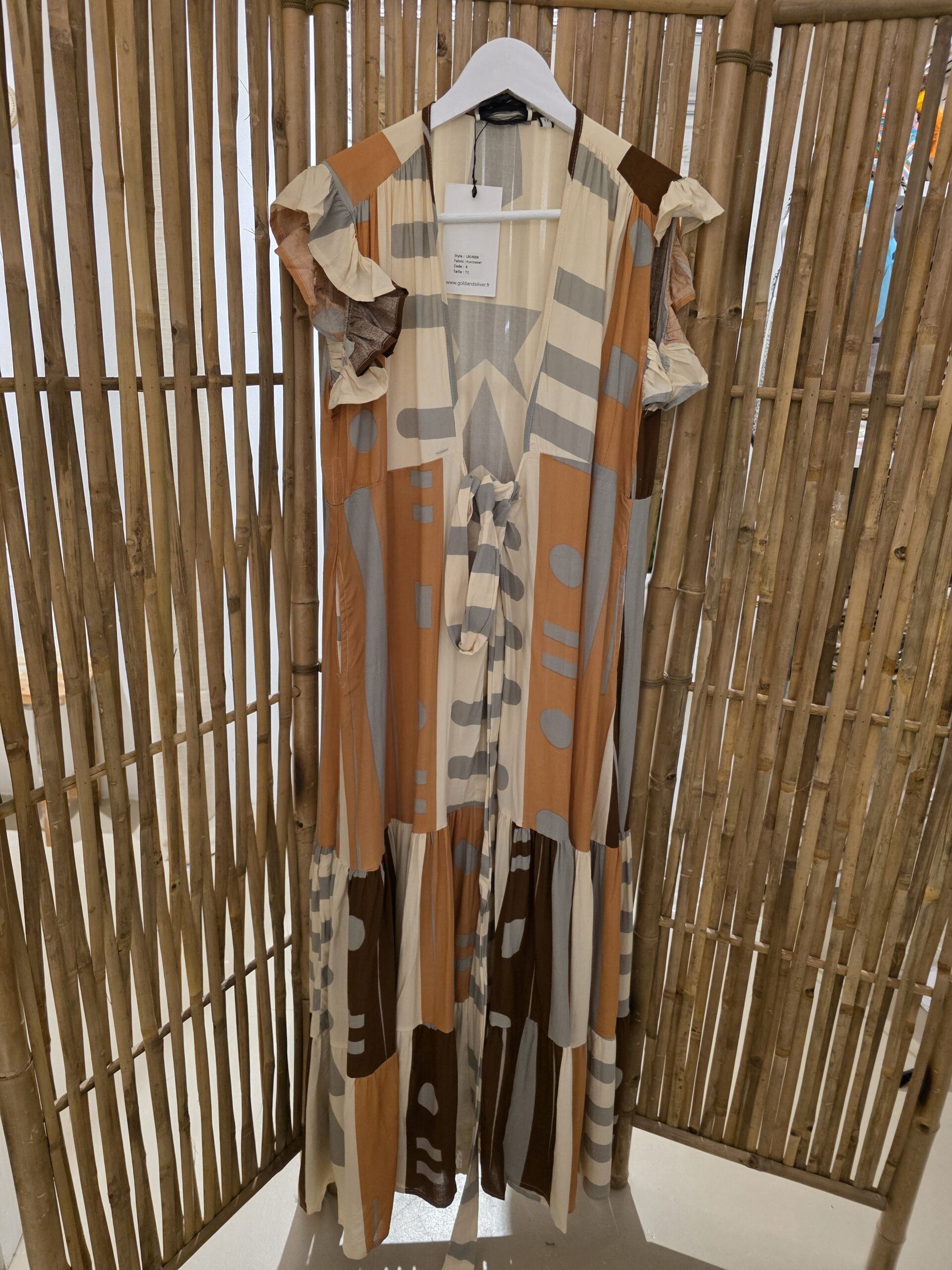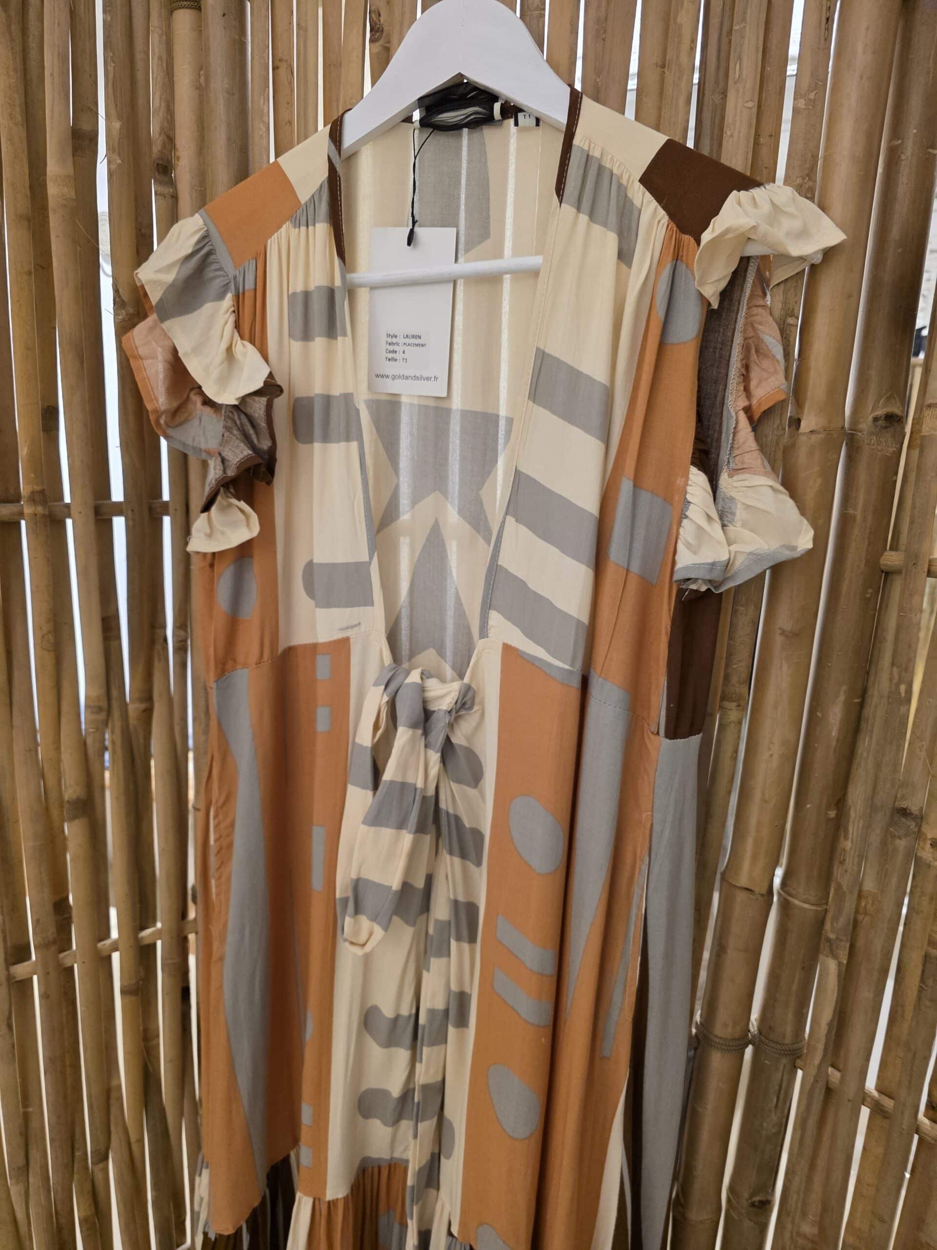 Mooie wikkel jurk, ook super trendy om als kimono te dragen, kort fladder mouwtje, prachtige natuurlijke stof met een mooie boho print, de jurk heeft een groeten rand roes onderaan de jurk, valt mooi soepel