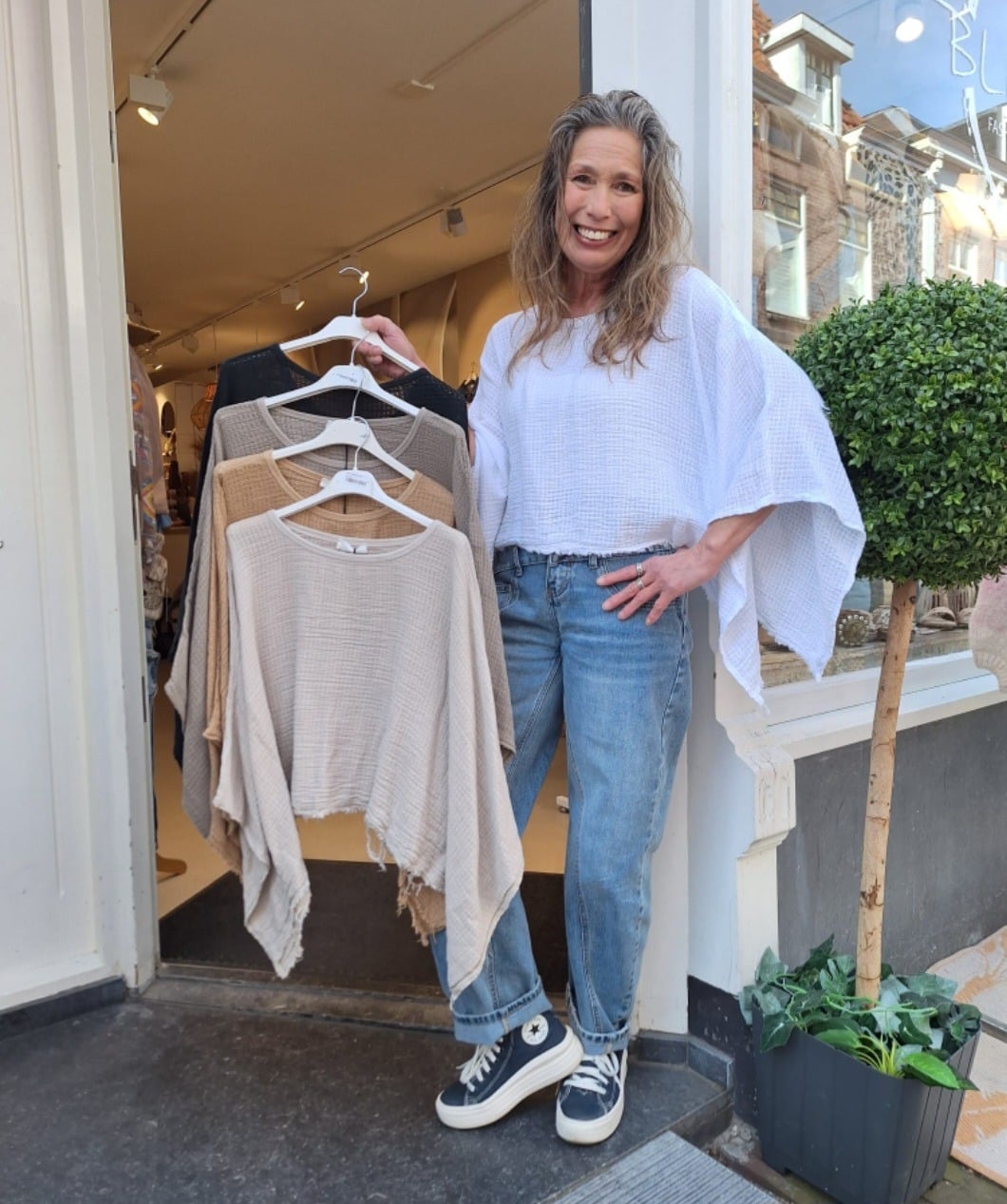 van wafeltjes stof deze korte top met wijde mouwen, de top is één maat past tot ongeveer 40/42, natuurlijk materiaal leuk detail zijn de rafeltjes voor een onafgewerkte look, lekker boho
