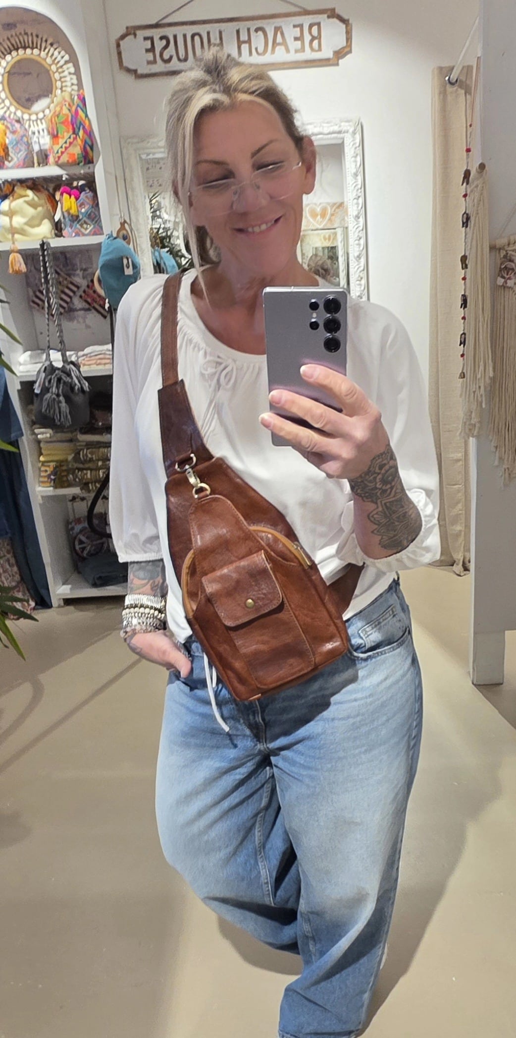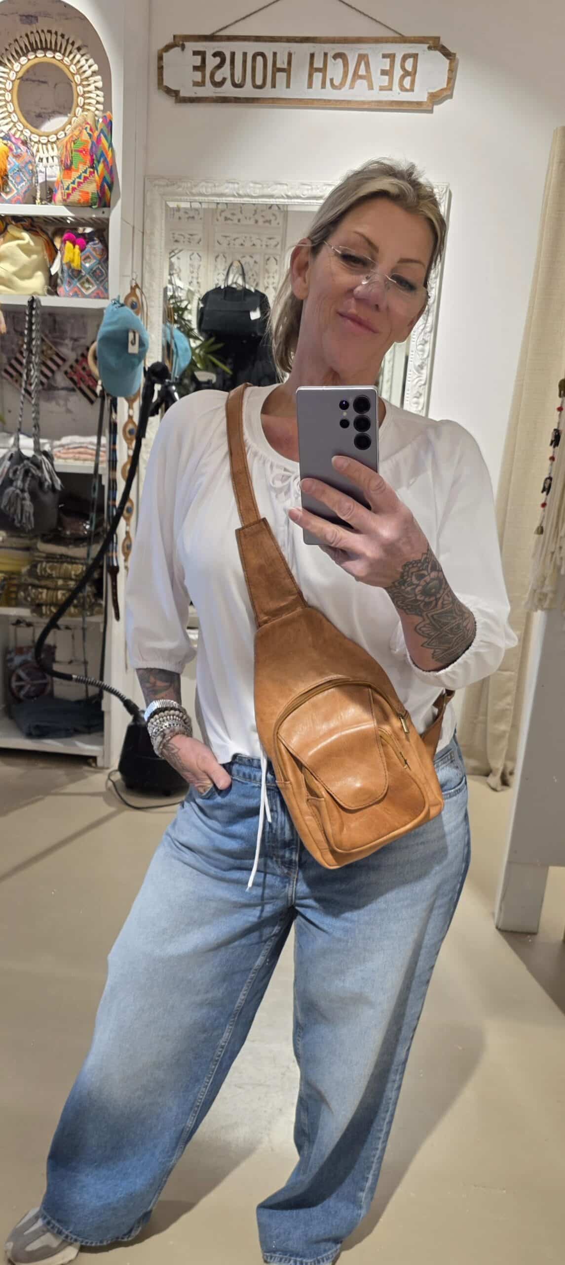 Van echt leer, deze super handige én trendy crossbody tas met diverse vakken en ritsen, heel veilig ook, en staat echt overal bij.