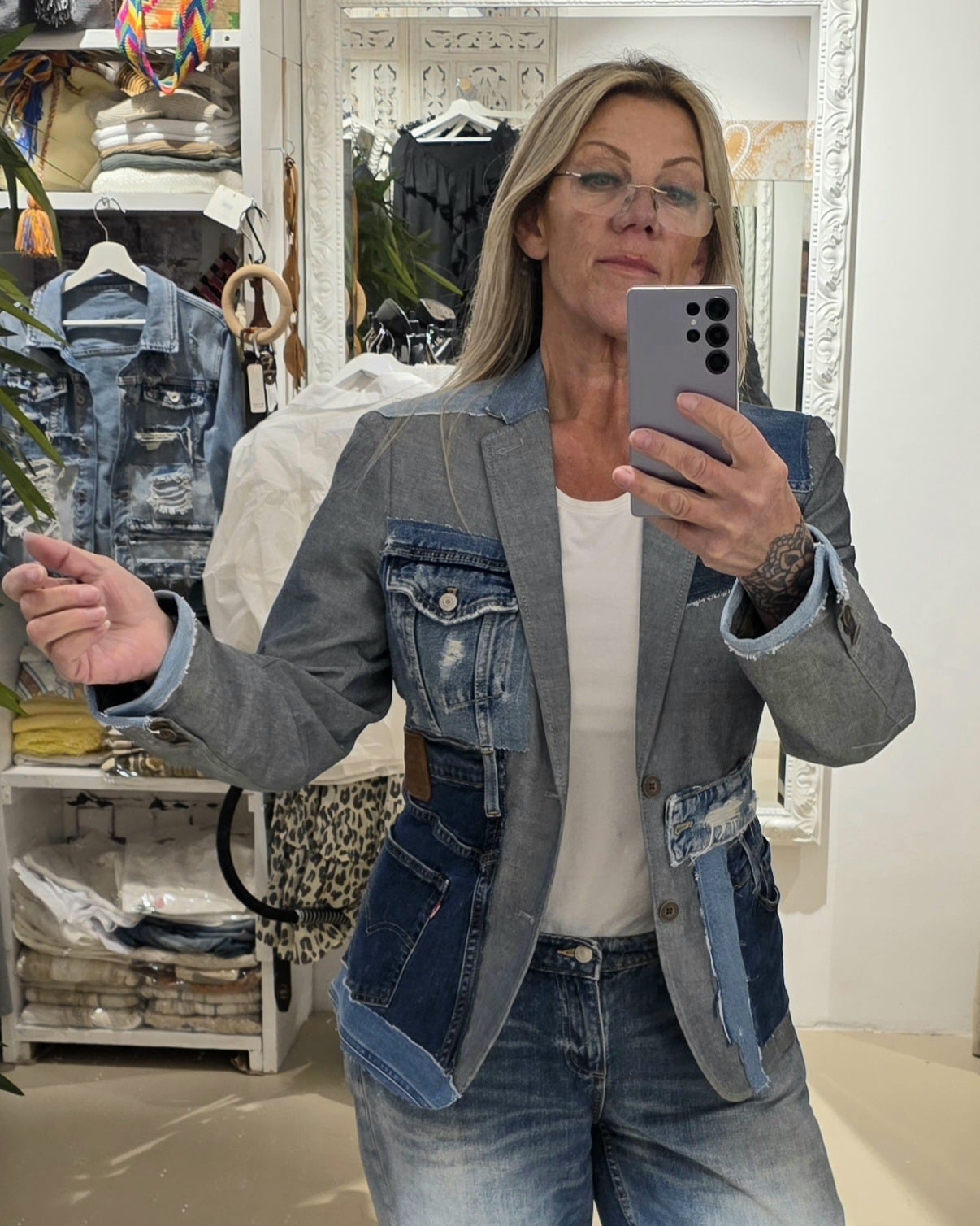 De combinatie van hoogwaardige vintage stoffen en karaktervol denim geeft elk ontwerp een eigen verhaal en een unieke uitstraling.