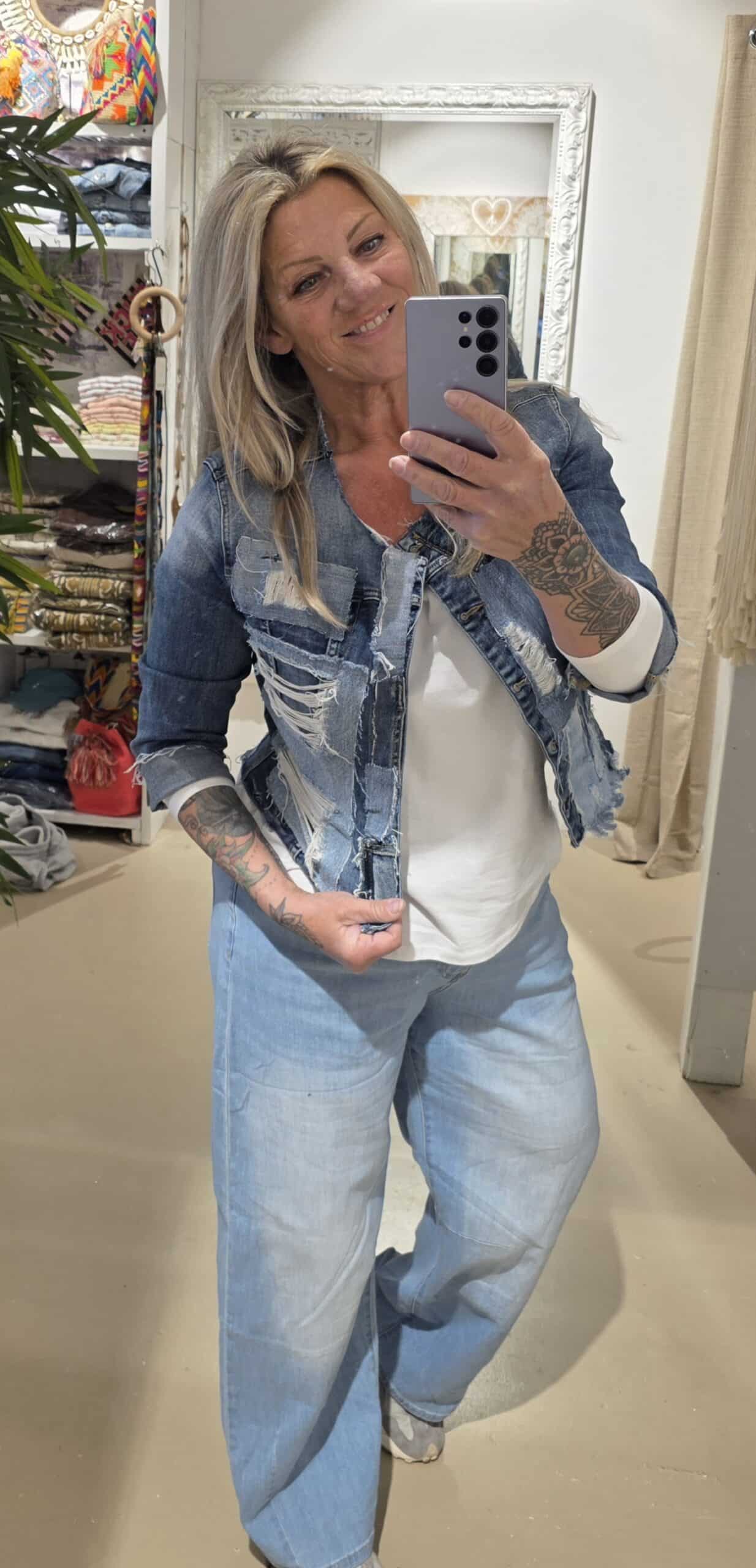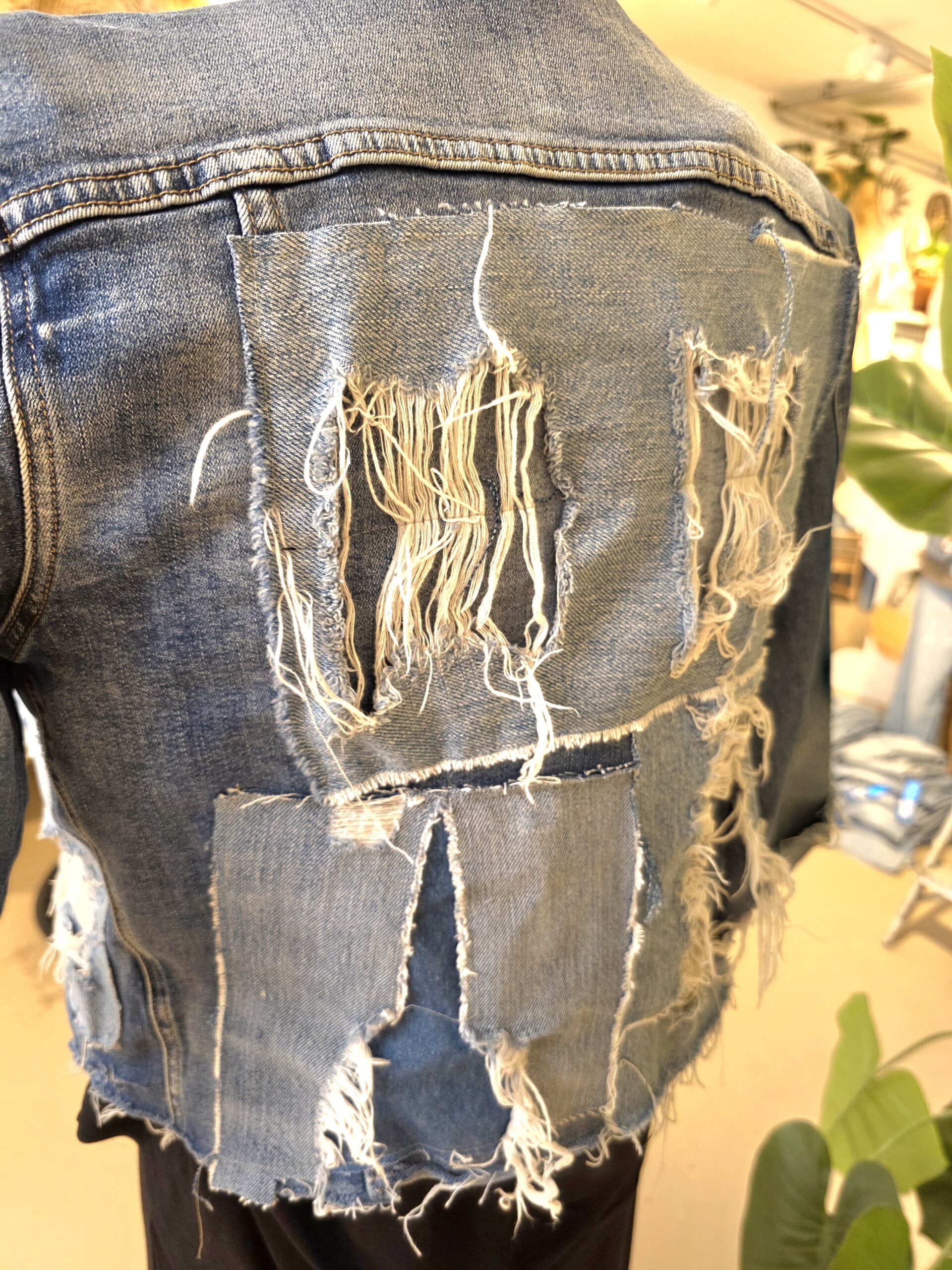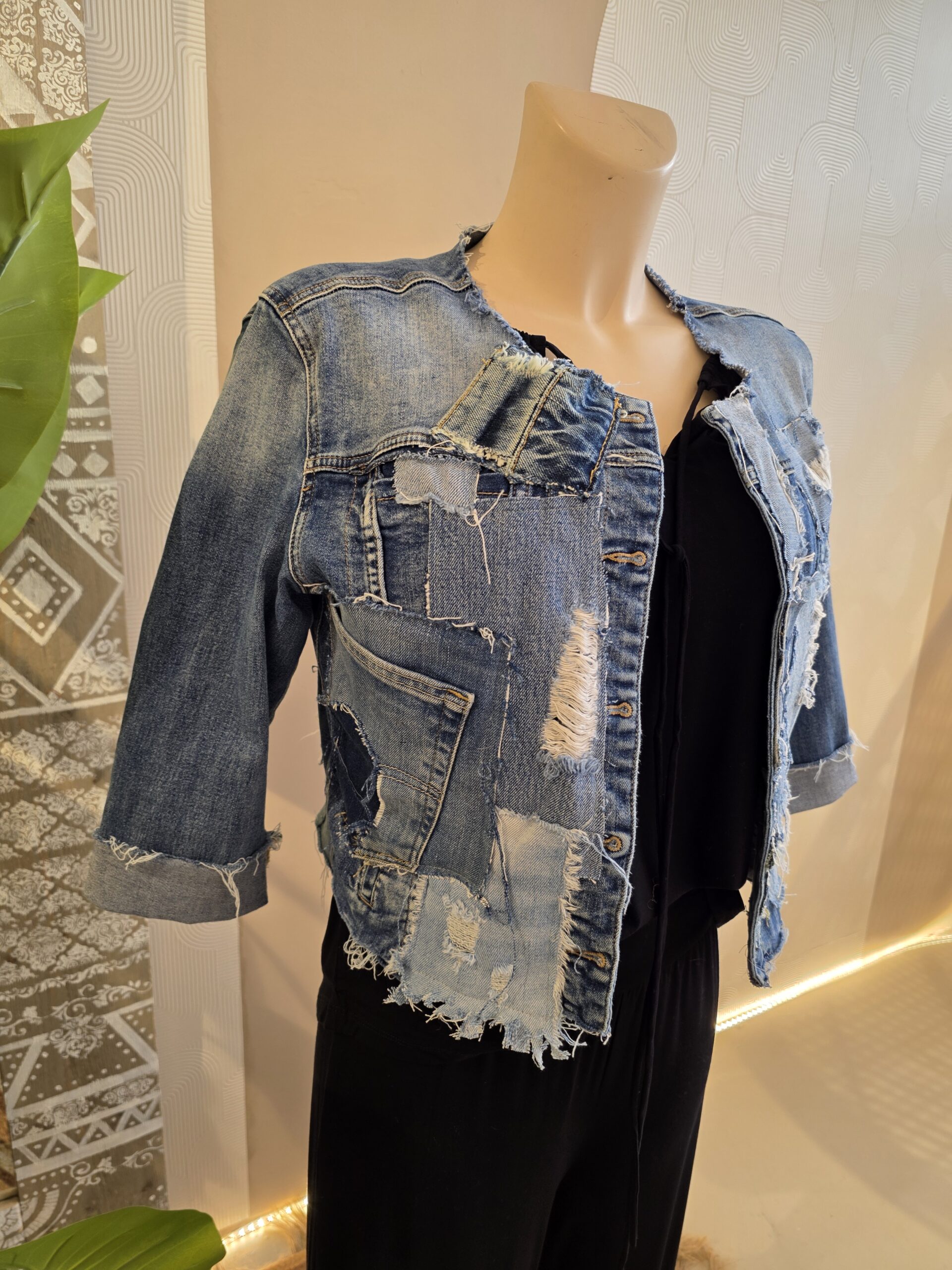 Dit unieke jasje is met de hand bewerkt en voorzien van stoere patchwork en distressed details, waardoor ieder exemplaar een eigen karakter krijgt.