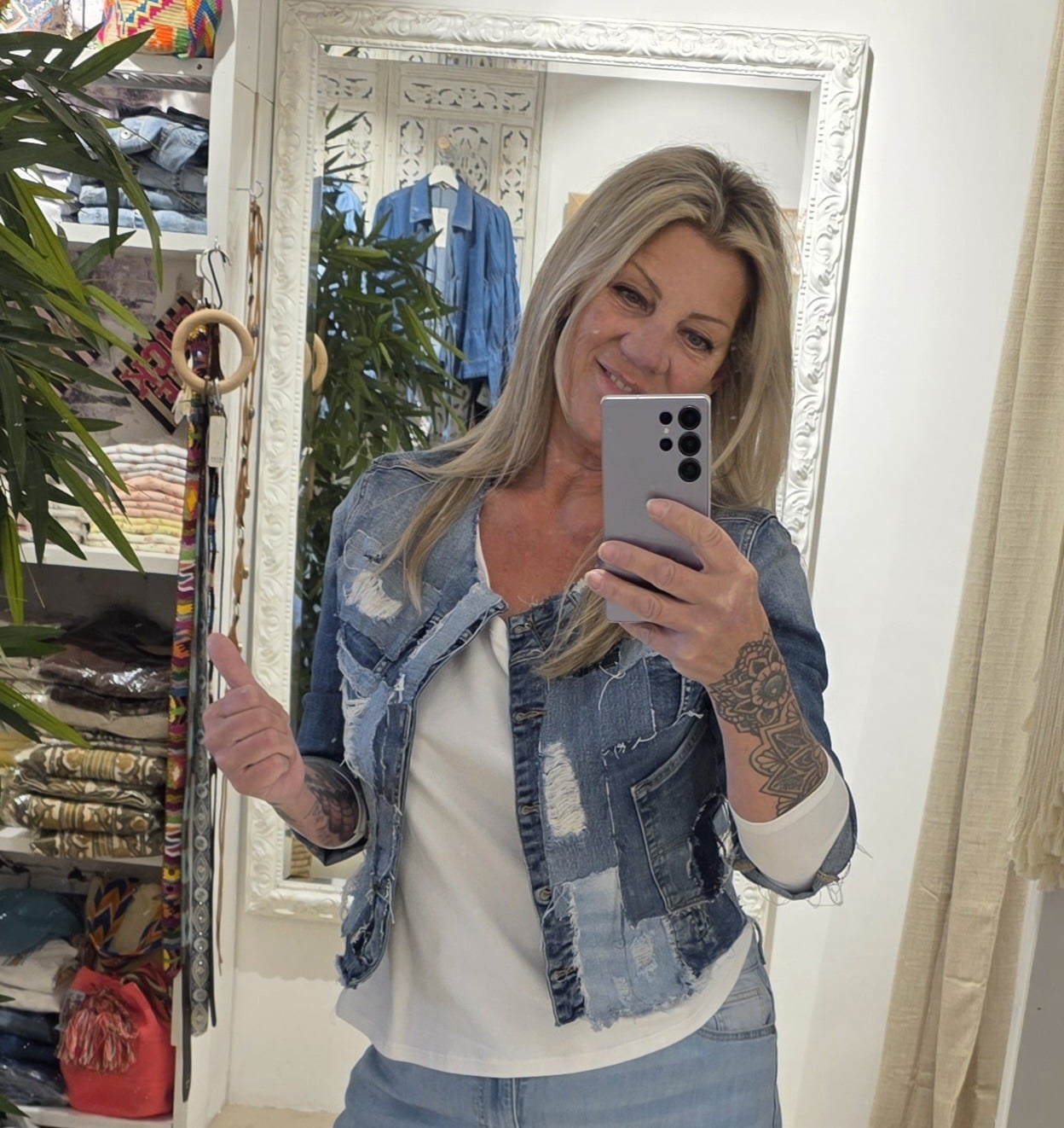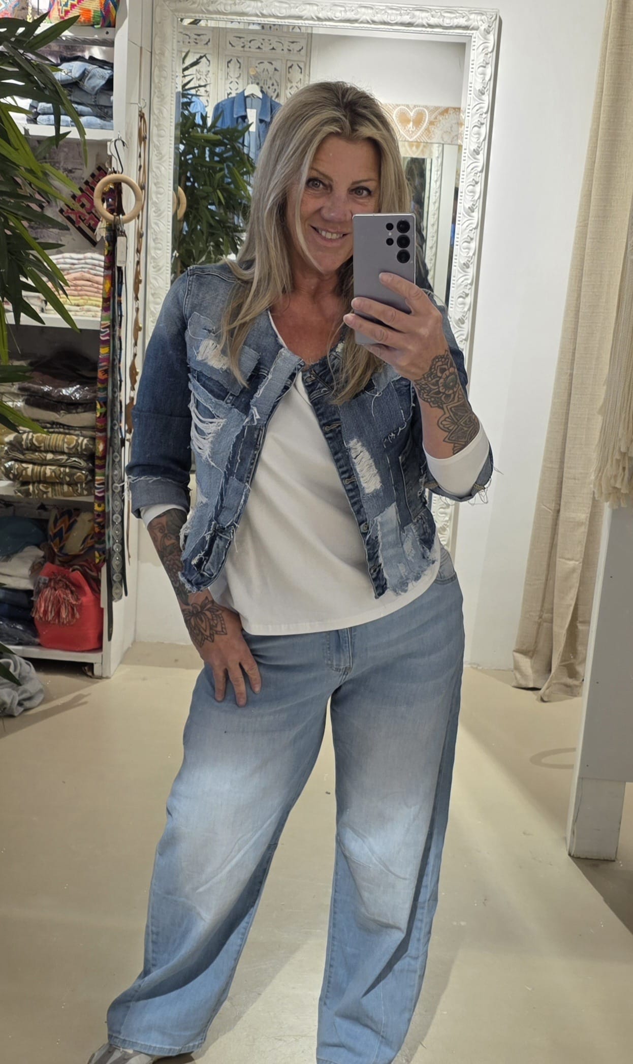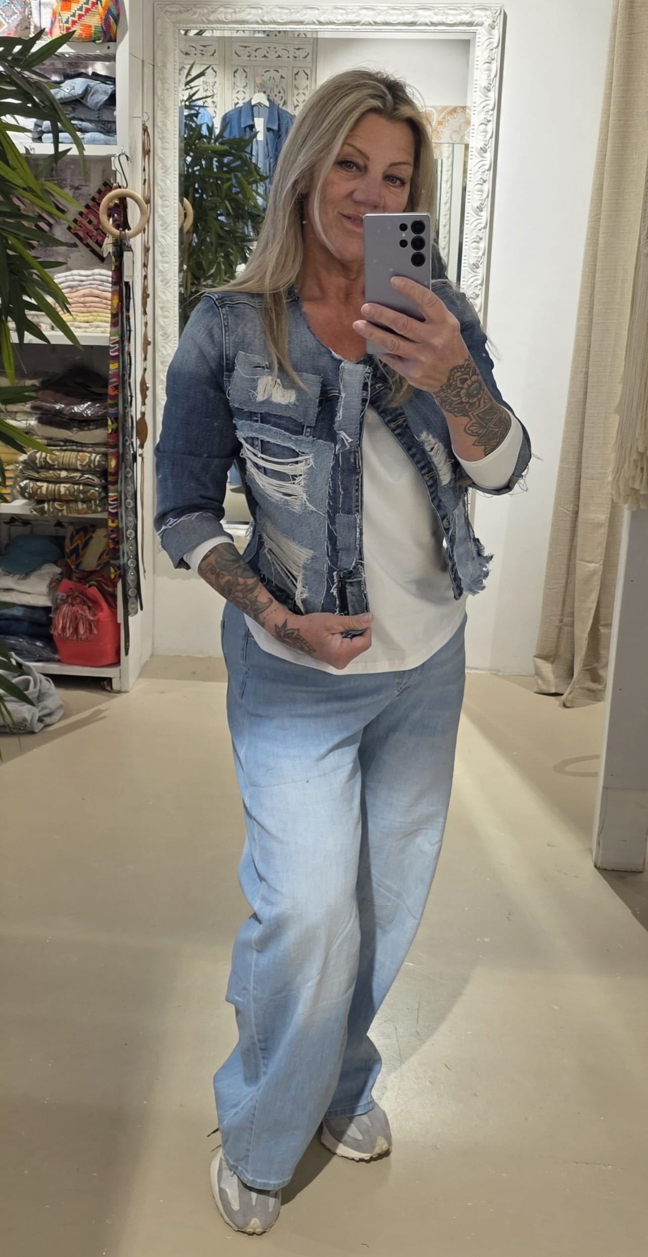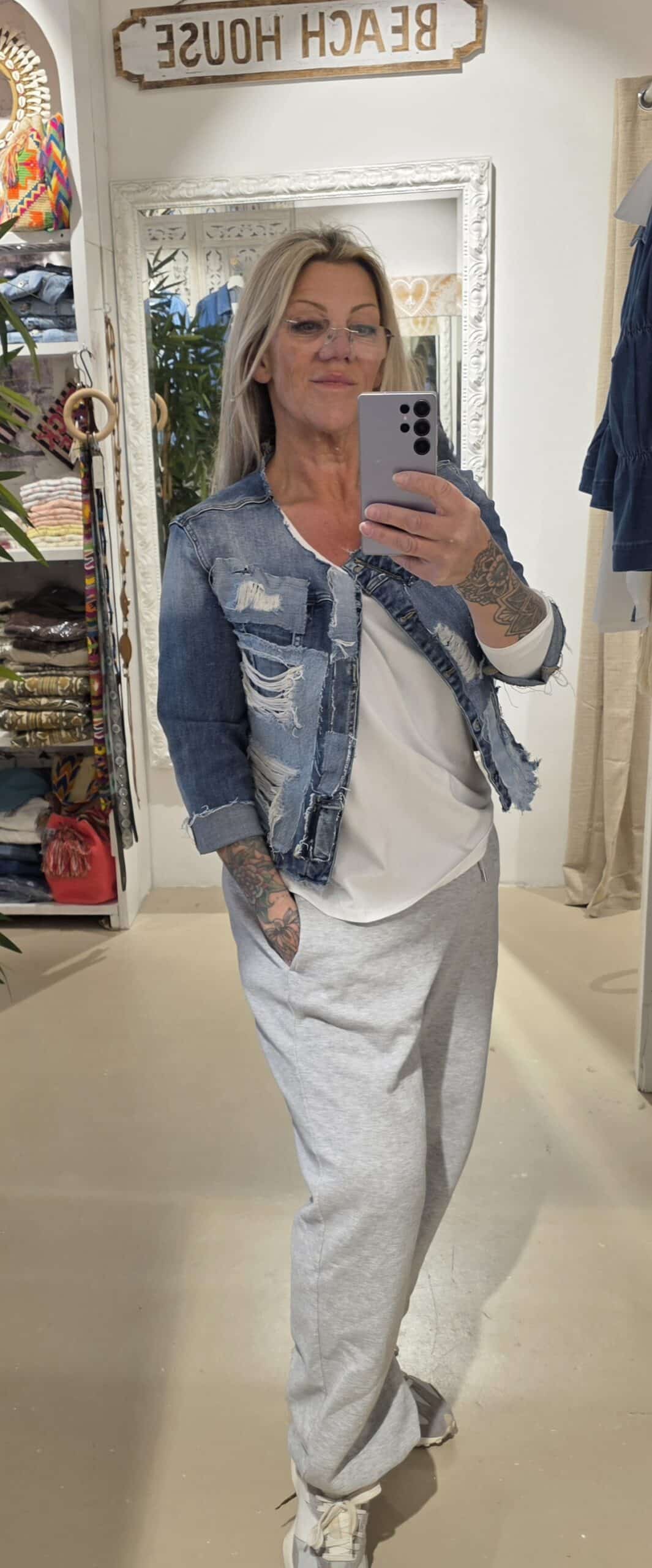 Dit unieke jasje is met de hand bewerkt en voorzien van stoere patchwork en distressed details, waardoor ieder exemplaar een eigen karakter krijgt.