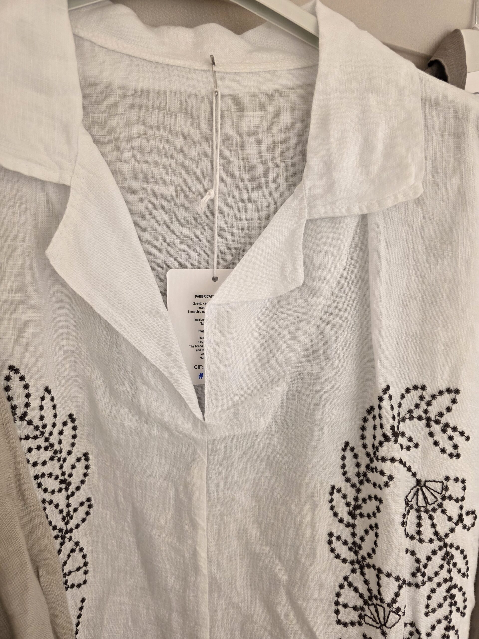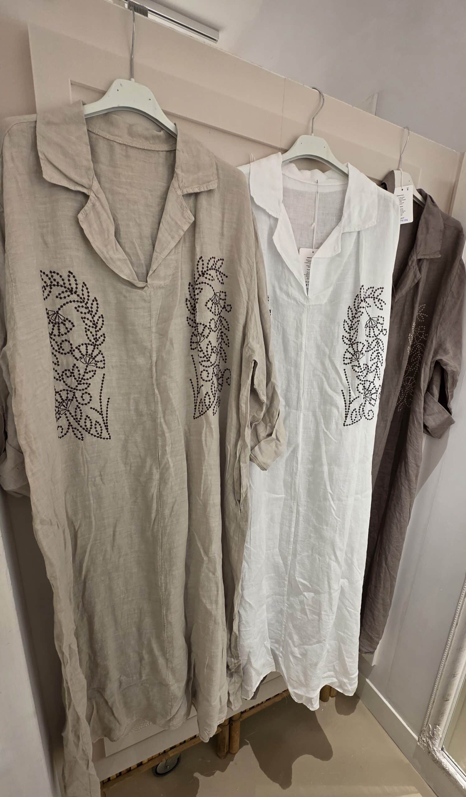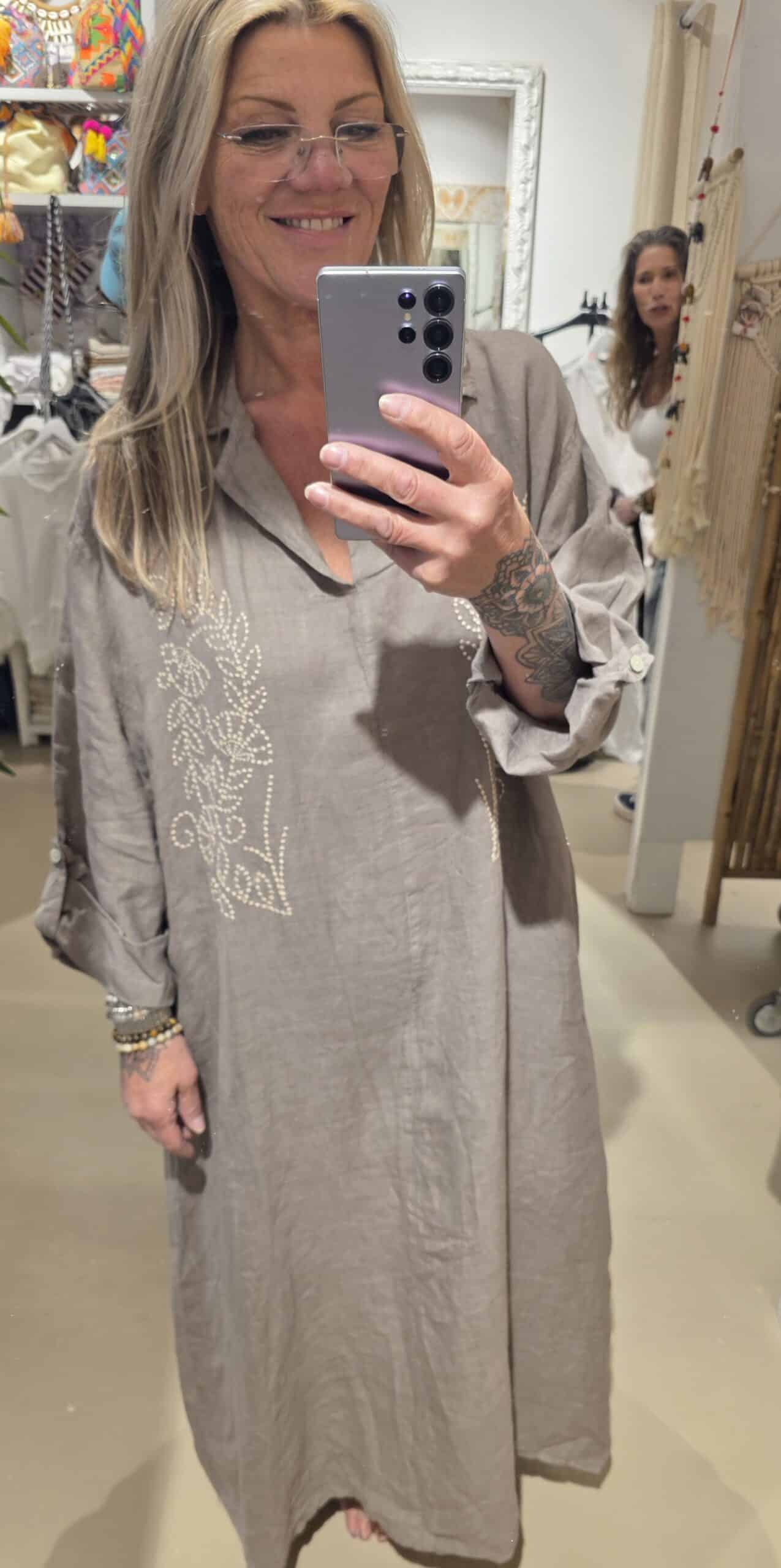 100% linnen, deze mooie oversized jurk, afgewerkt met mooie borduursels, knoopjes bij de bovenzijde, één maat valt ruim..net niet maxi qua lengte, heerlijke soepele jurk, past tot zeker 46