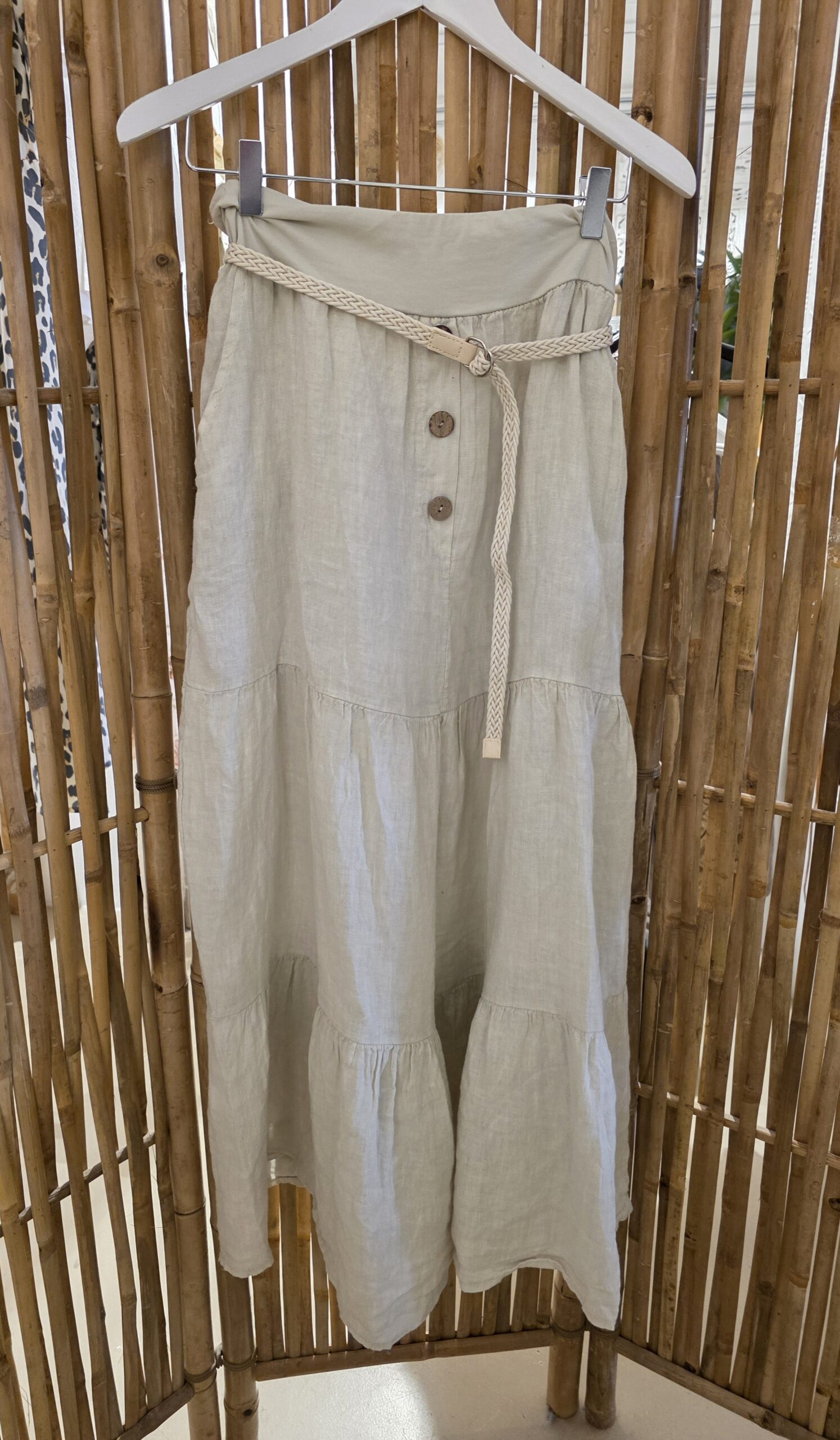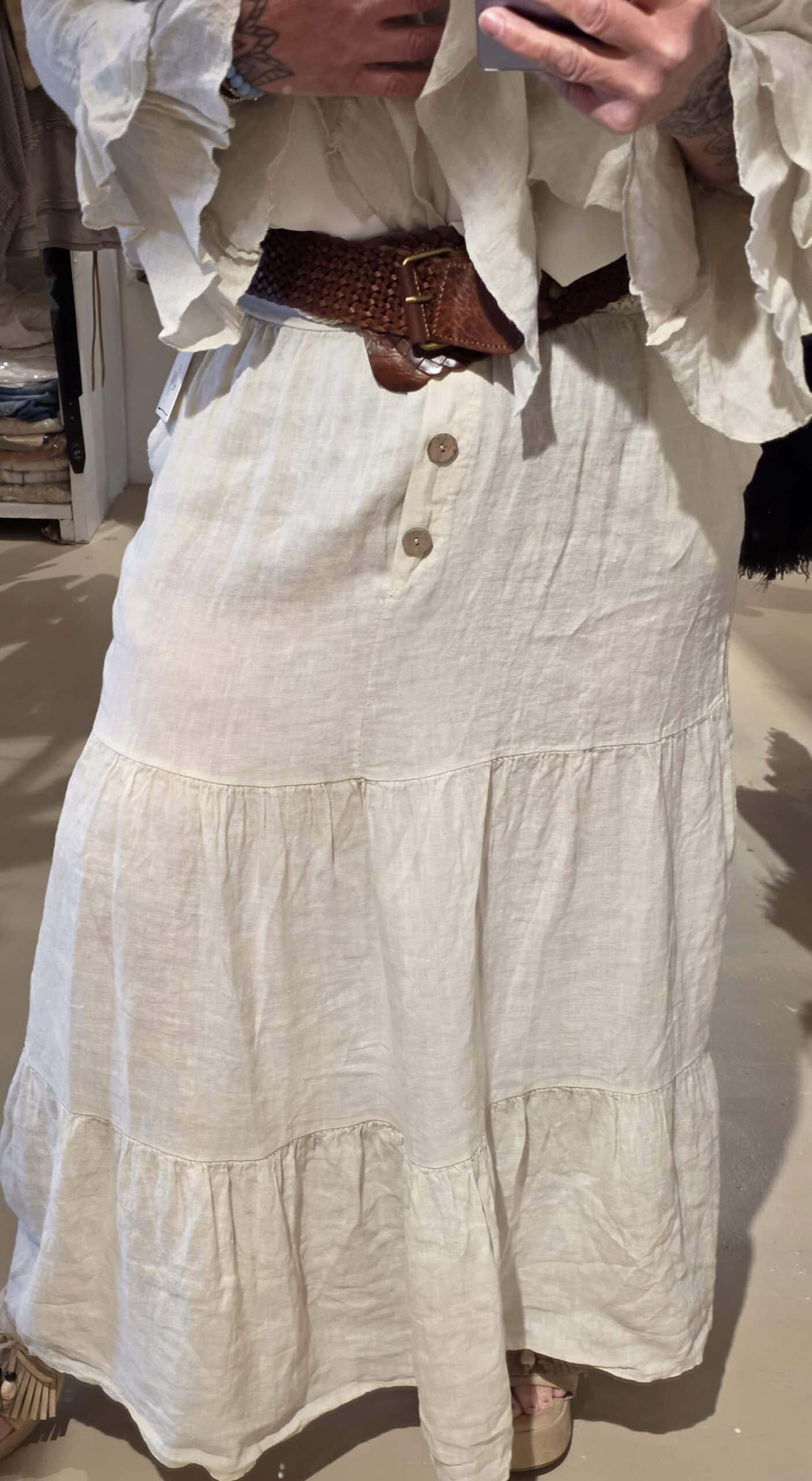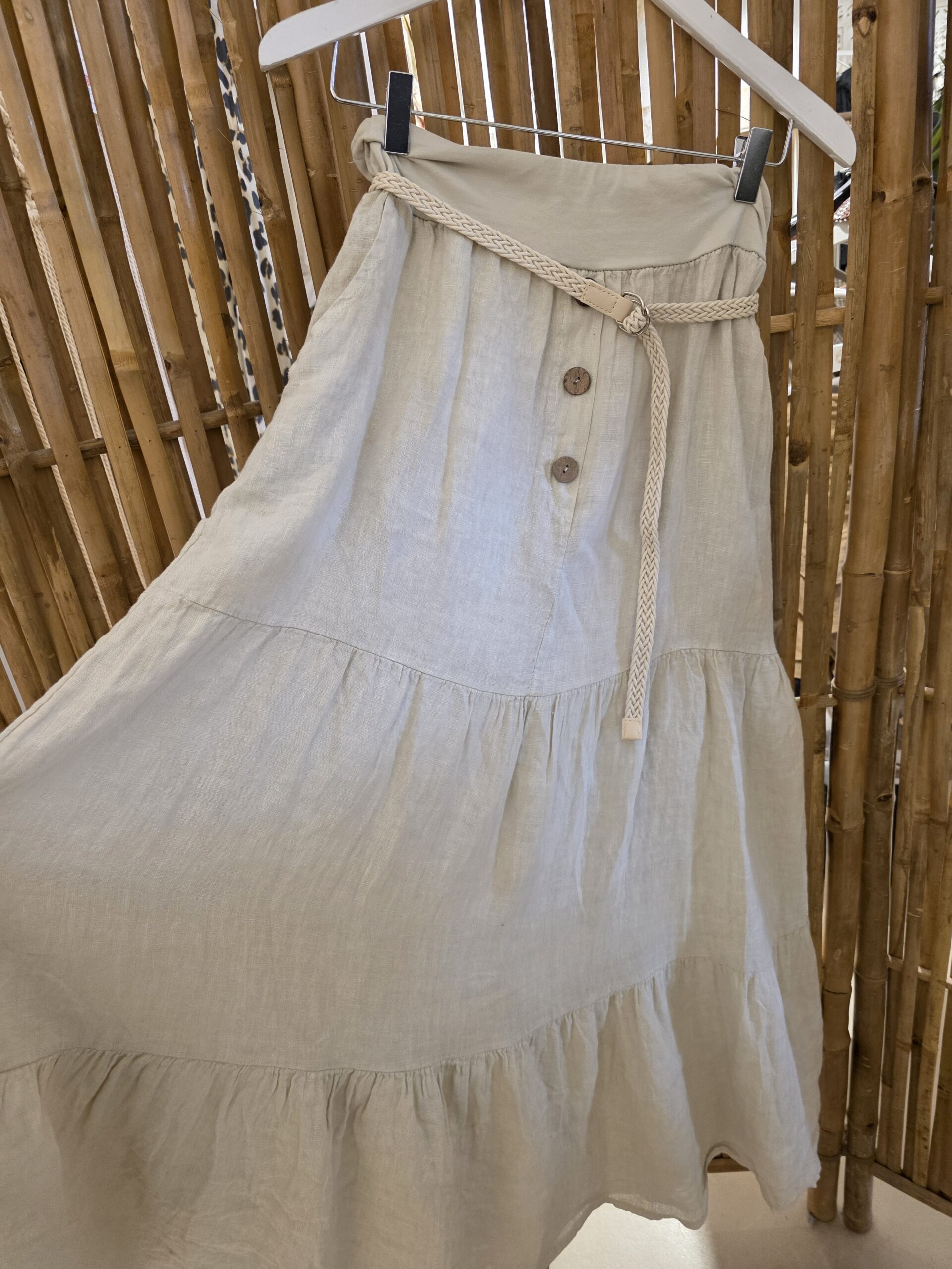 100% linnen deze mooie lange maxi rok met banen, heeft sierknopen als leuk detail én een riempjes, één maat, past tot 44 ongeveer, kleur beige