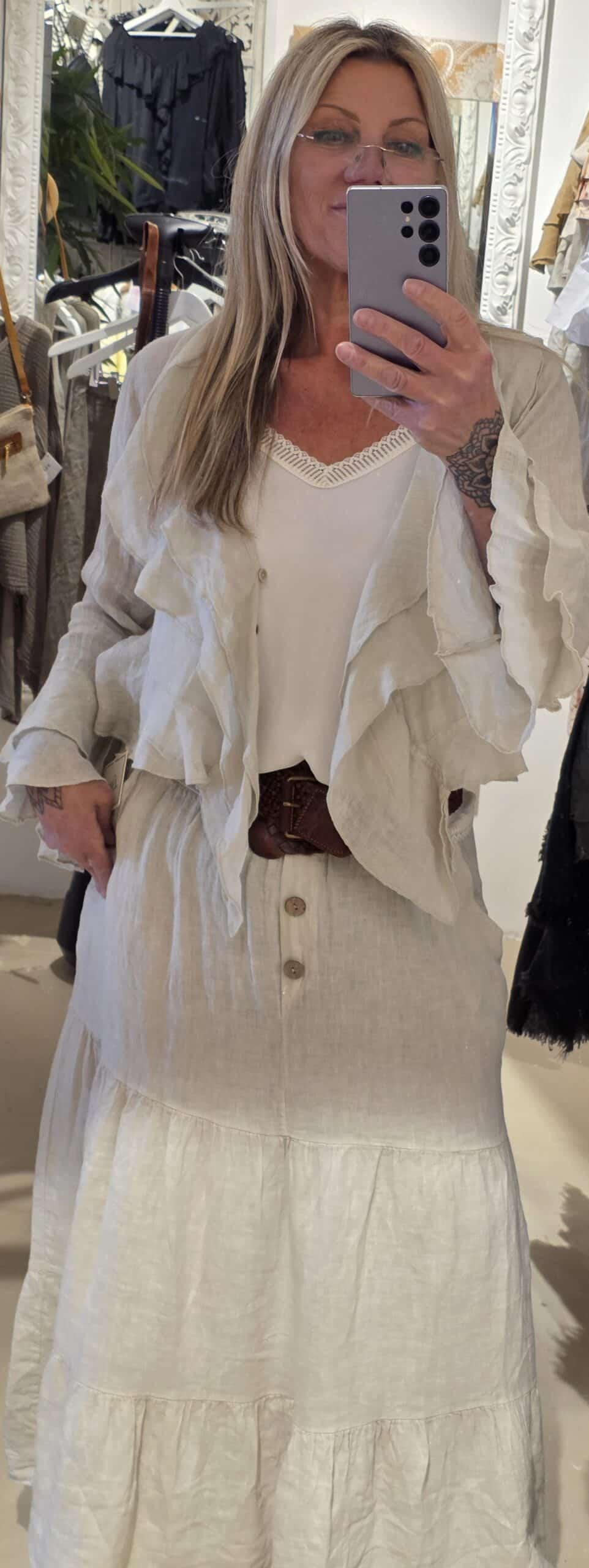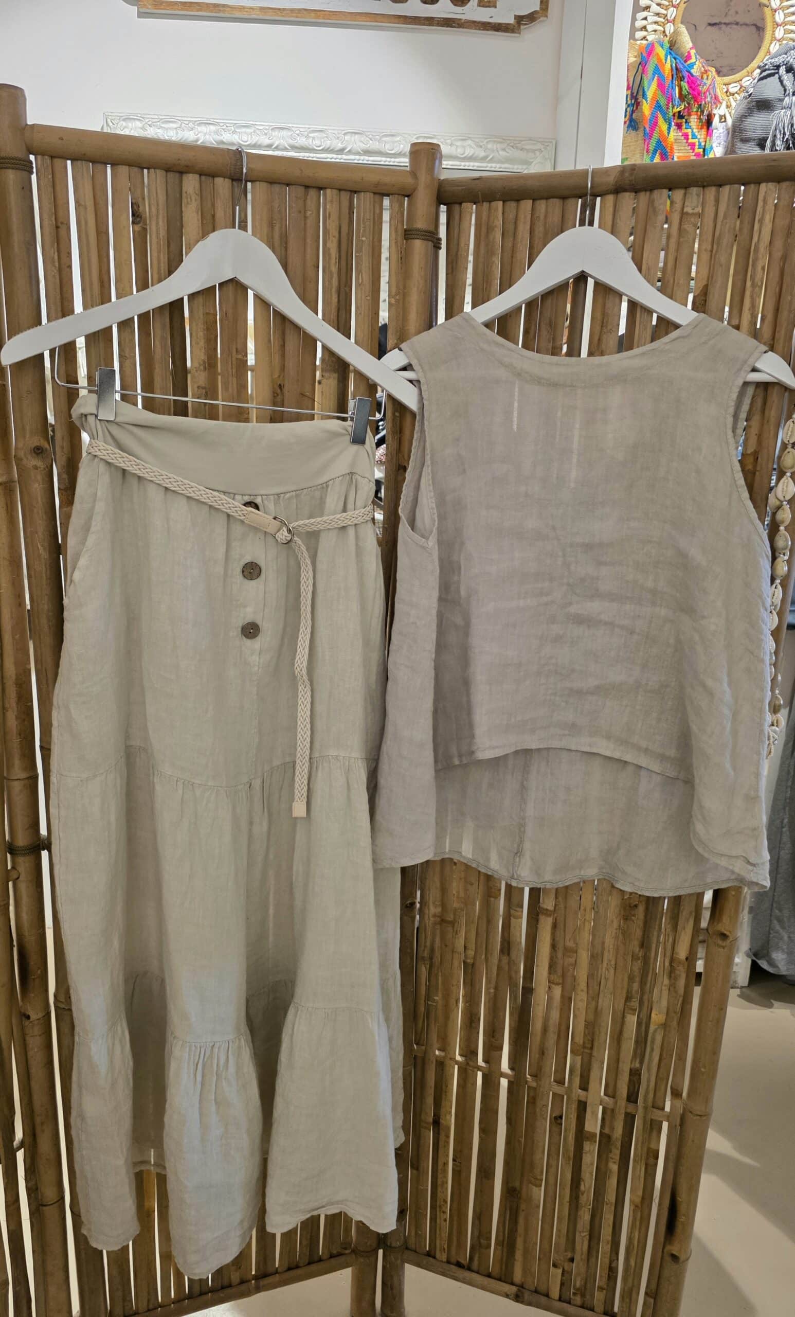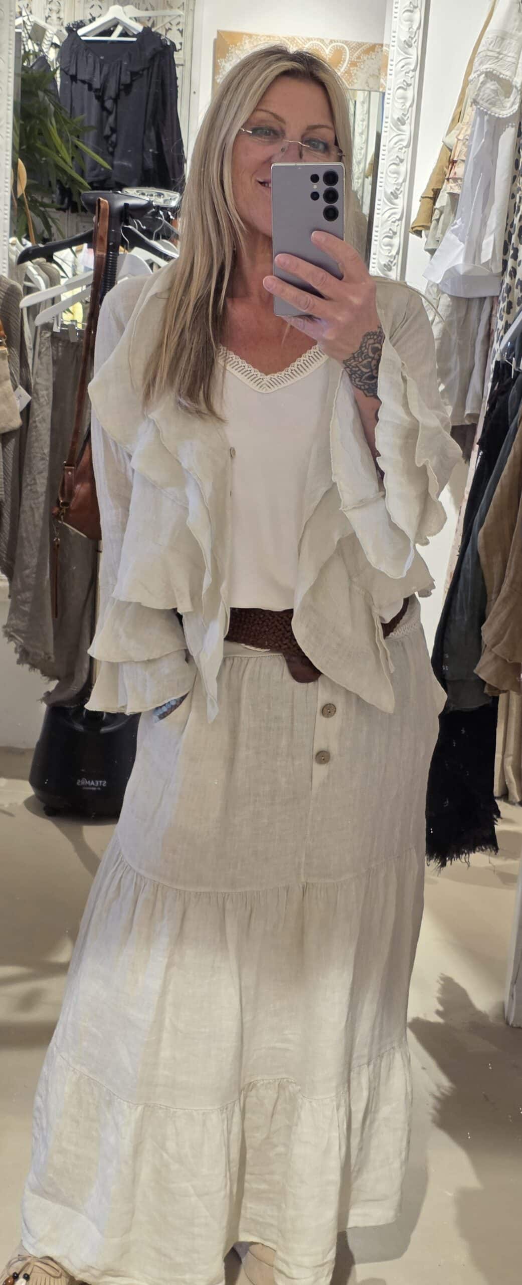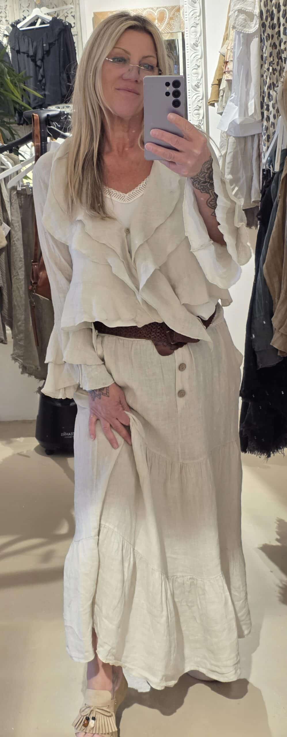 100% linnen deze mooie lange maxi rok met banen, heeft sierknopen als leuk detail én een riempjes, één maat, past tot 44 ongeveer, kleur beige