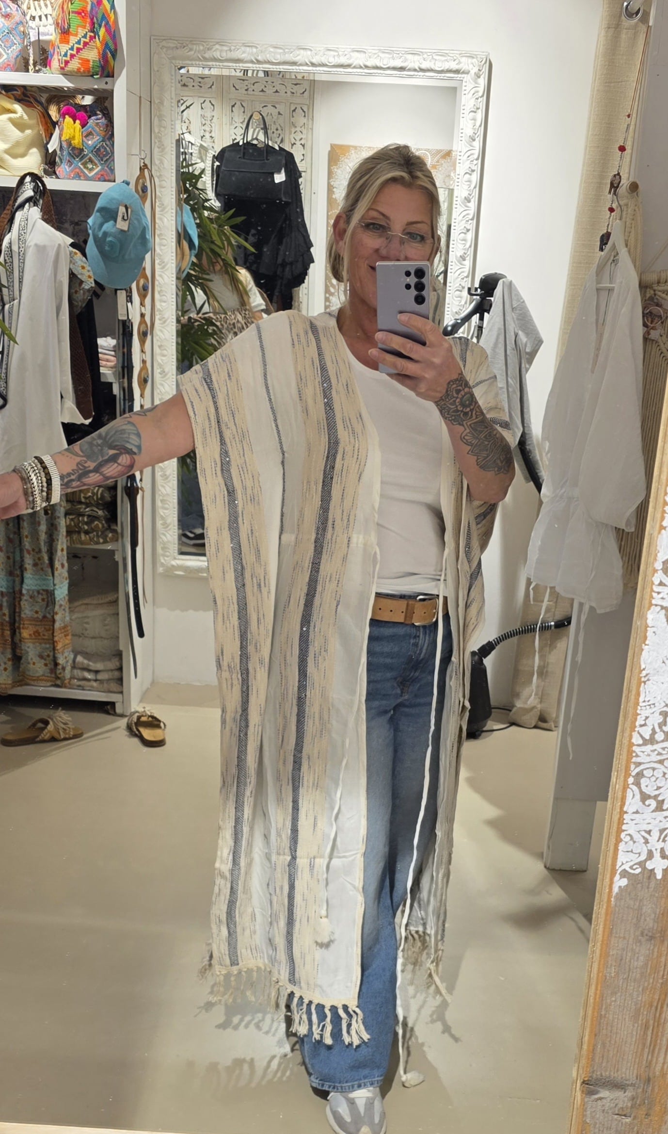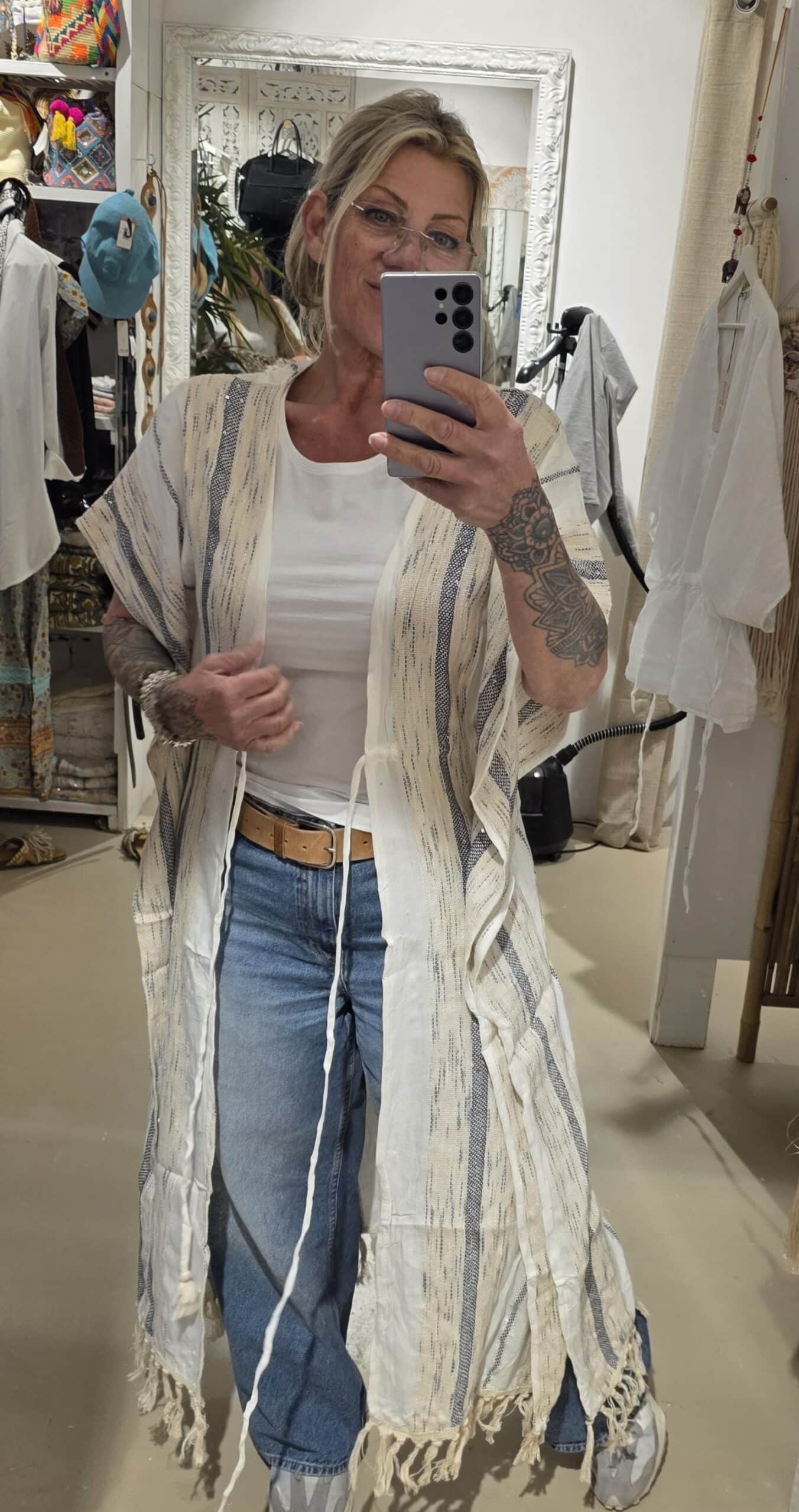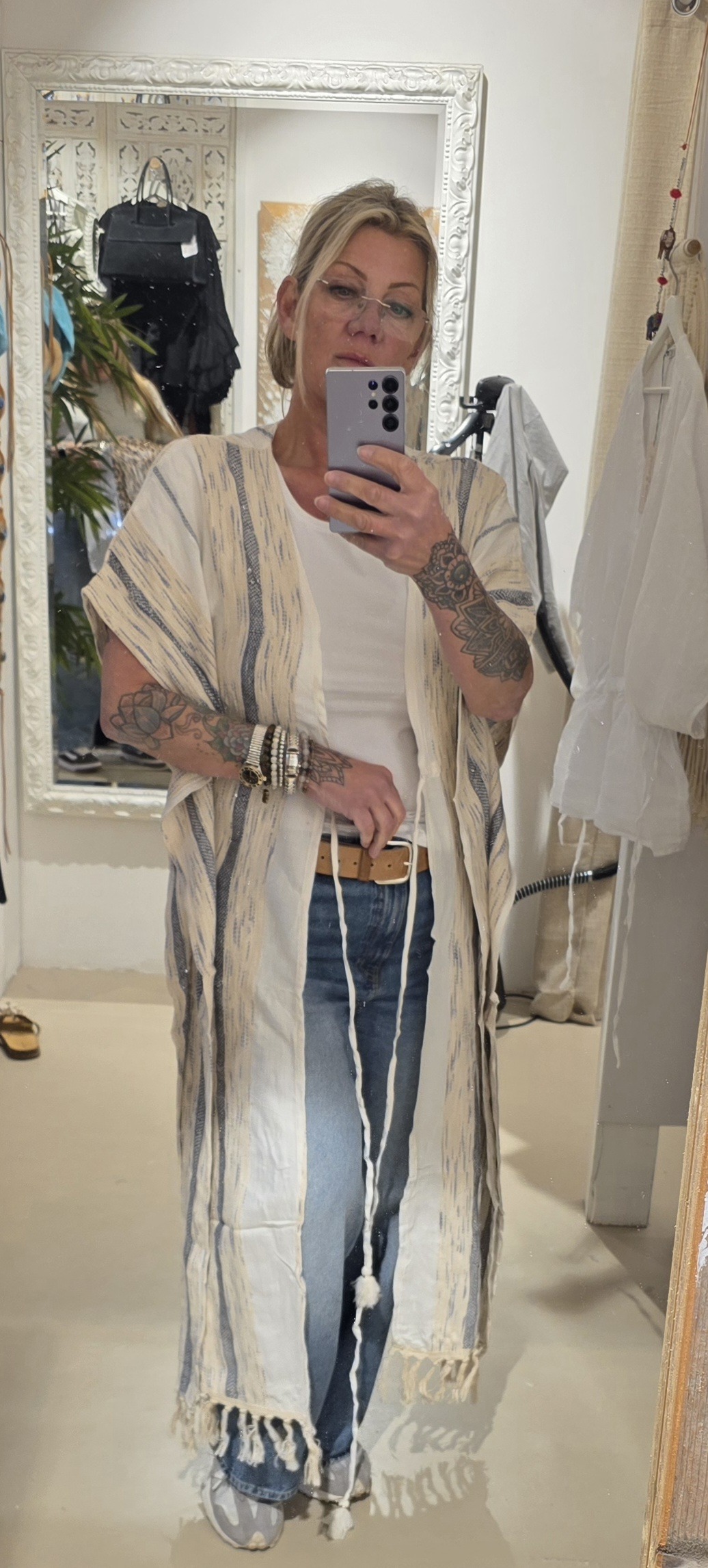 Prachtige kimono, met dubbele rand aan de zijkanten, mooi lang licht gestreept, koordje bij je middel, één maat past tot 42/44