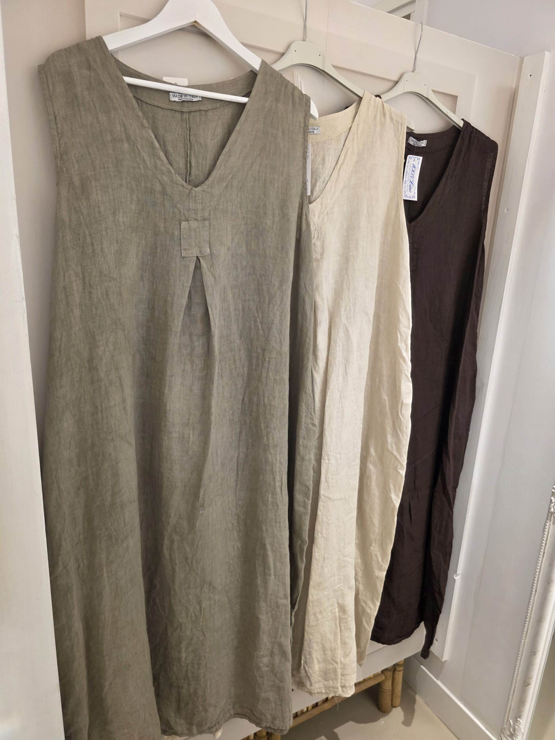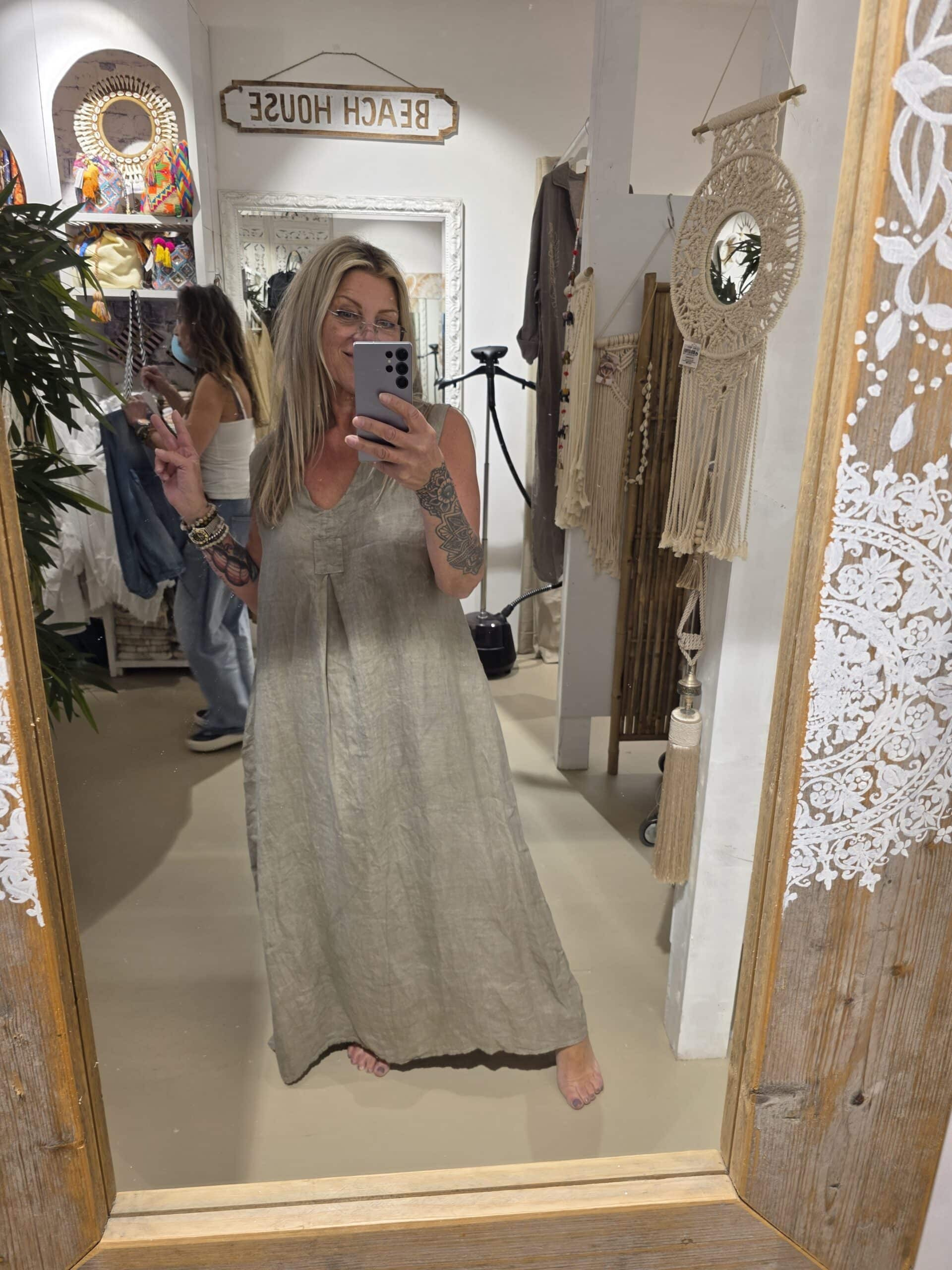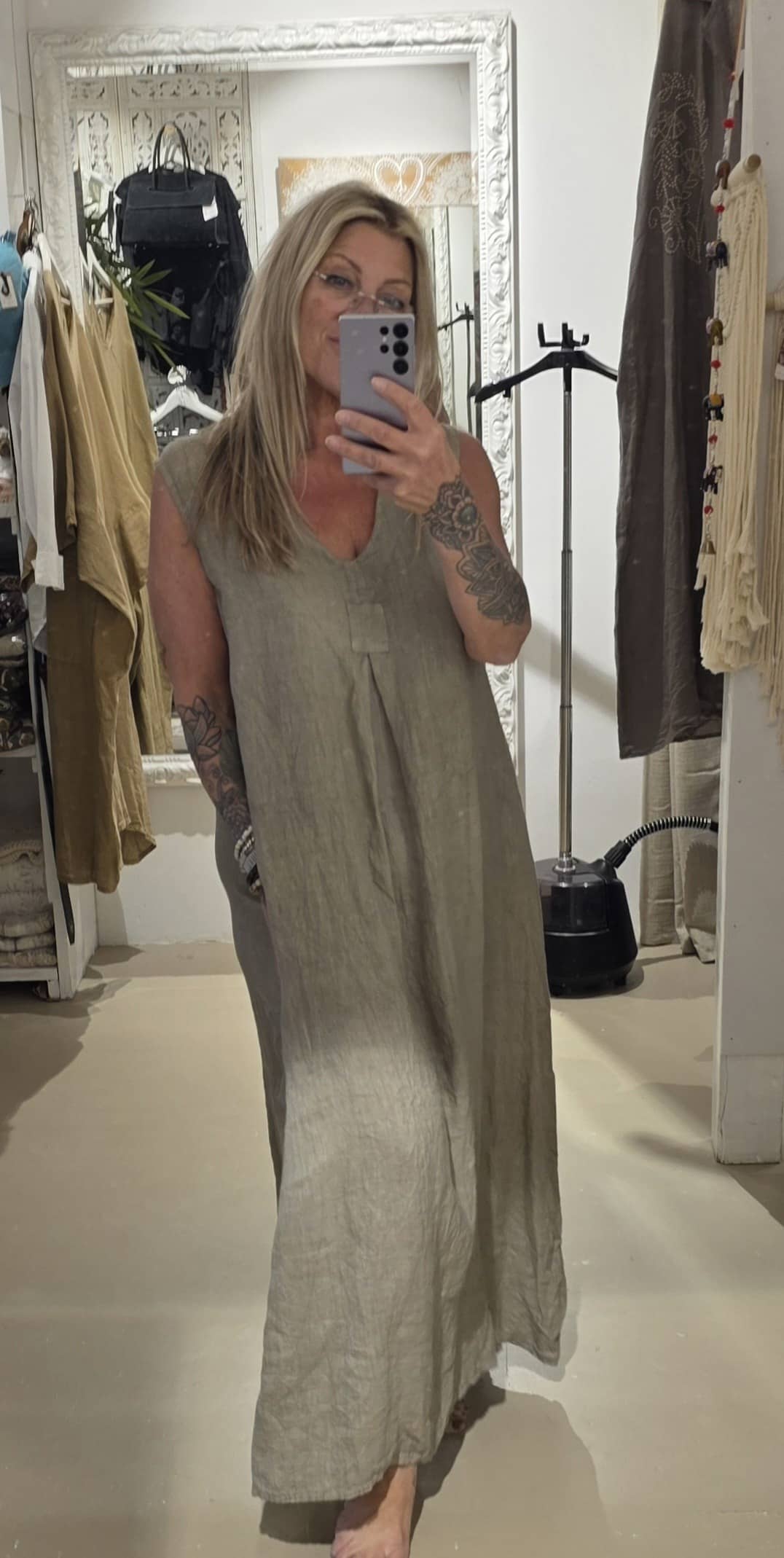 100% linnen deze mooie lange jurk, mouwloos, in één maat , valt ruim, mooie afgewerkte hals en een klein plooitje vóór bij de jurk