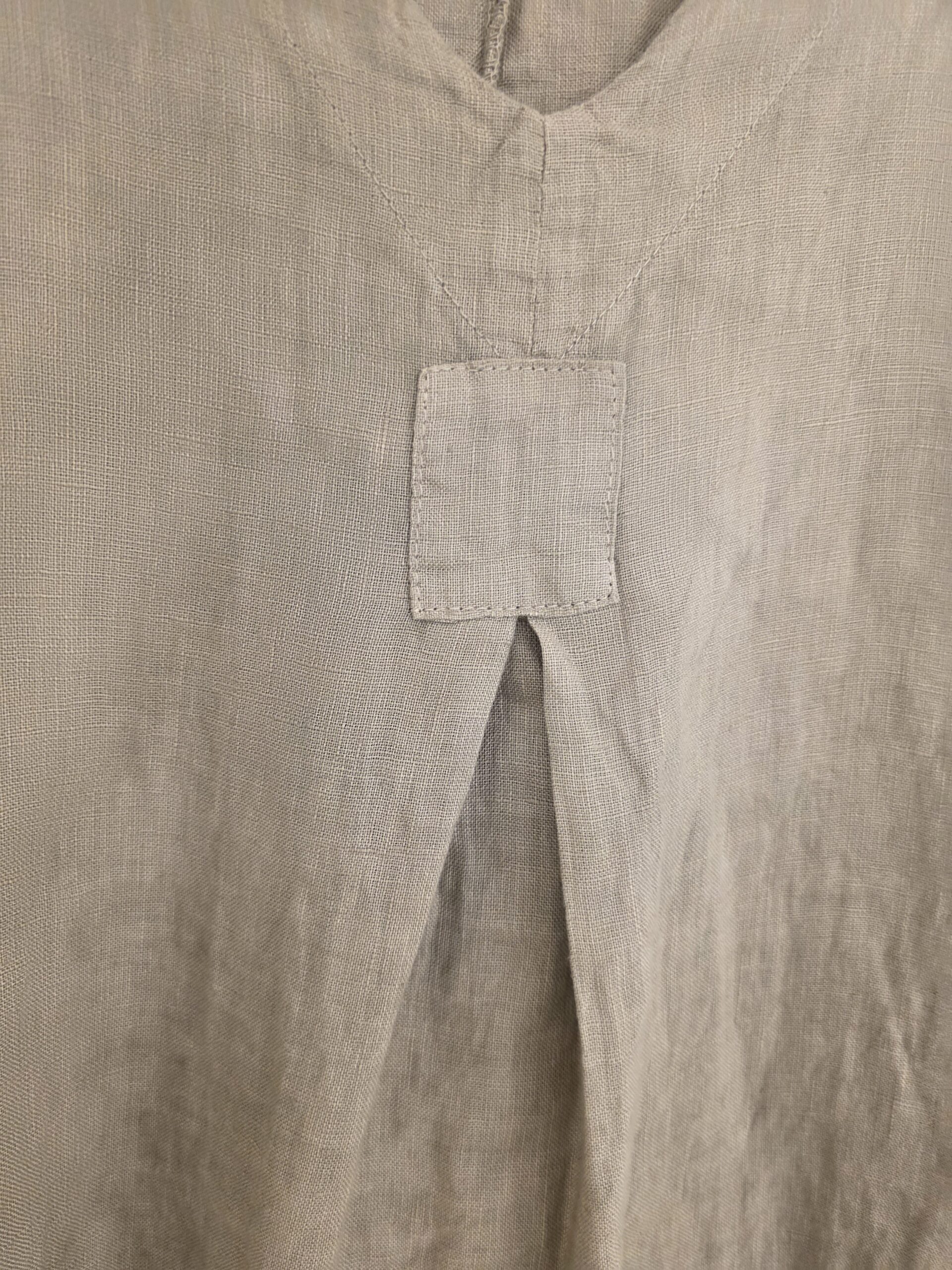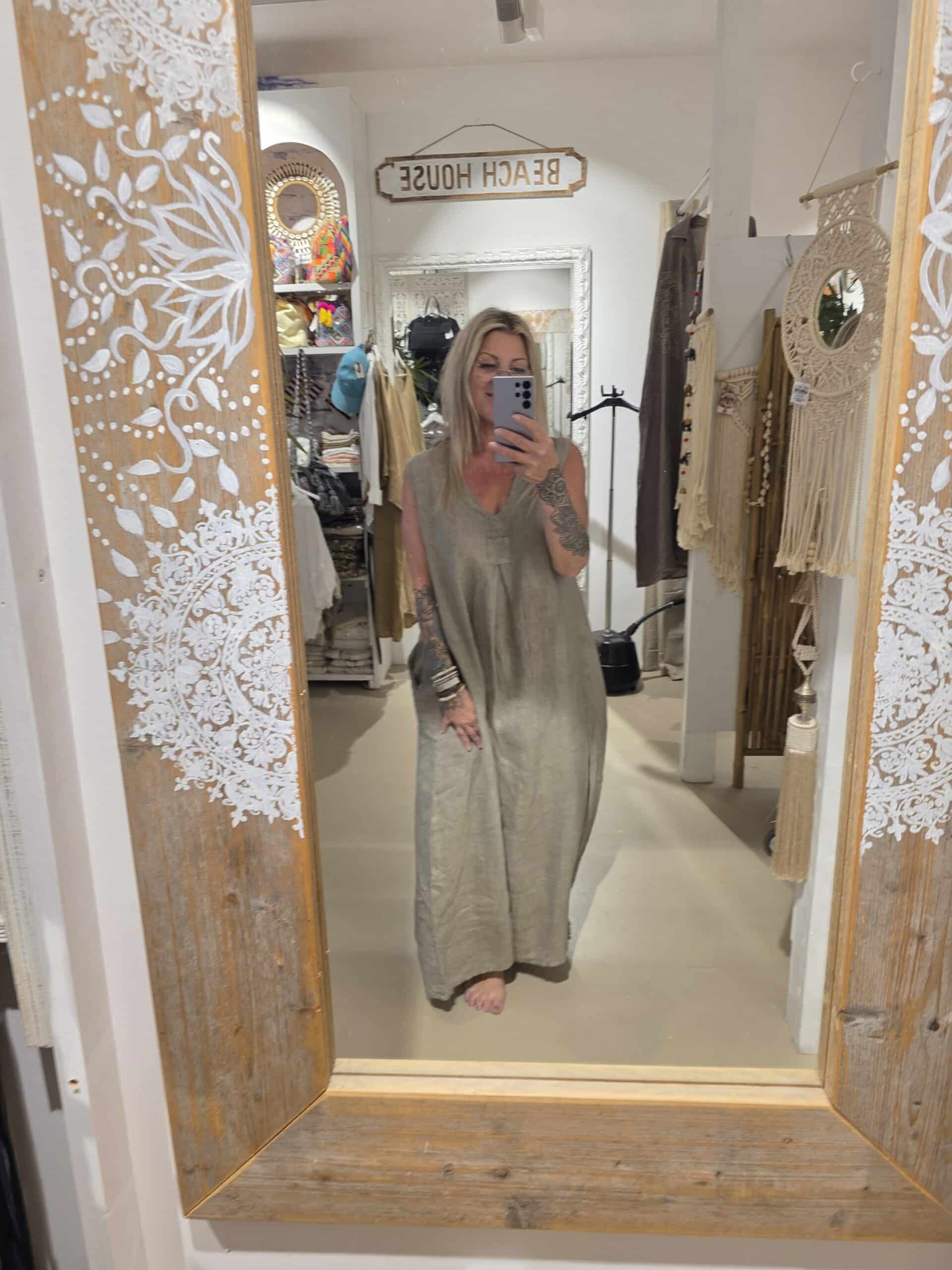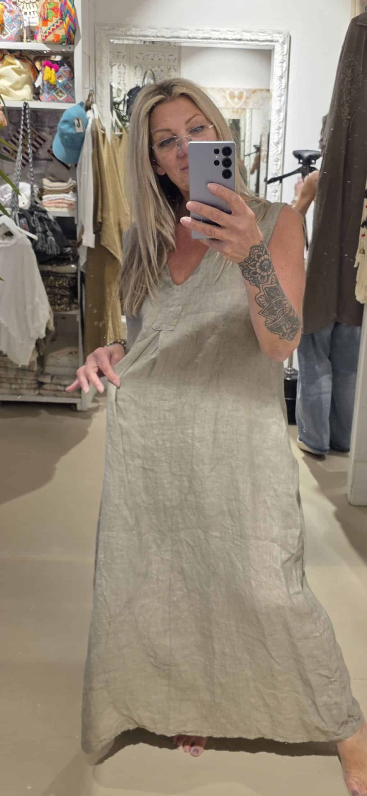 100% linnen deze mooie lange jurk, mouwloos, in één maat , valt ruim, mooie afgewerkte hals en een klein plooitje vóór bij de jurk