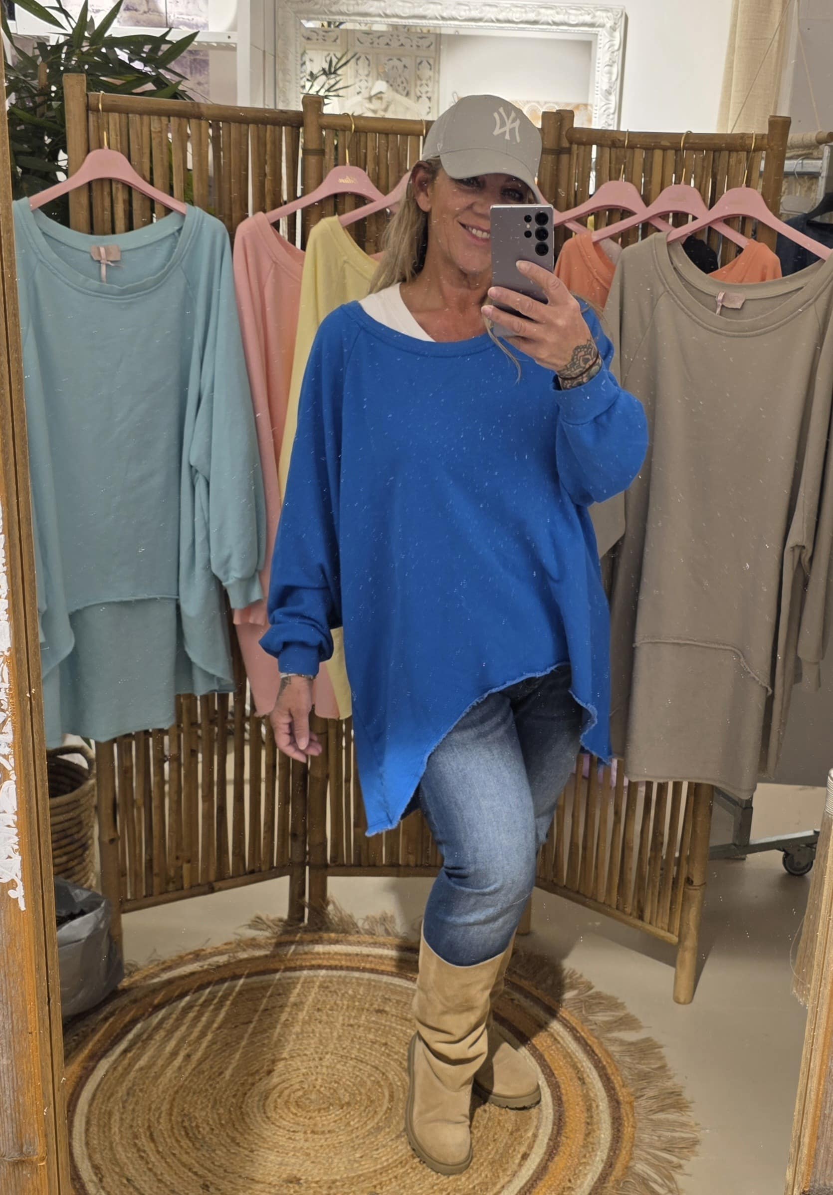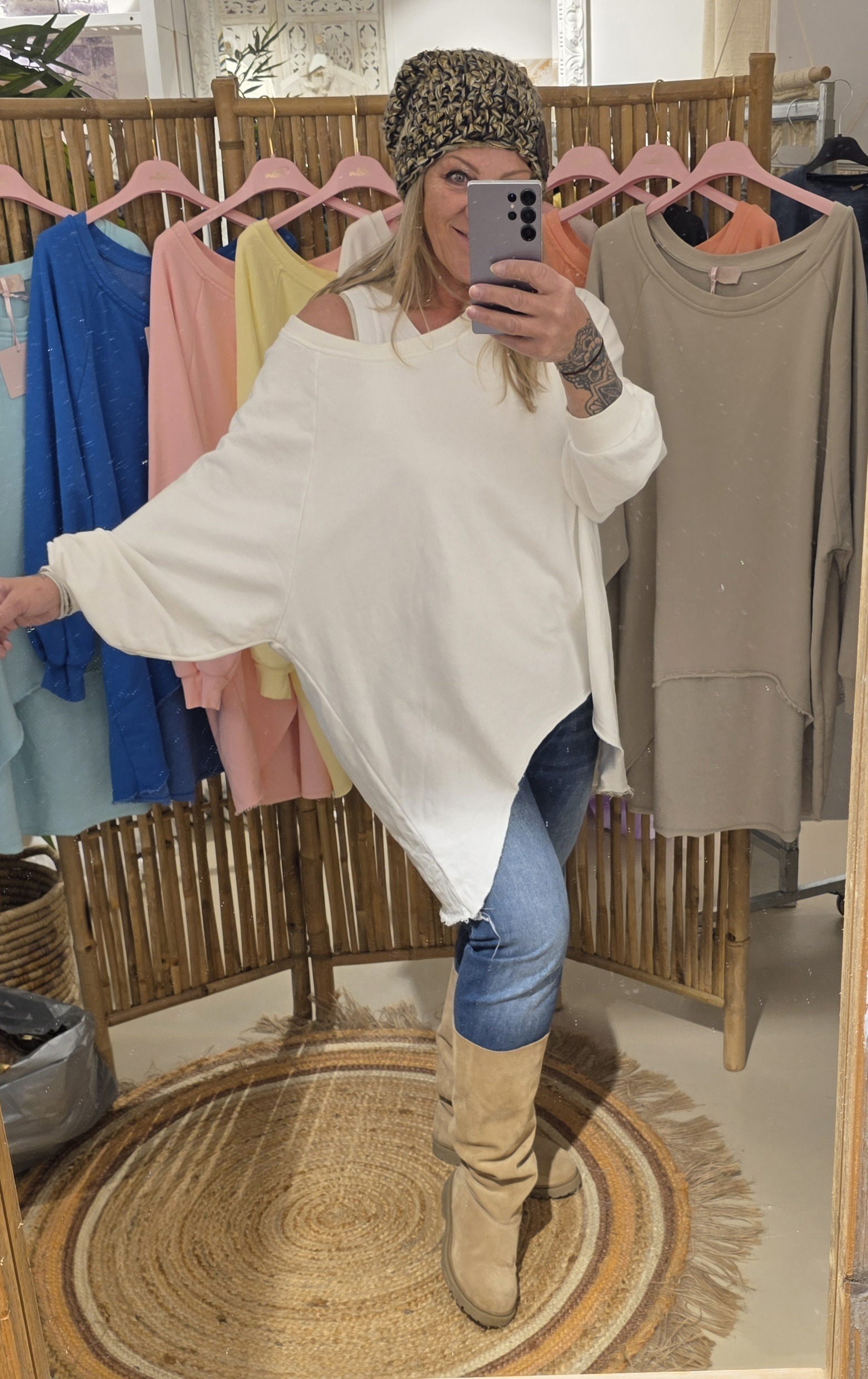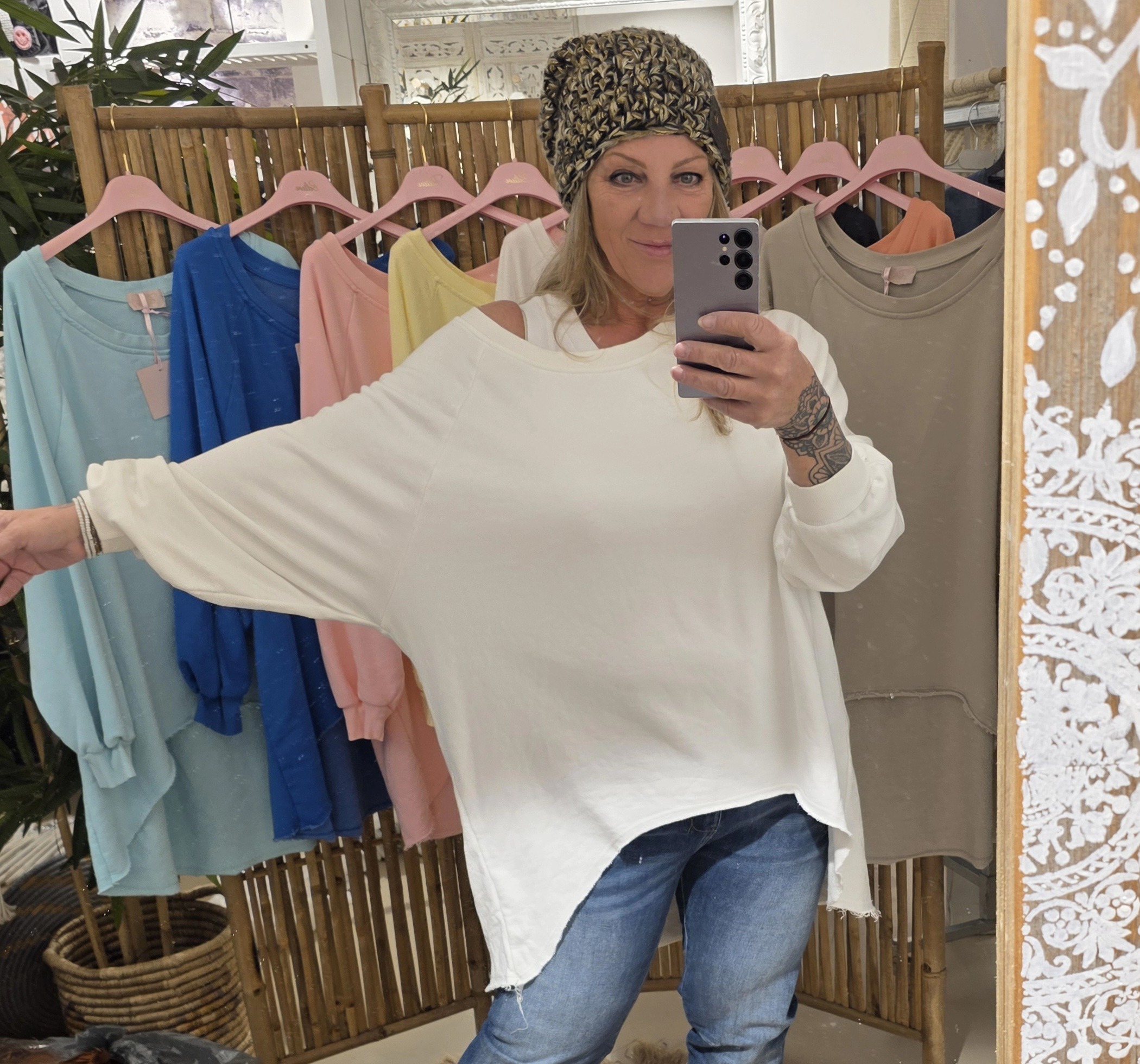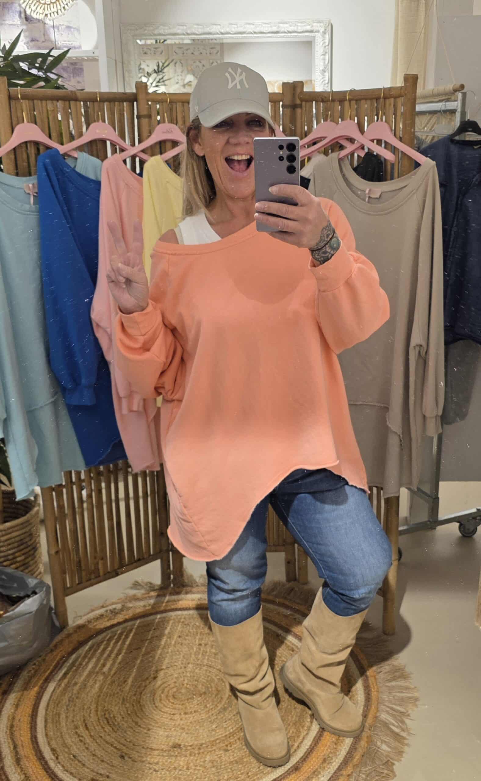 Geheel natuurlijk materiaal deze oversized off shoulder sweater, de voorzijde is rond loopt korter als de achterzijde voor een slankogend effect, deze stoere sweater kun je off shoulder dragen, super trendy én stoer, één maat!