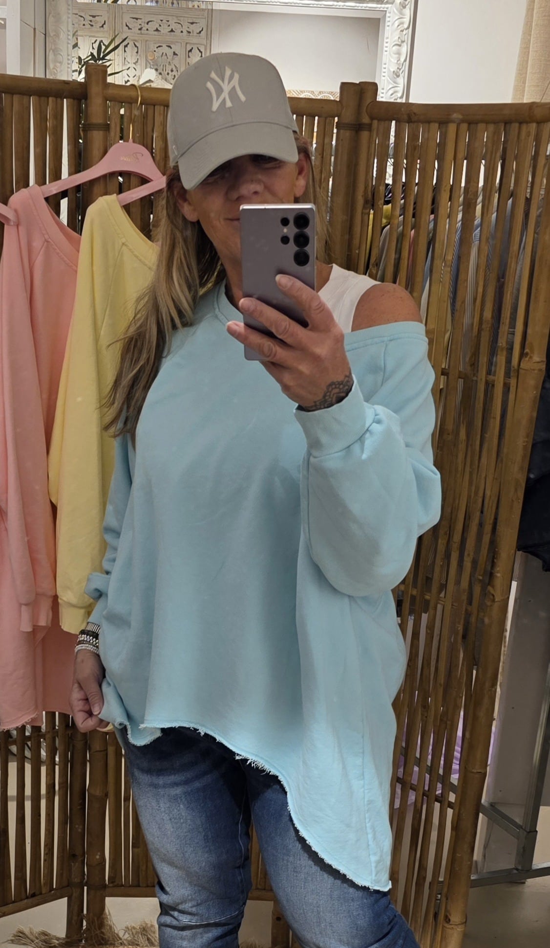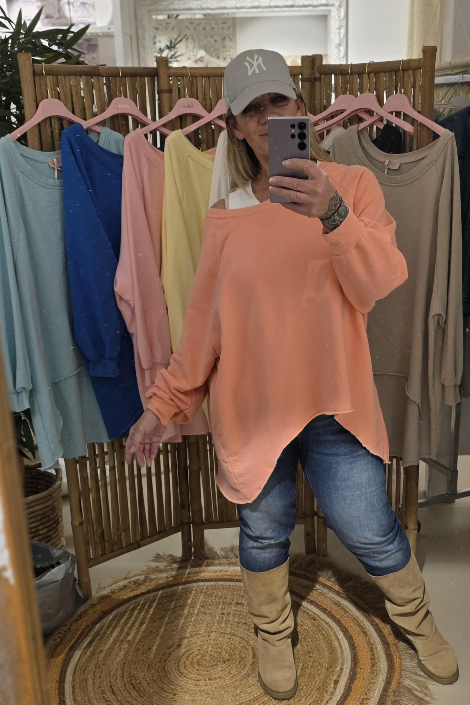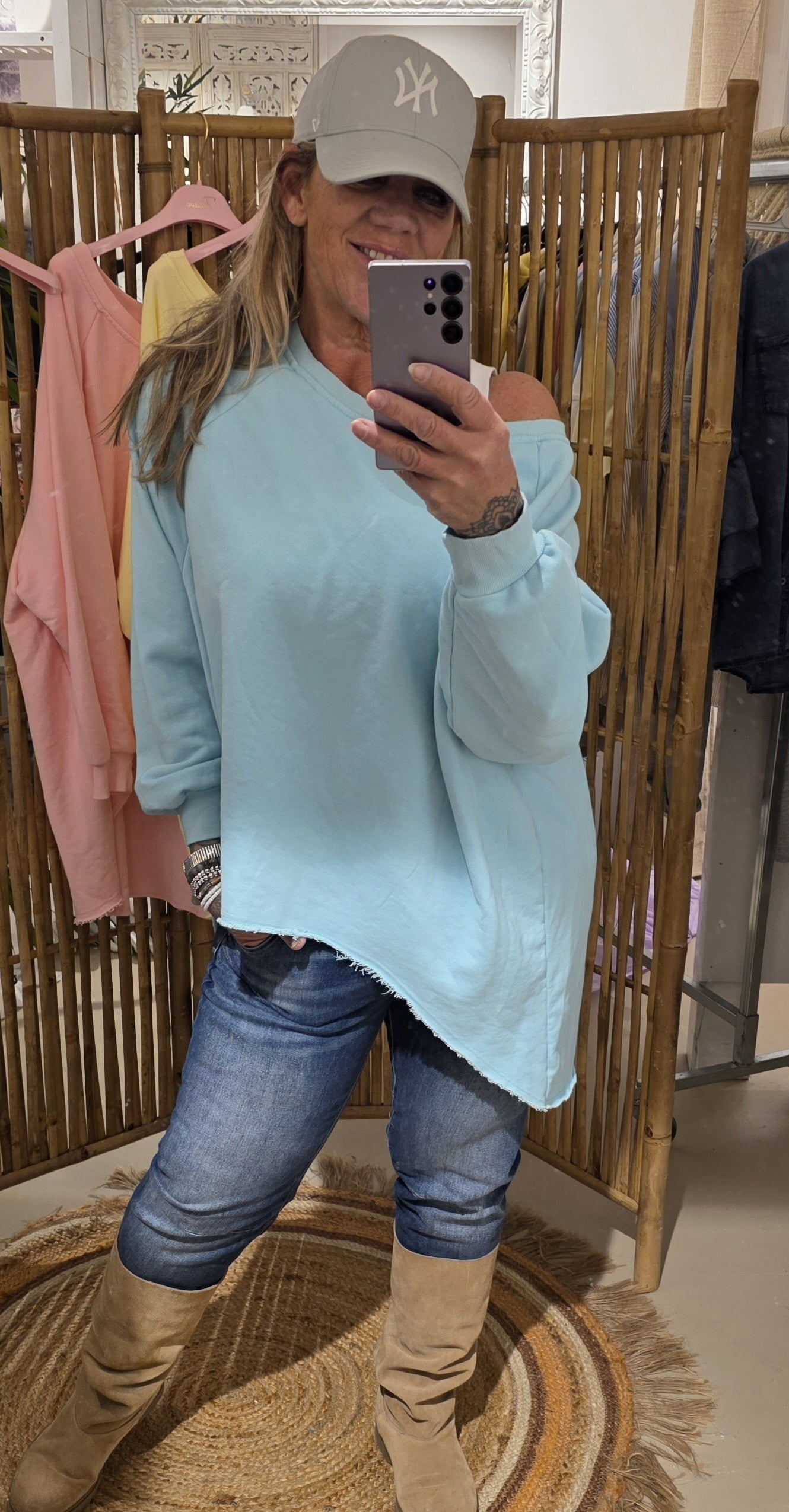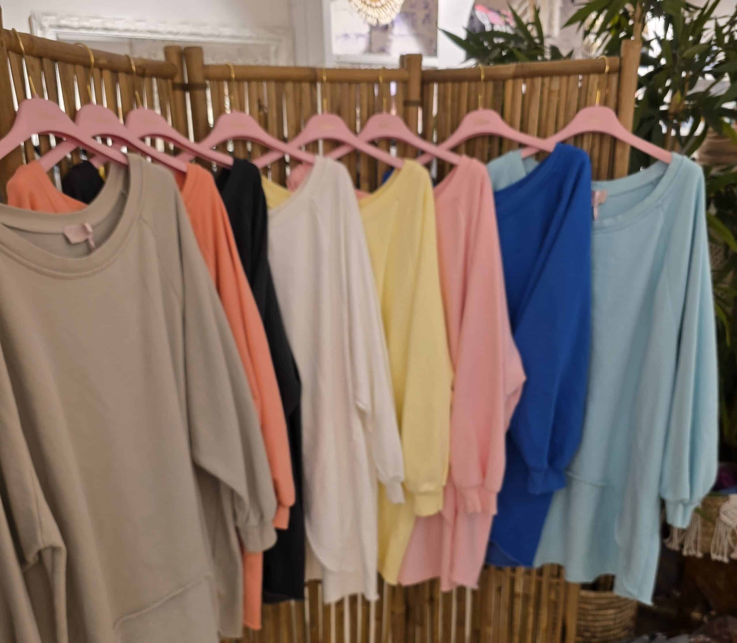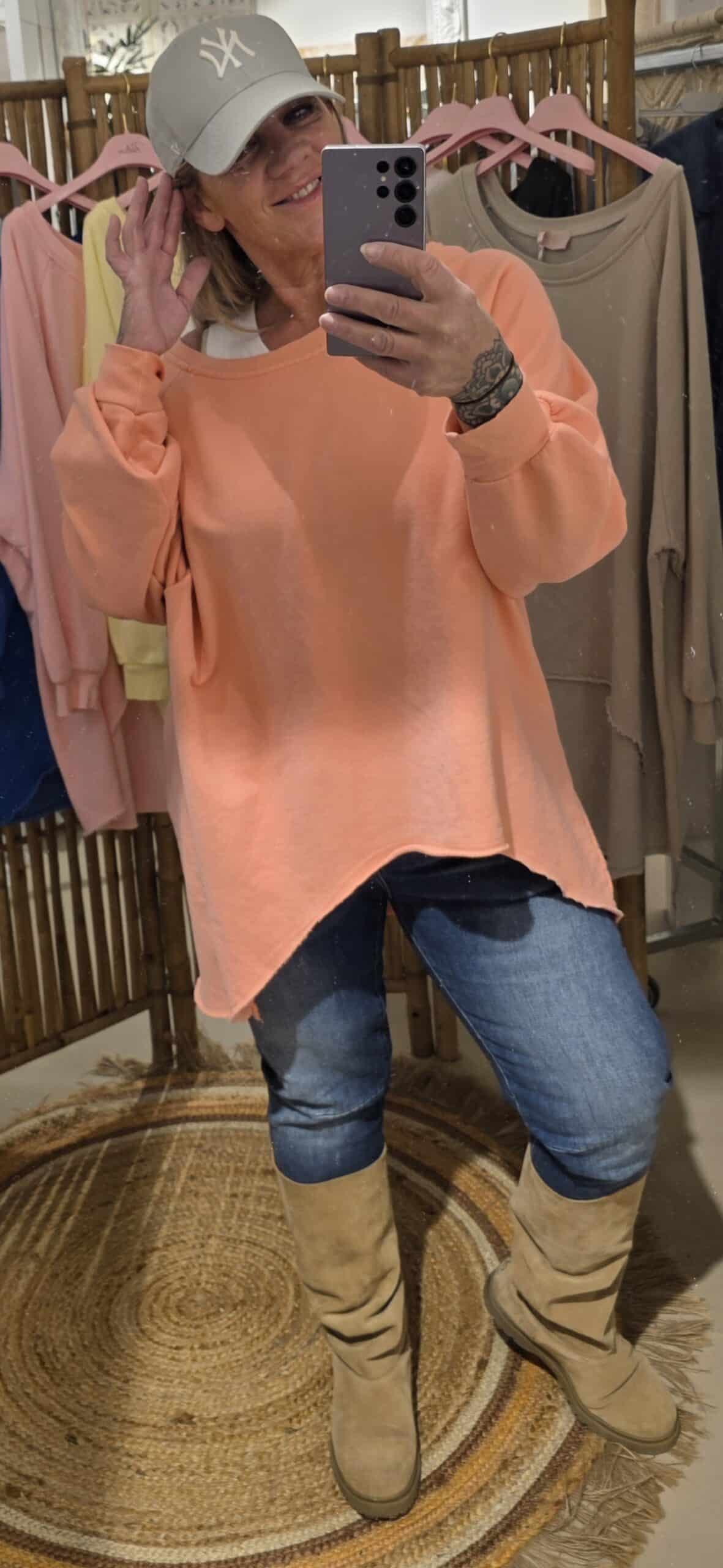 Geheel natuurlijk materiaal deze oversized off shoulder sweater, de voorzijde is rond loopt korter als de achterzijde voor een slankogend effect, deze stoere sweater kun je off shoulder dragen, super trendy én stoer, één maat!