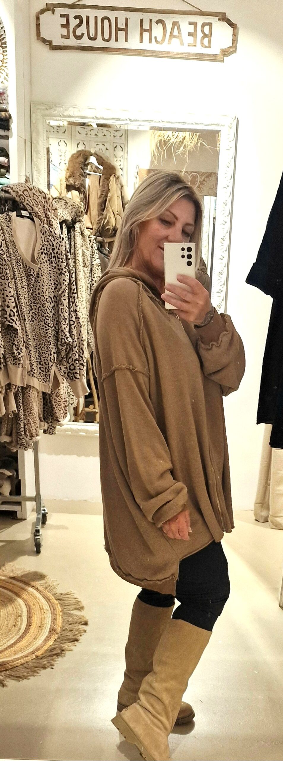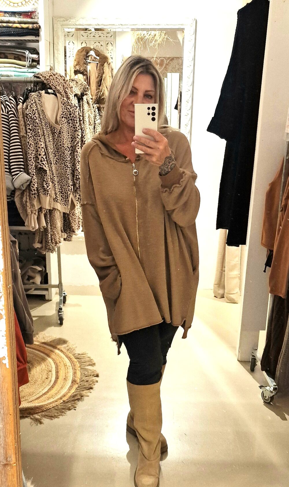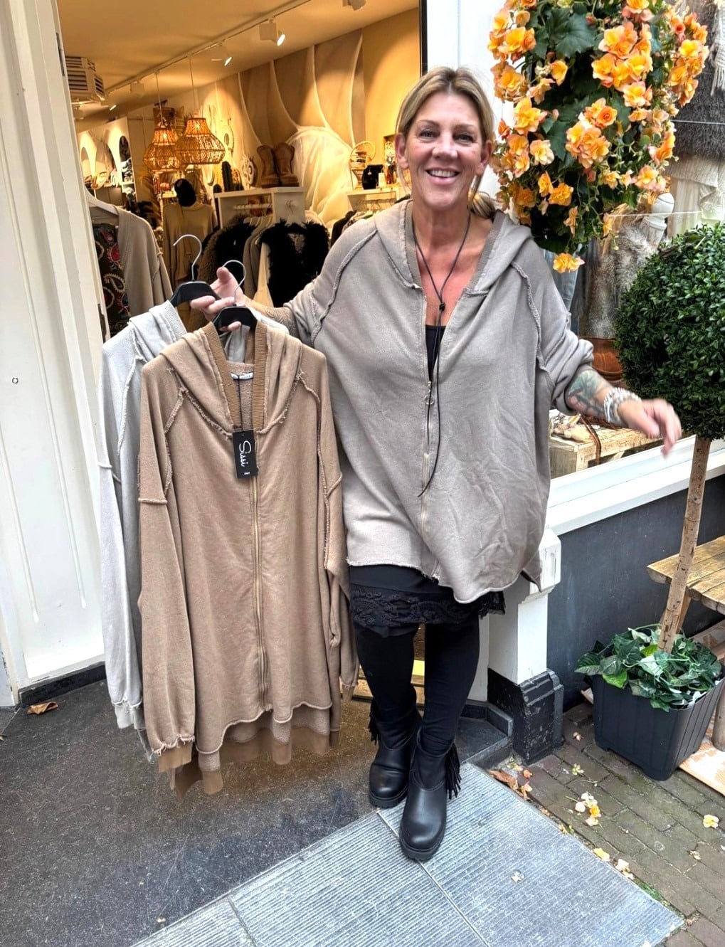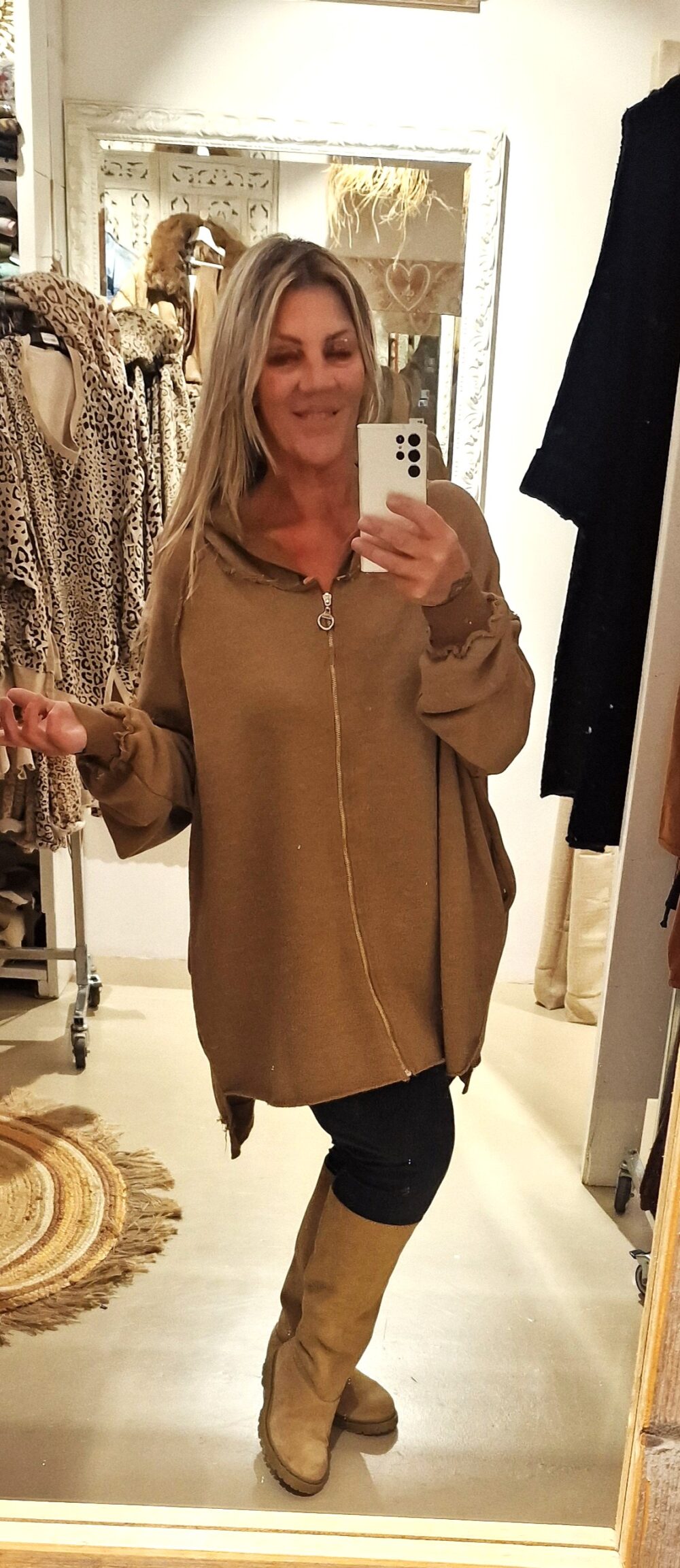Weer van dat mooie natuurlijke materiaal, model hoody met rits en capuchon, maar dan heel oversized, erg trendy
