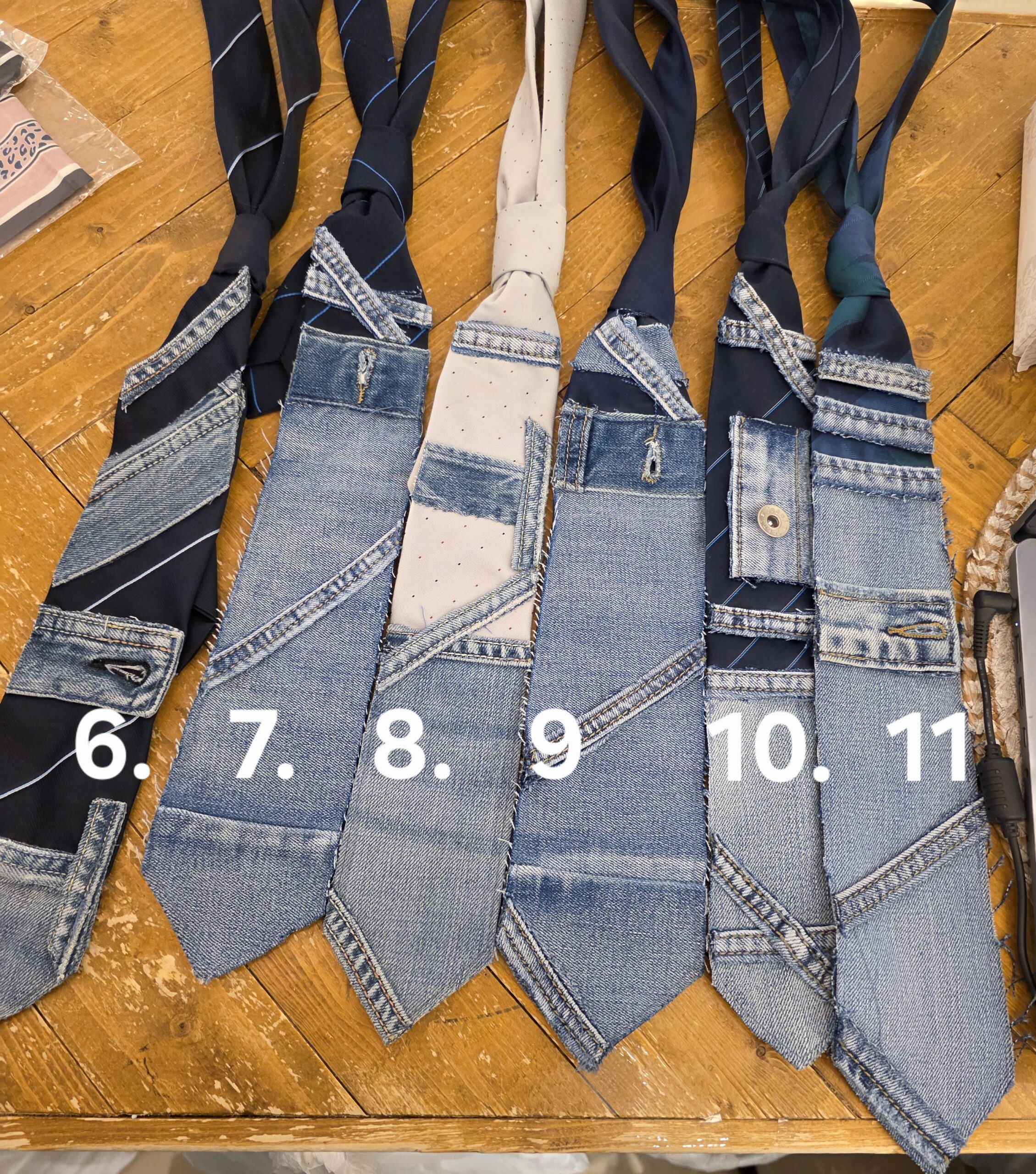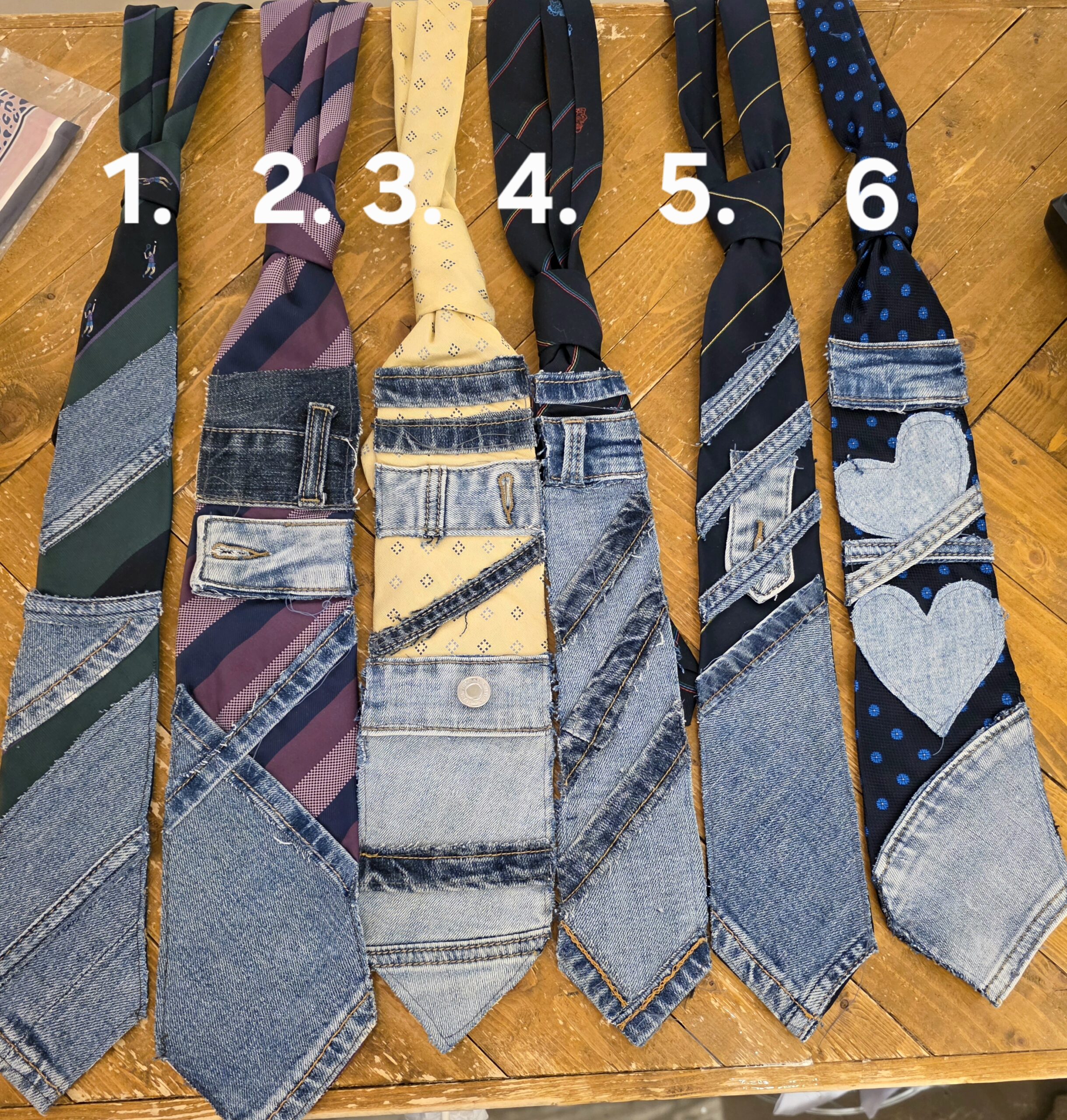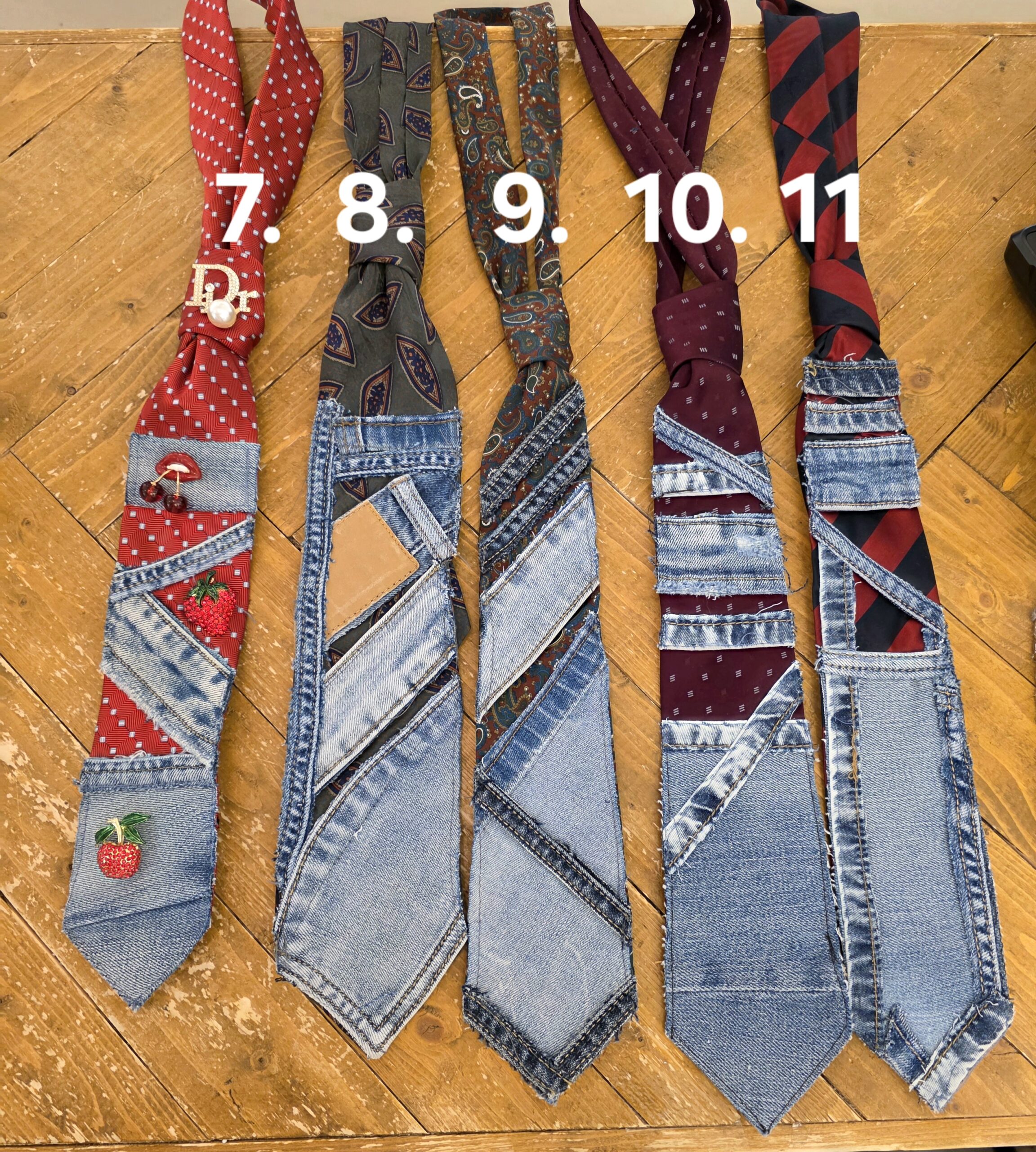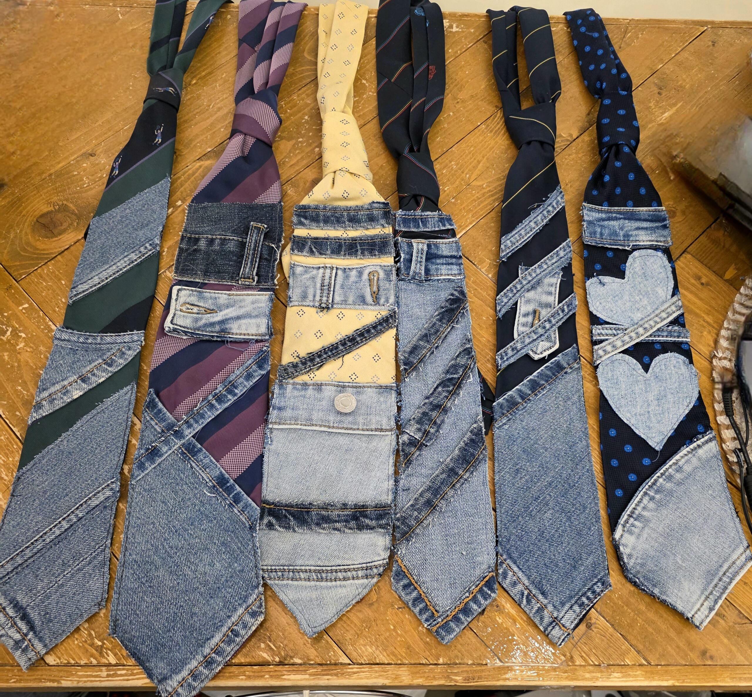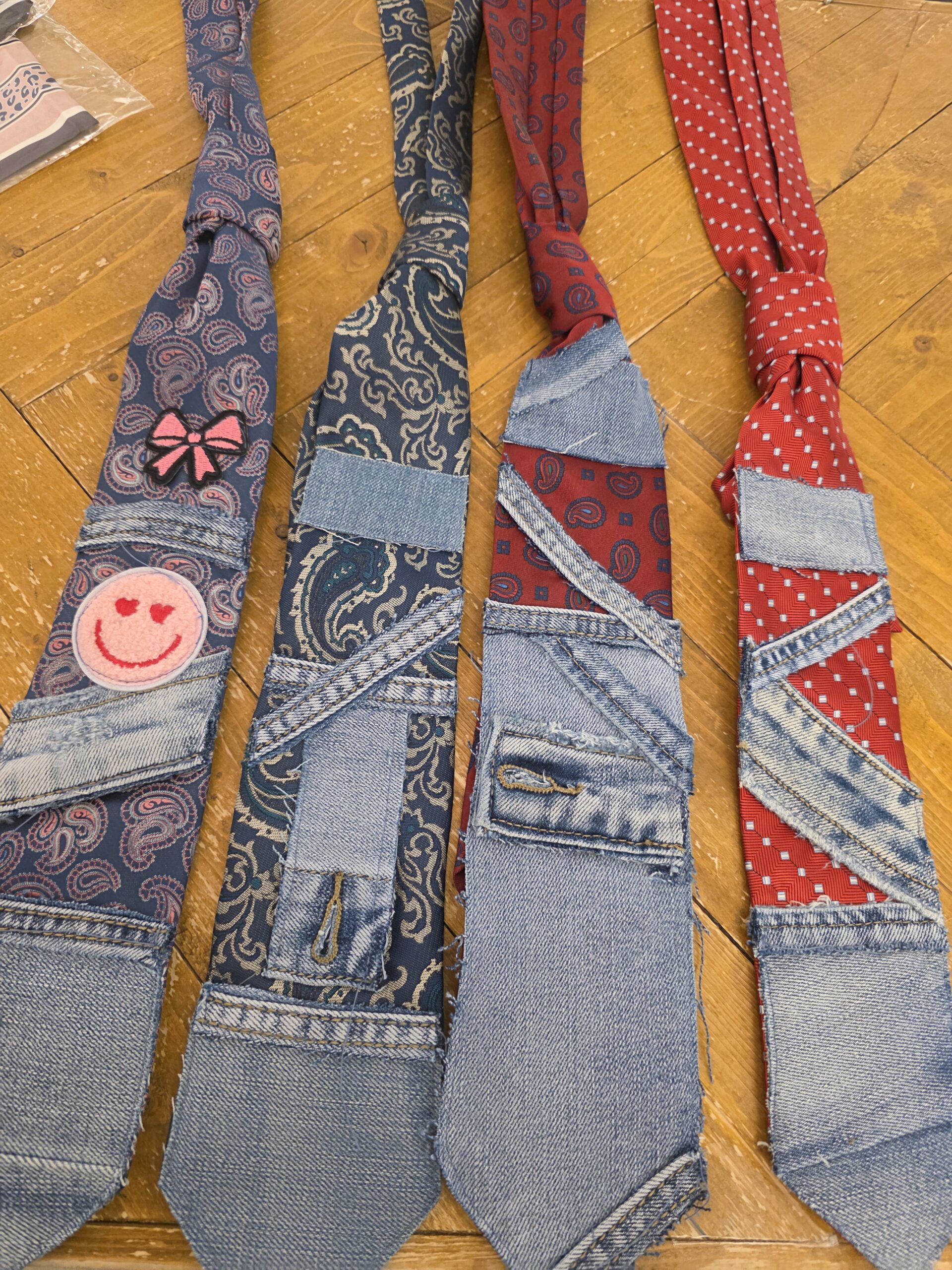 Bewerkte stropdassen met jeans, super leuk om ze zelf af te stylen met broches én kettinkjes, allemaal handwerk, van iedere stropdas is er maar één!